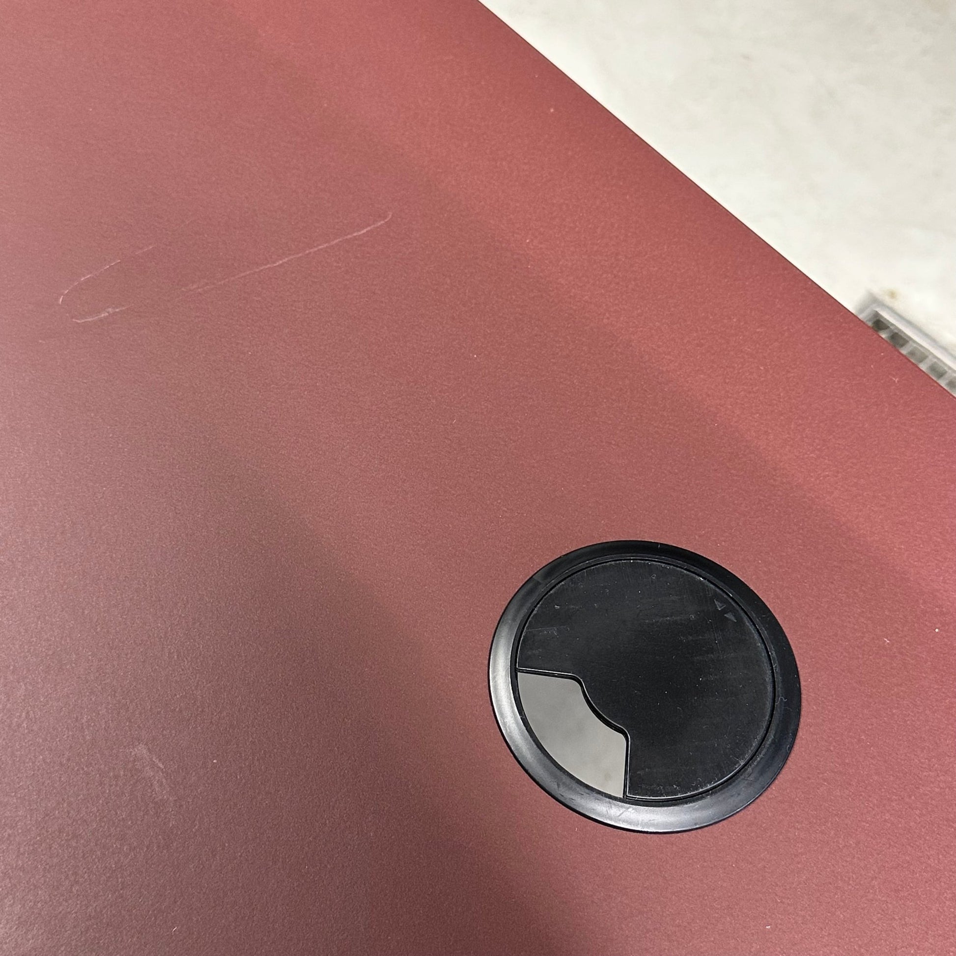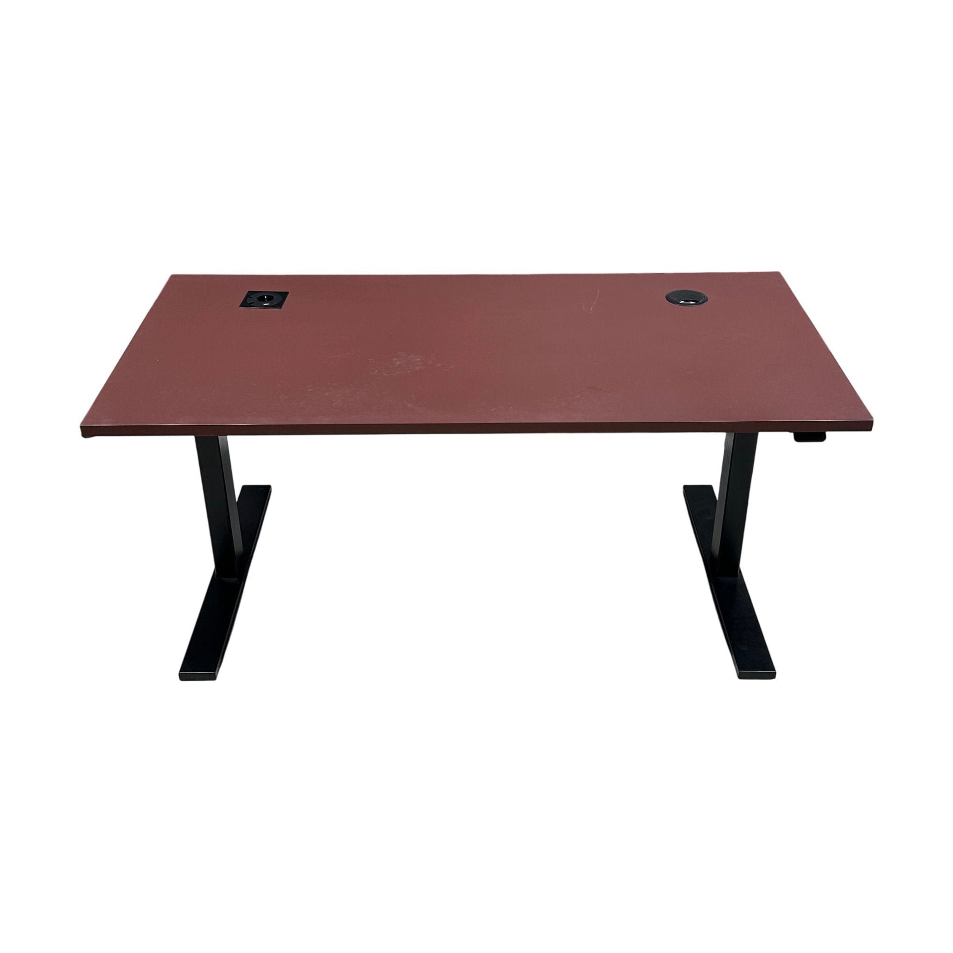 Elektrisk hev/senk skrivebord i en attraktiv rød farge, utstyrt med en praktisk powerdot med USB og strømforsyning, samt kabelhull for effektiv kabelføring. Bordet har en solid og funksjonell design som gjør det enkelt å tilpasse høyden til både sittende og stående arbeid.