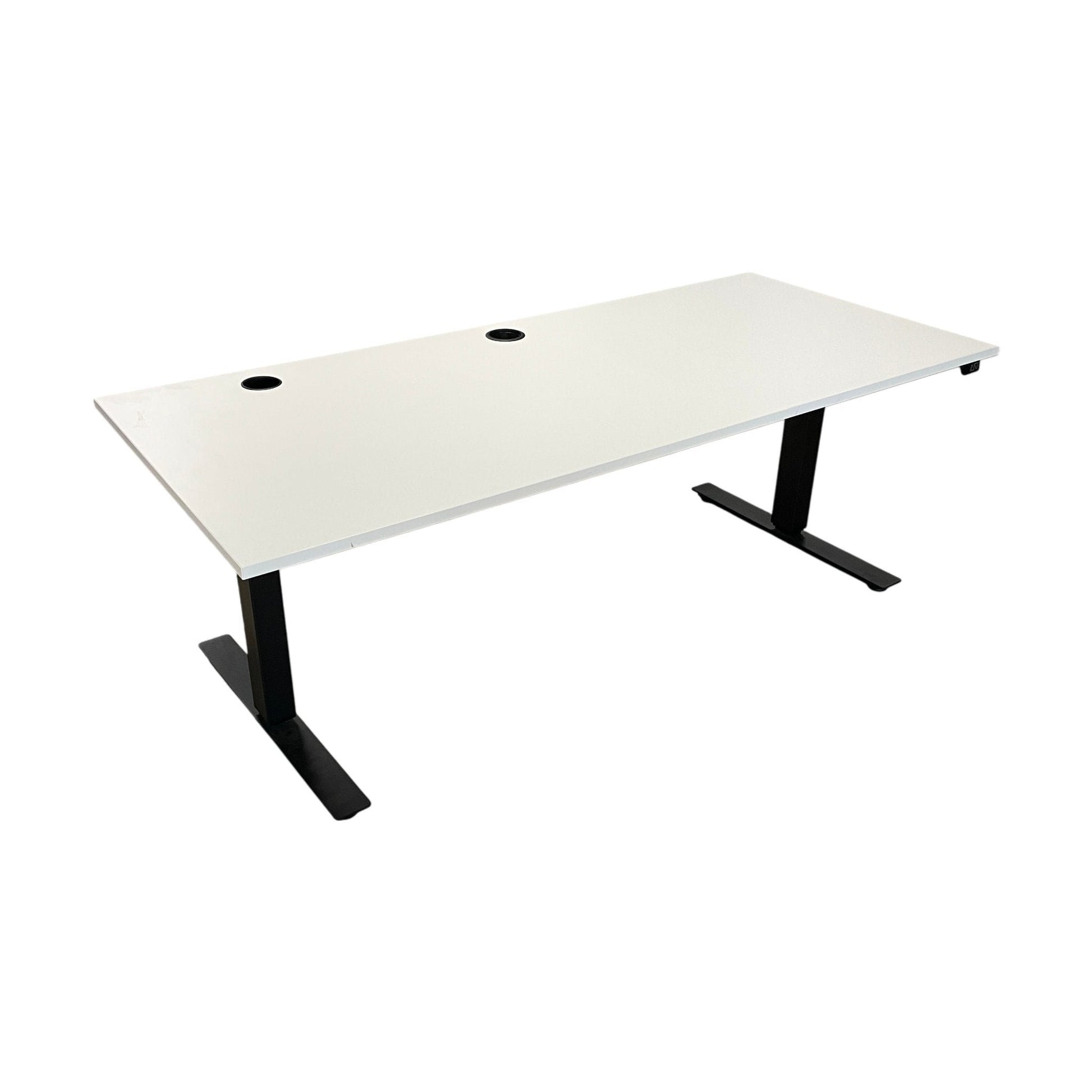 Elektrisk hev/senk skrivebord med en stilren hvit bordplate og solide svarte bein, designet for moderne kontormiljøer. Bordet er utstyrt med powerdot for enkel tilkobling av elektroniske enheter, og leveres ferdig montert for rask bruk. Den generøse størrelsen på 180x80 cm gir deg god plass til arbeidsutstyr og forbedrer arbeidsflyten.