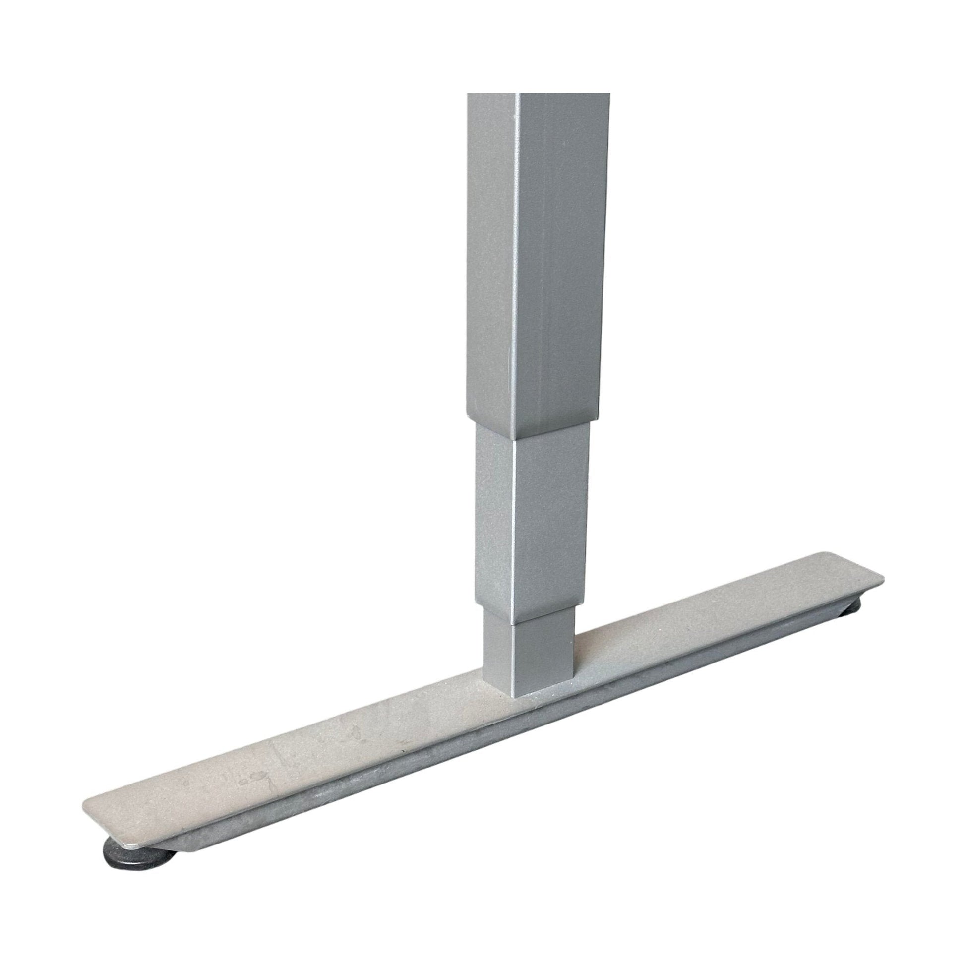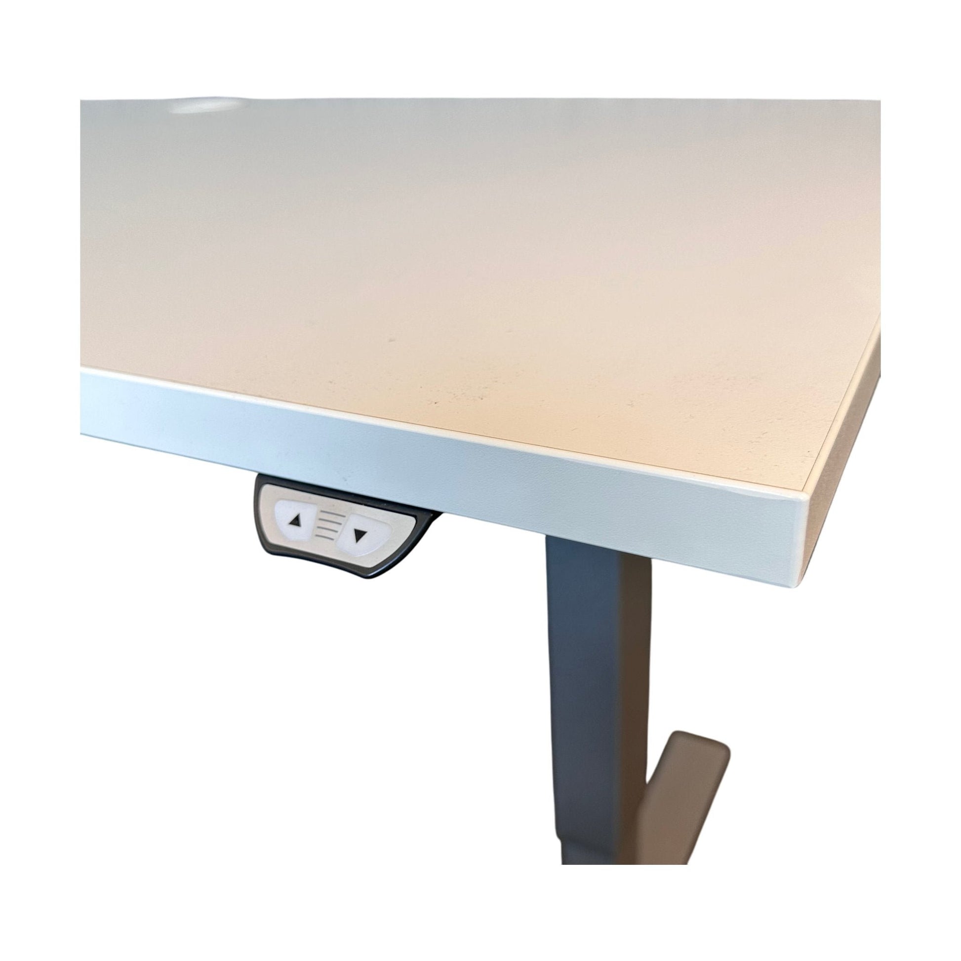 Elektrisk hev/senk skrivebord med hvit bordplate og et stilrent mørk grått understell. Dette skrivebordet gir deg muligheten til å variere mellom sittende og stående arbeid, noe som bidrar til økt komfort og bedre arbeidsstilling.