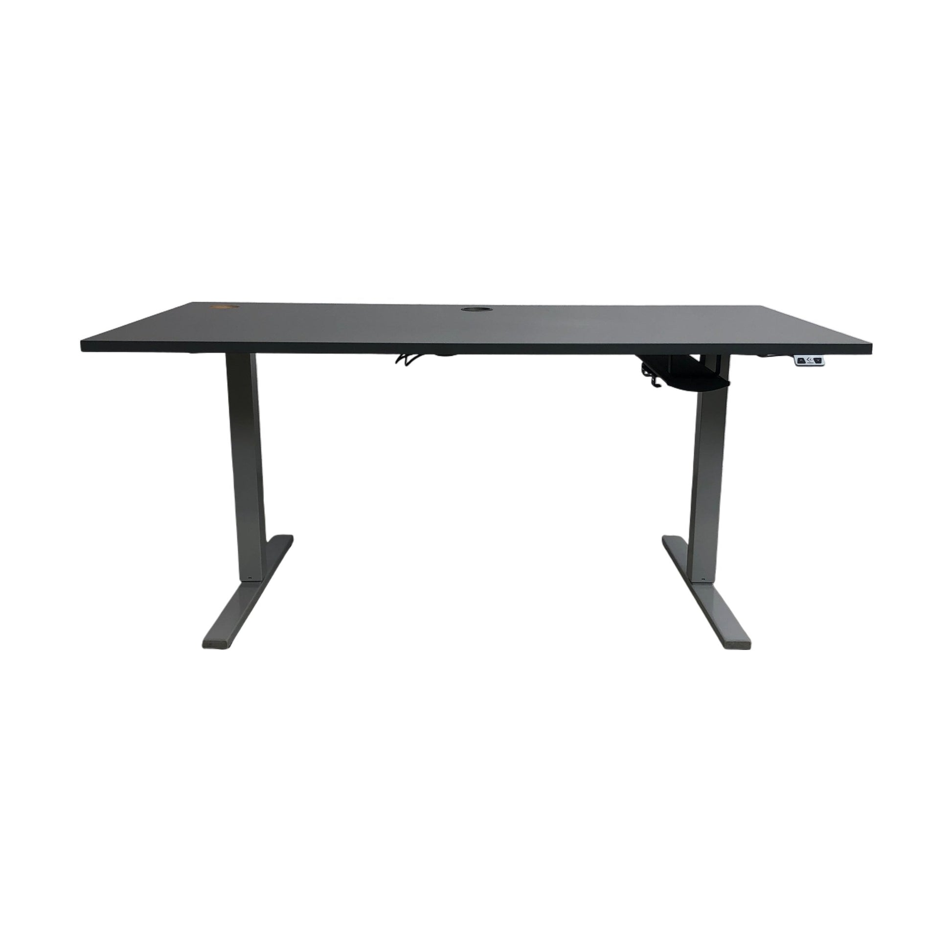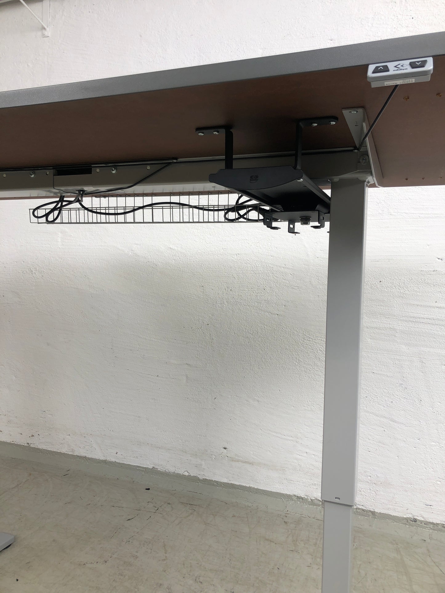 Det elektriske hev/senk-skrivebordet har en stilren grå bordflate og er utstyrt med kabelkurv samt en praktisk oppheng for datamaskinen på undersiden. Ideelt for å skape en effektiv og organisert arbeidsplass.