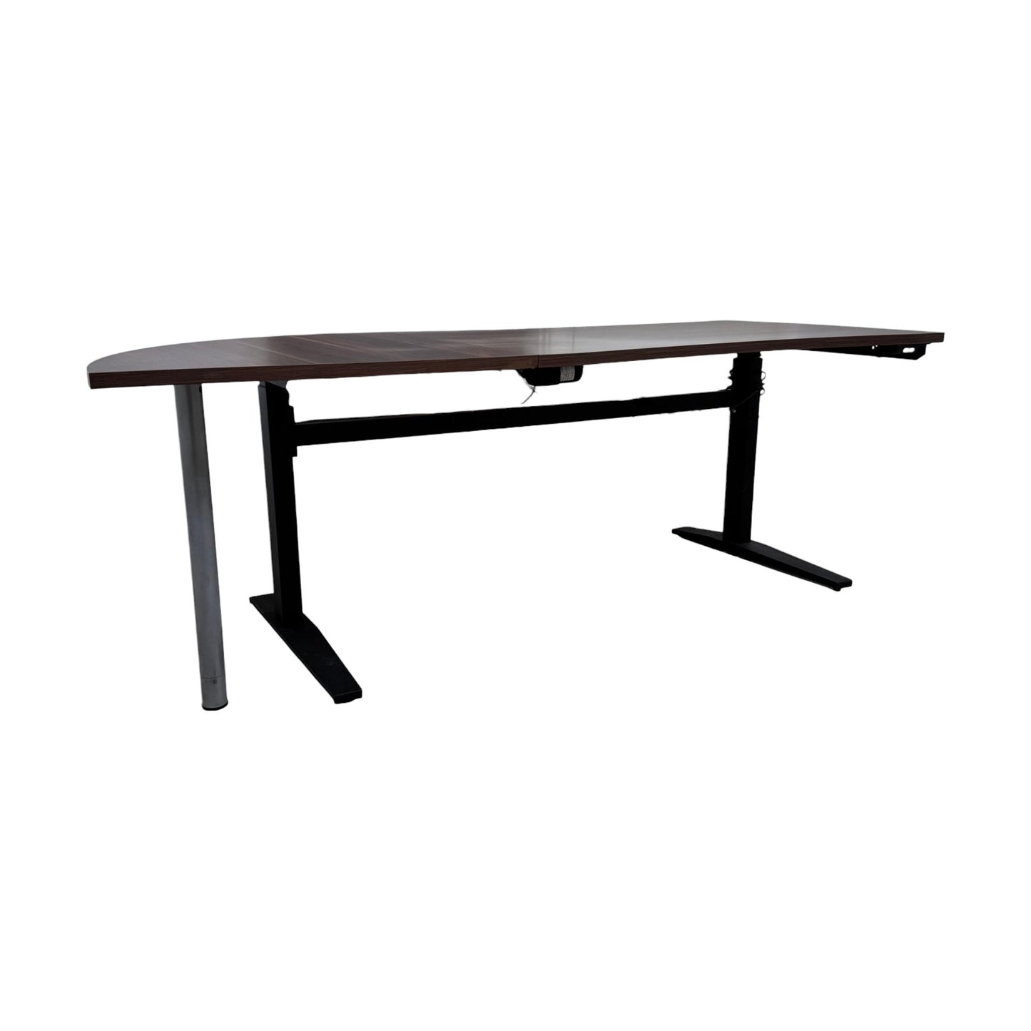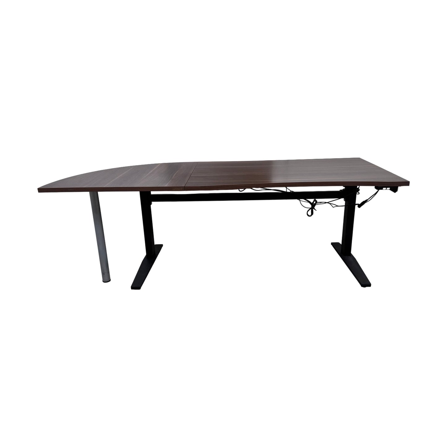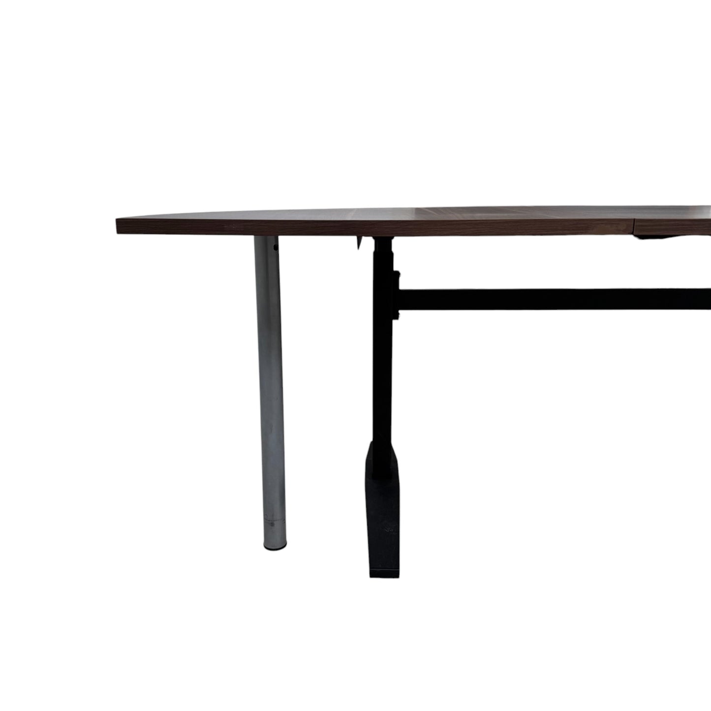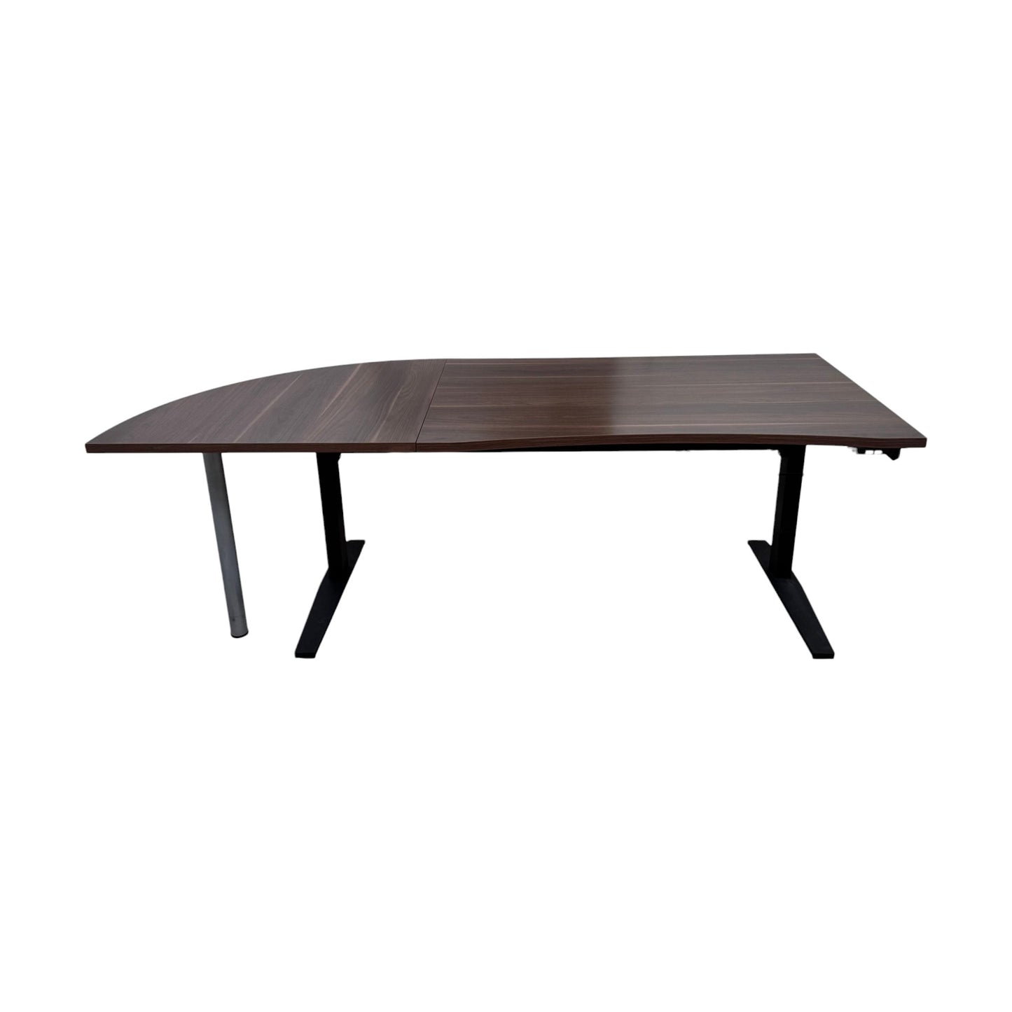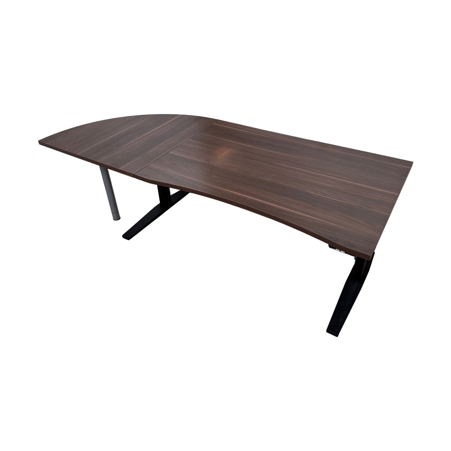 Skrivebordet har noen mindre riper på overflaten, men dette påvirker ikke funksjonaliteten. Den justerbare høyden forblir en verdifull funksjon som vil bli satt stor pris på i din daglige bruk. Merk at det sorte understellet er lengre enn punktet hvor skjøten til det avrundede hjørnet og er festet til begge bordplatene.