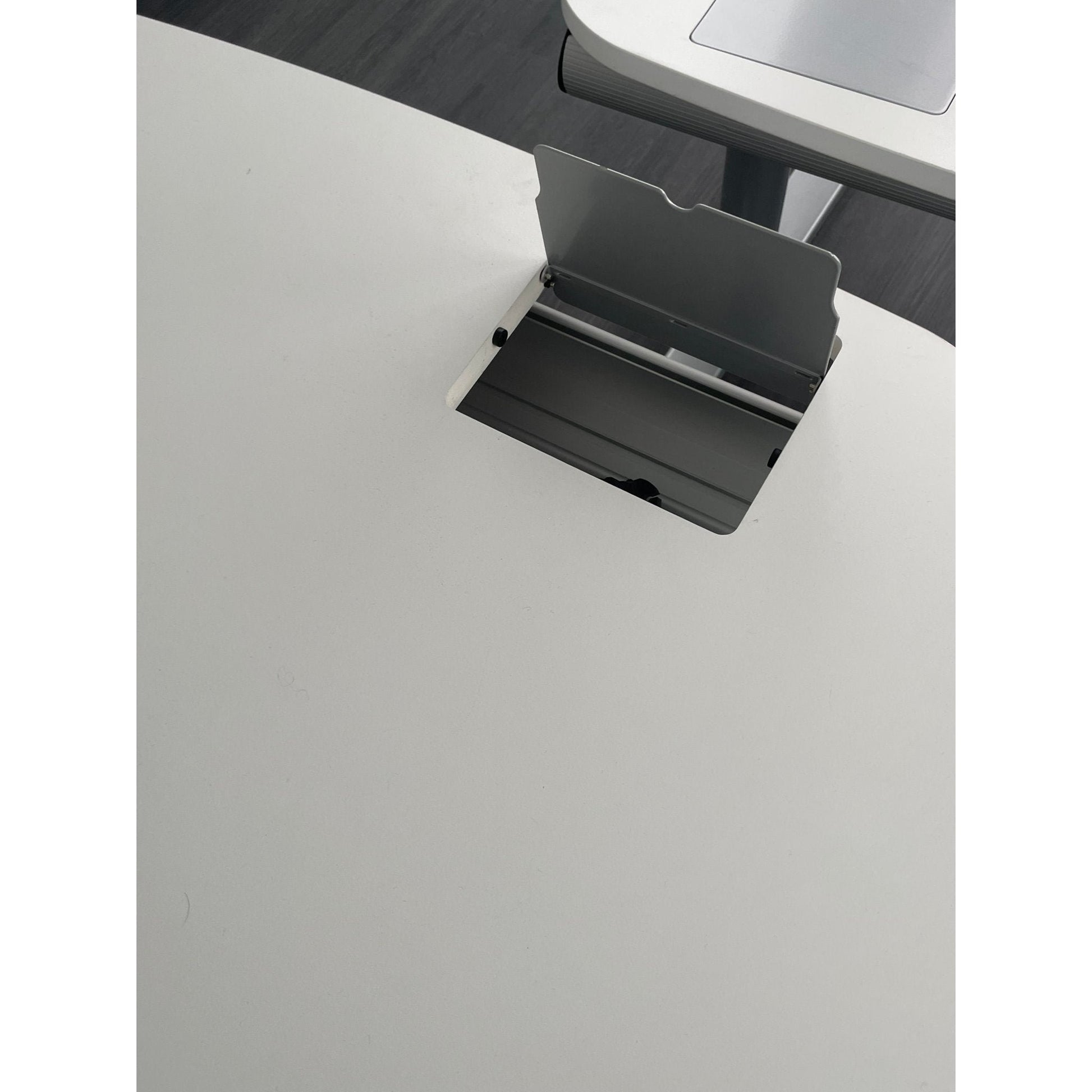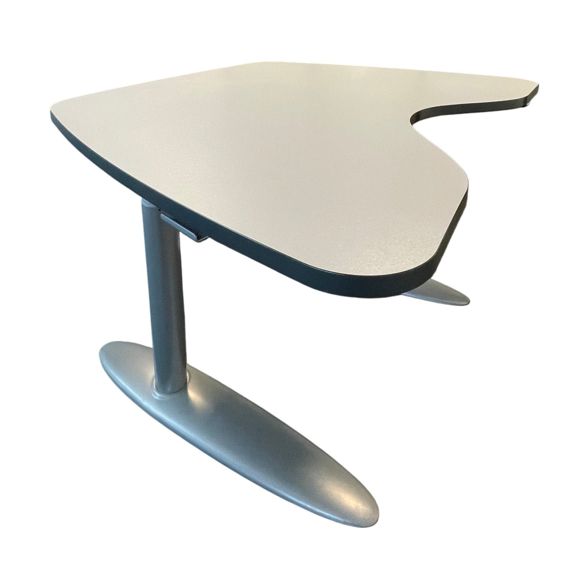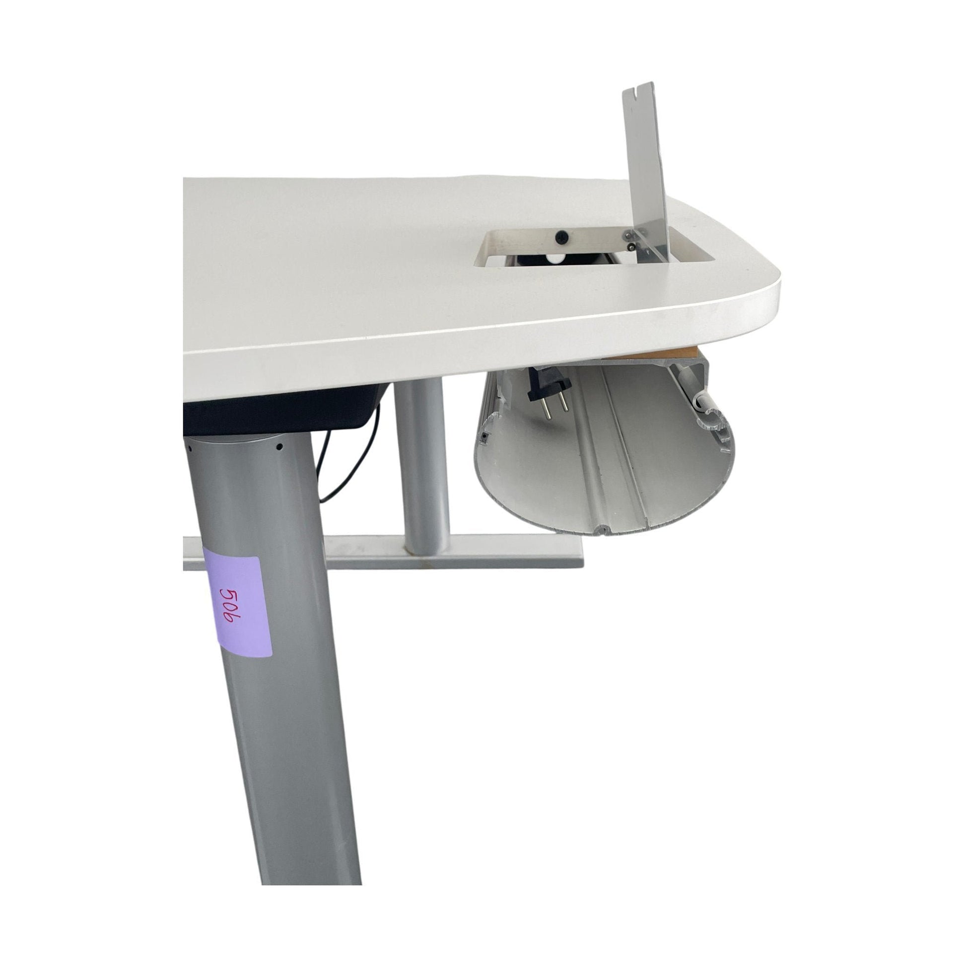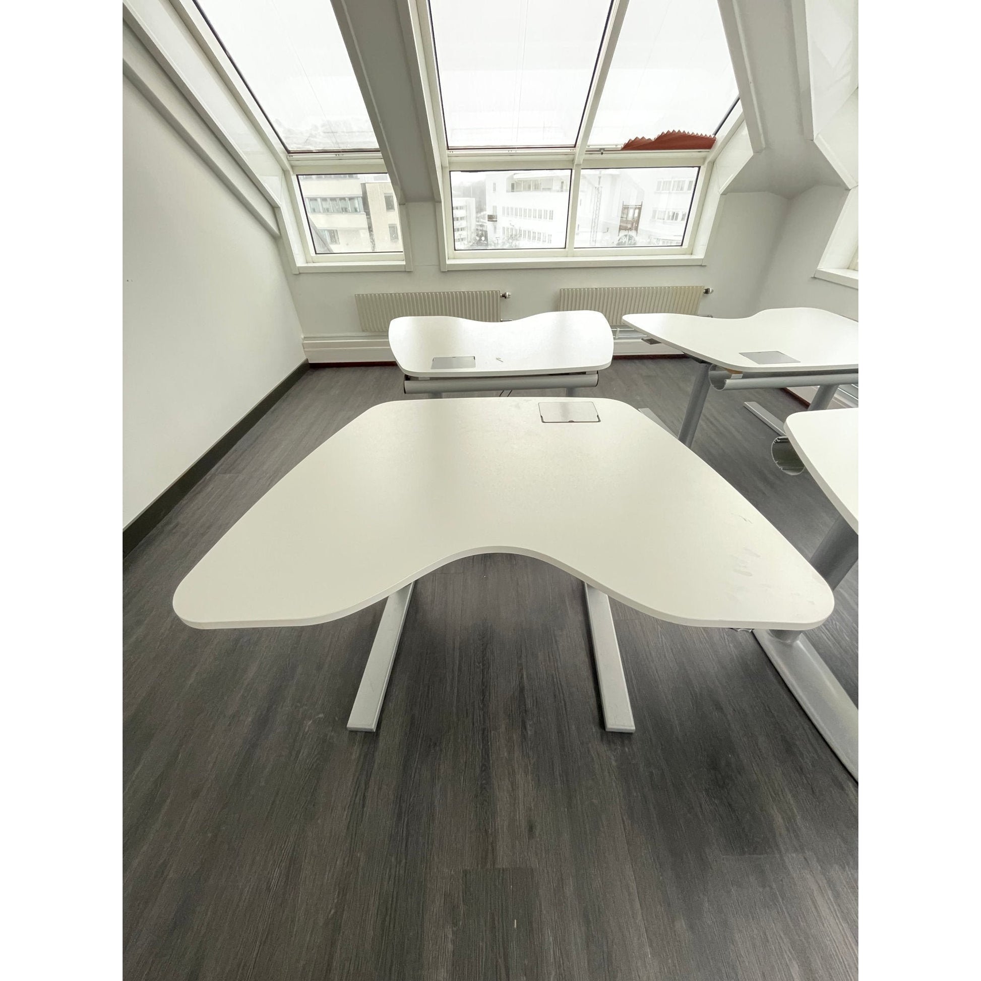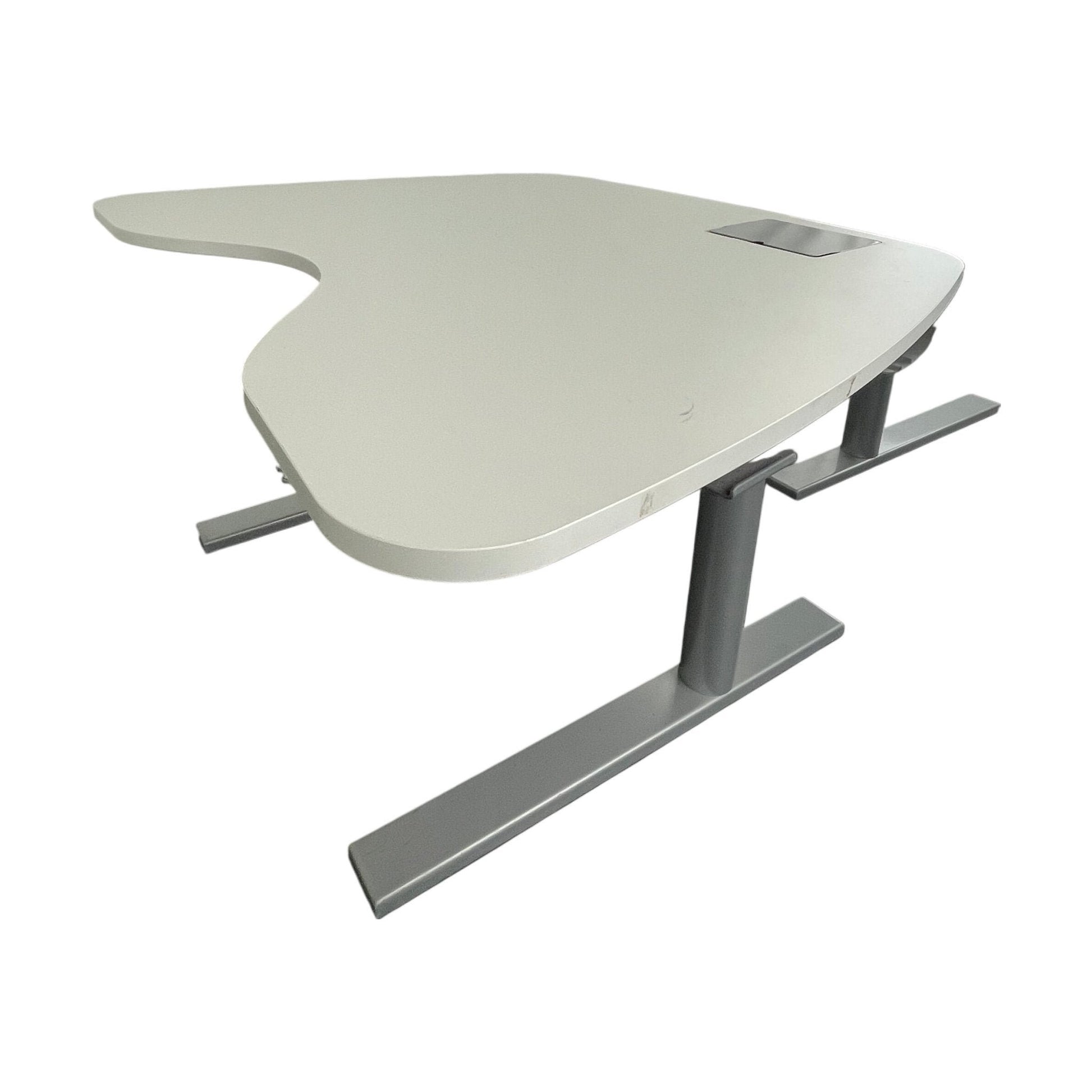 Dette elektriske hev/senk skrivebordet med en stilren hvit laminatbordplate har en innovativ magebue som gir komfortabel støtte mens du arbeider. Skrivebordet er designet for å tilpasse seg ulike arbeidsstillinger, og skaper et ergonomisk arbeidsmiljø. Den moderne formen og det enkle uttrykket gjør det lett å integrere i ethvert kontormiljø. Bordene har noen variasjoner i form av noe forskjell på understell, og farge på listen. Men helhetlig ser de like ut.