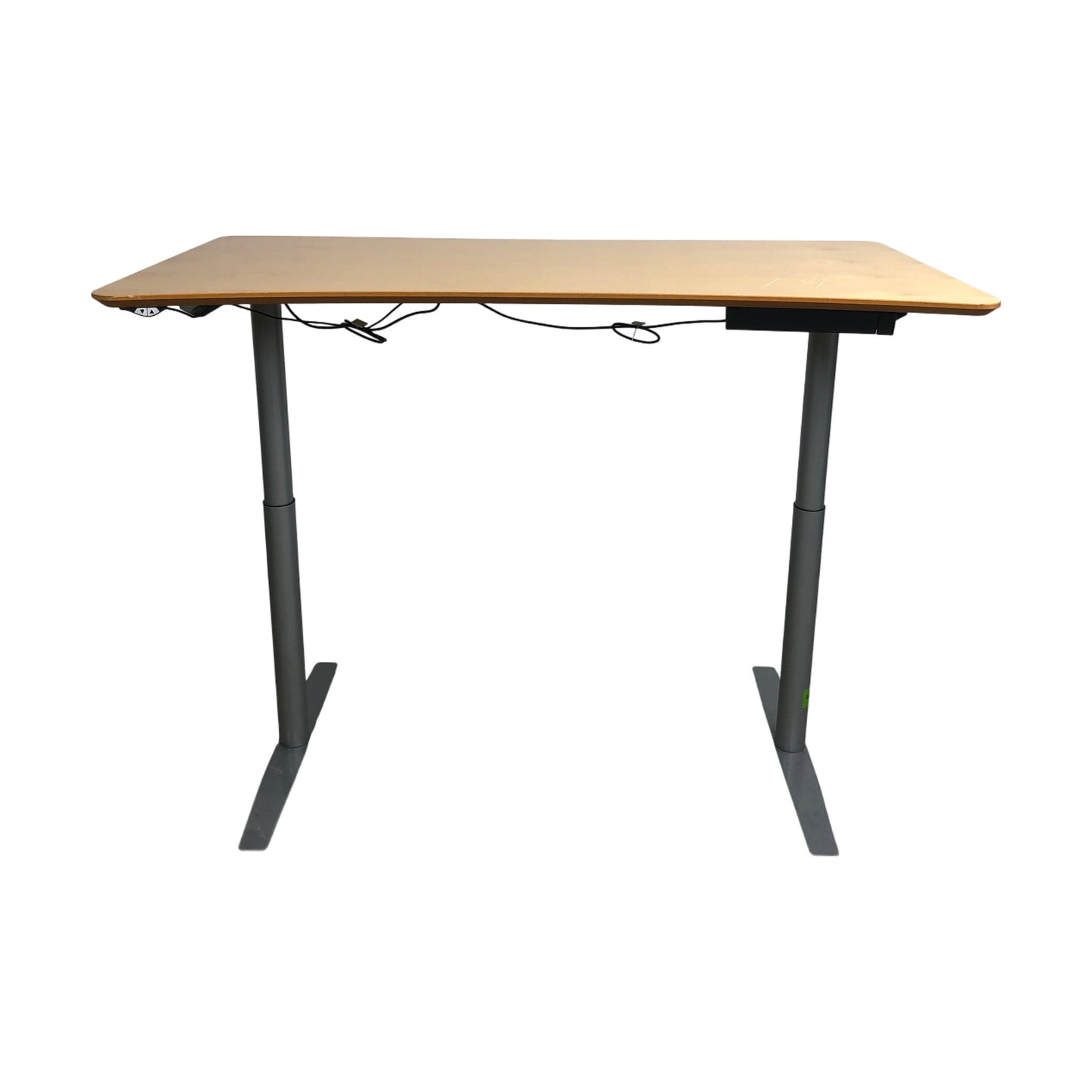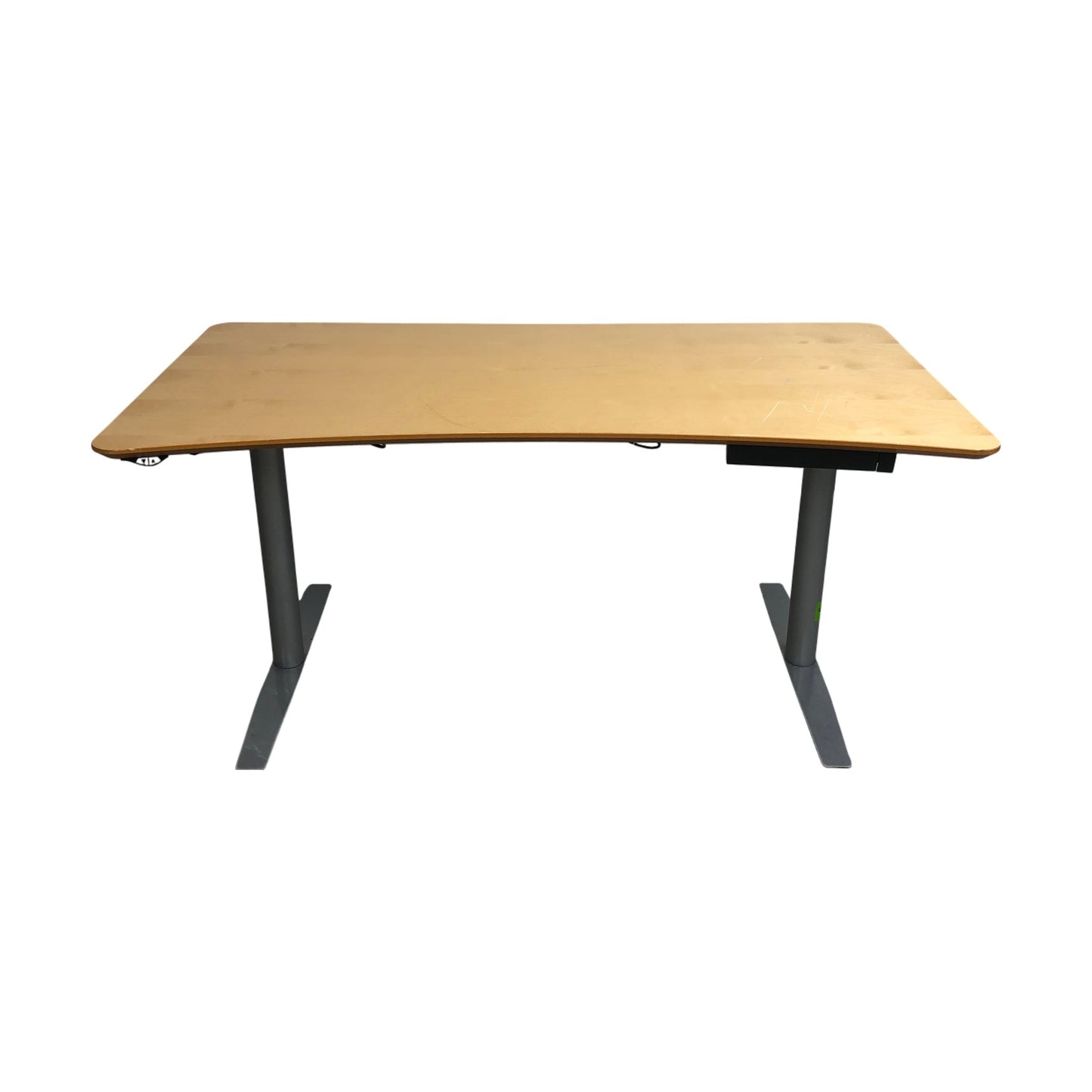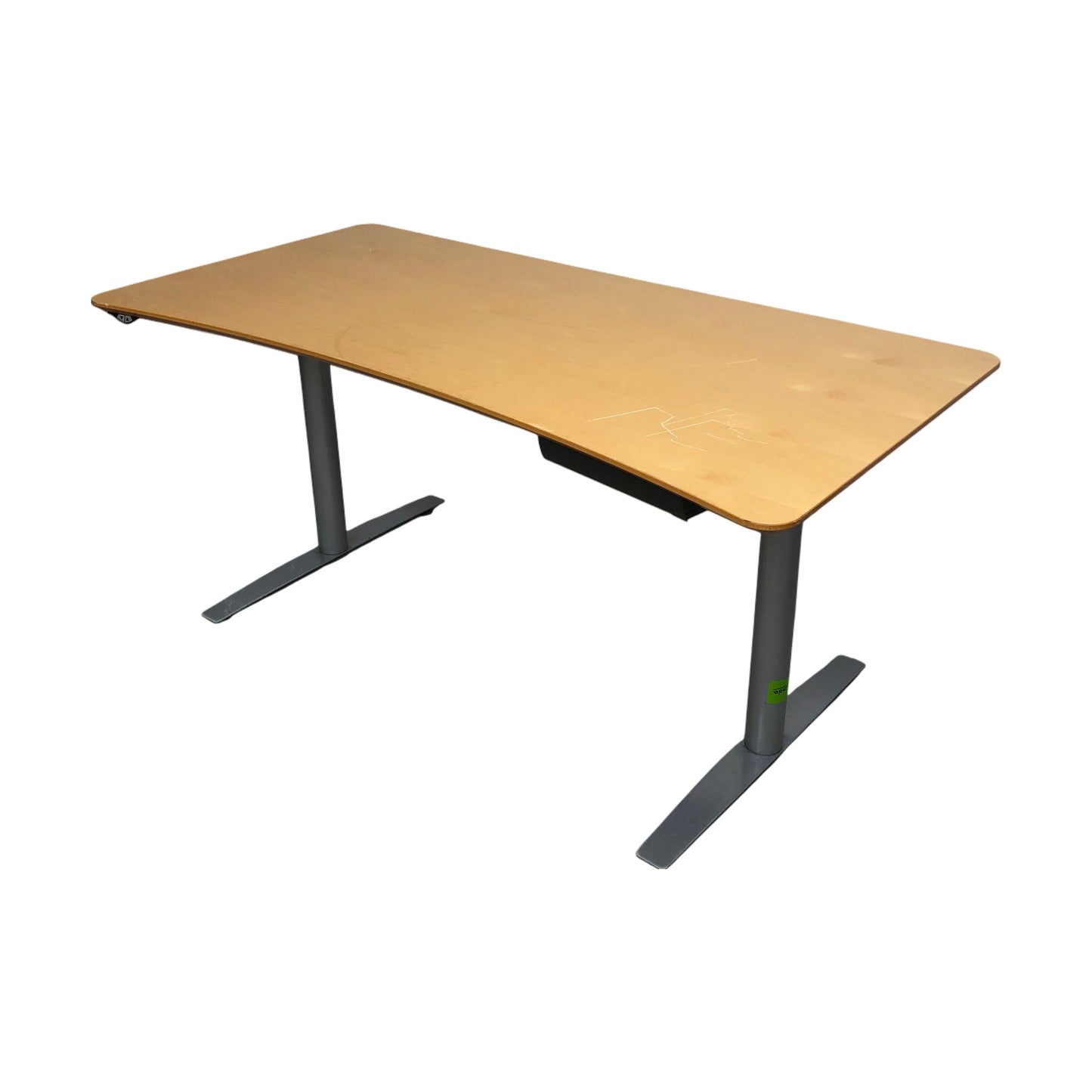 Elektrisk hev/senk skrivebord med magebue for høydejustering som tilpasser seg brukerens behov. Designet uten kabelkurv gir et minimalistisk utseende, samtidig som det er funksjonelt for variert arbeid.