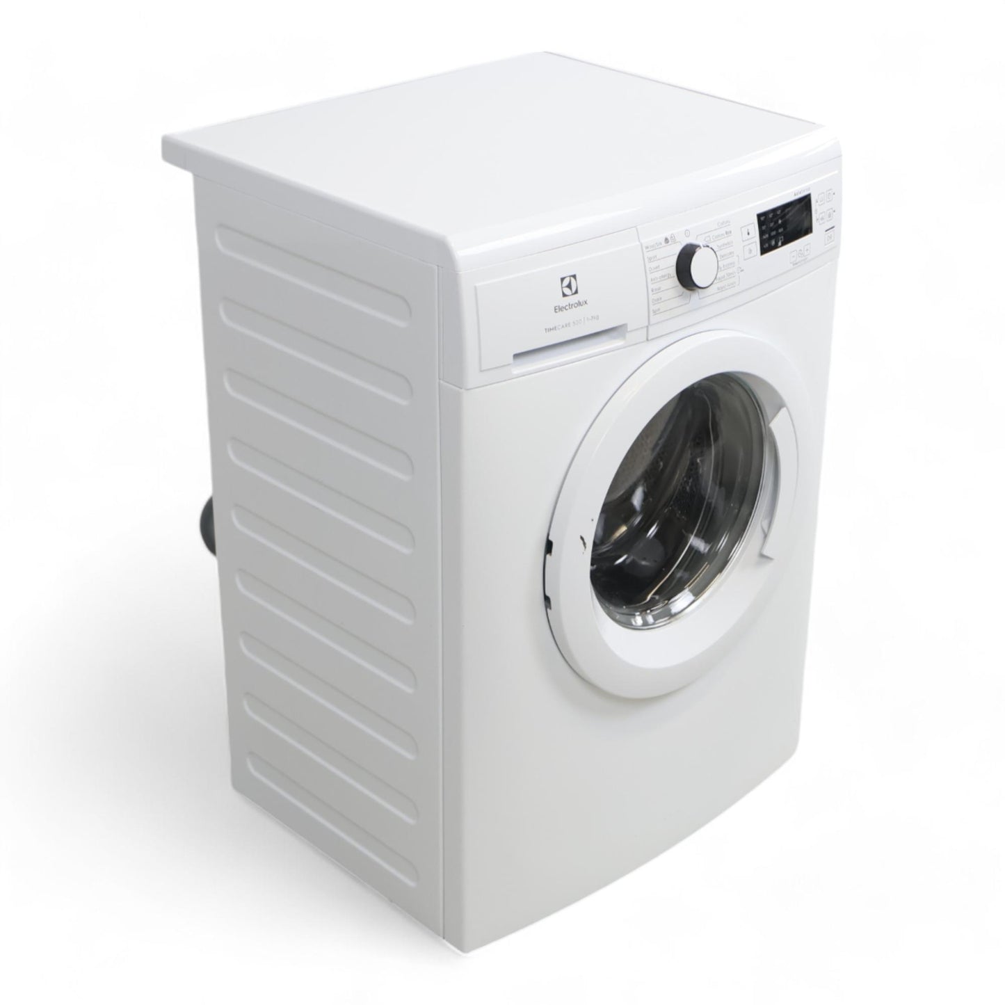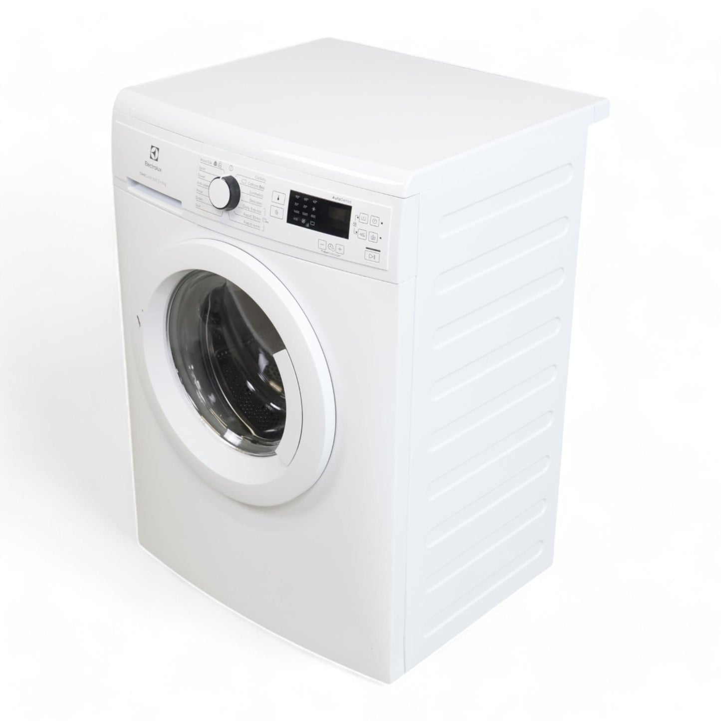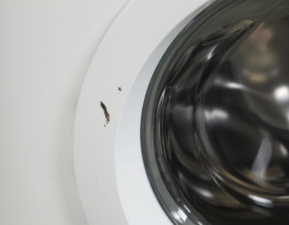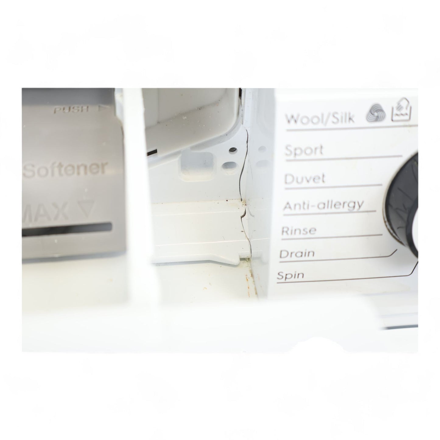 Vaskemaskinen har flere år igjen, men bærer med seg noen bruksmerker. Det er en ripe på døren og en liten sprekk bak luken til vaskemiddelet.