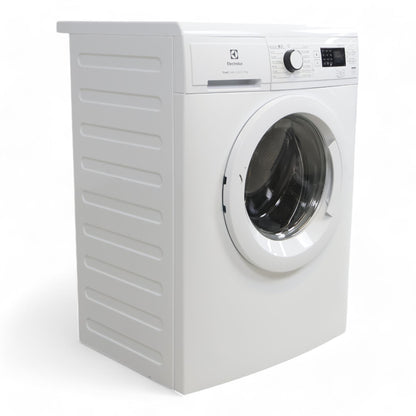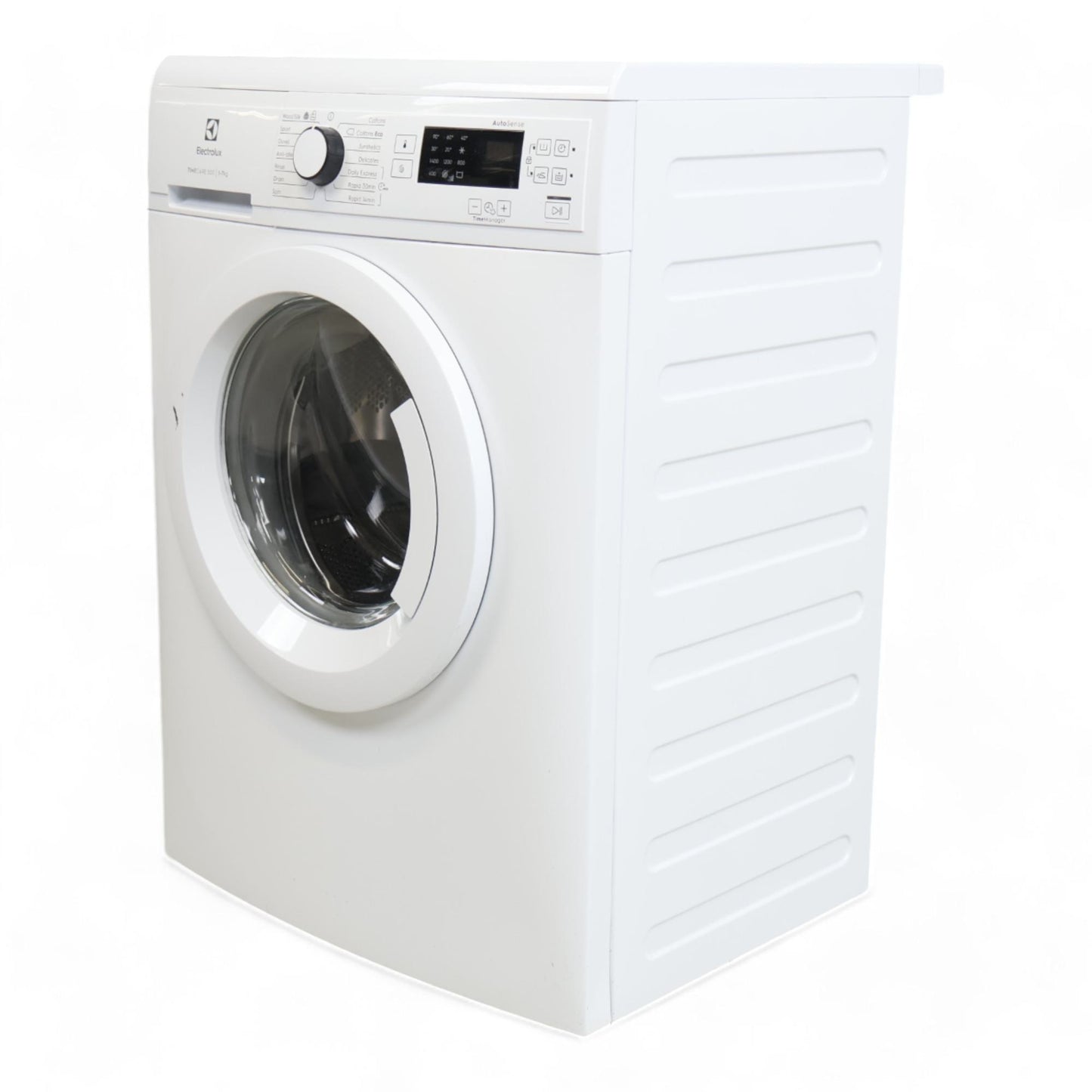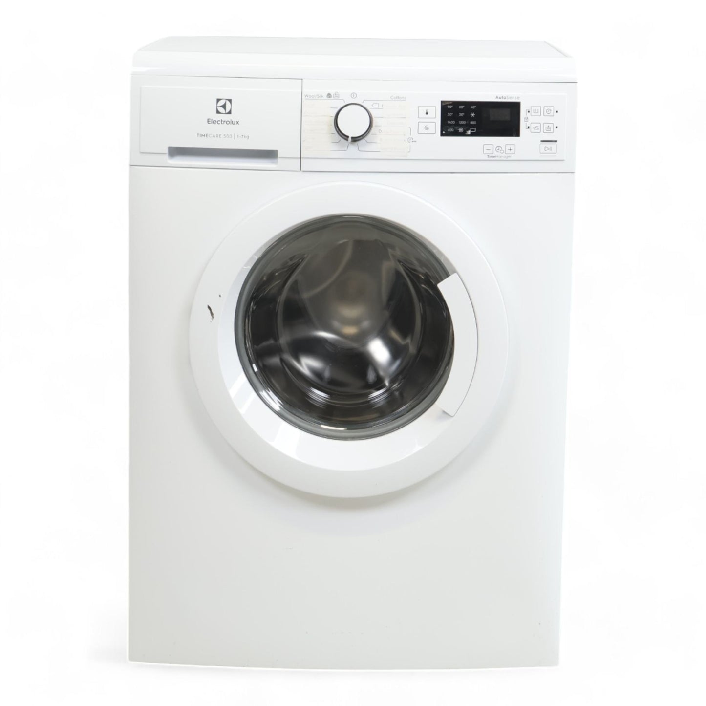 Vaskemaskinen har flere år igjen, men bærer med seg noen bruksmerker. Det er en ripe på døren og en liten sprekk bak luken til vaskemiddelet.