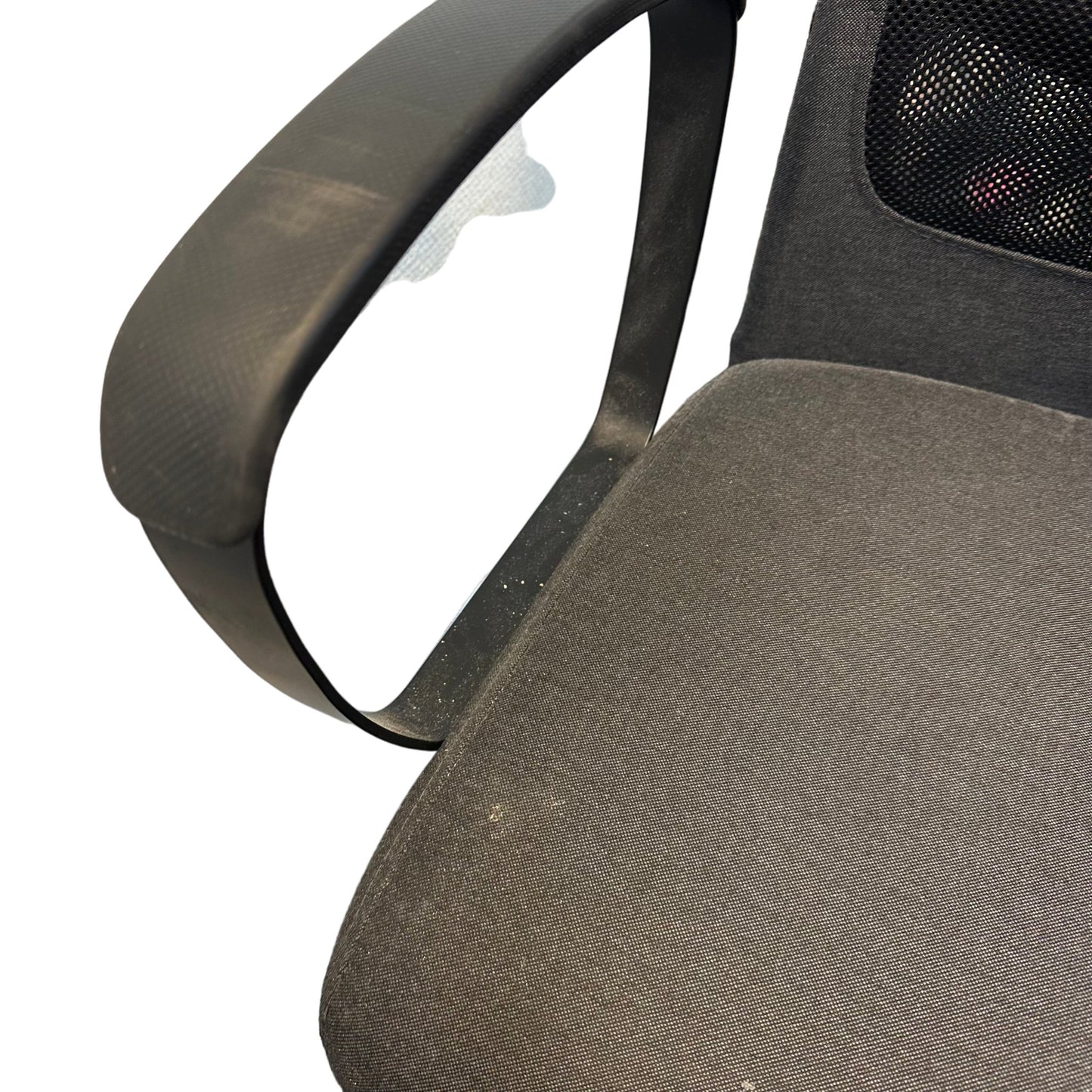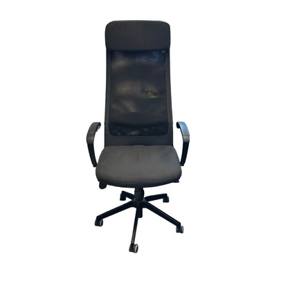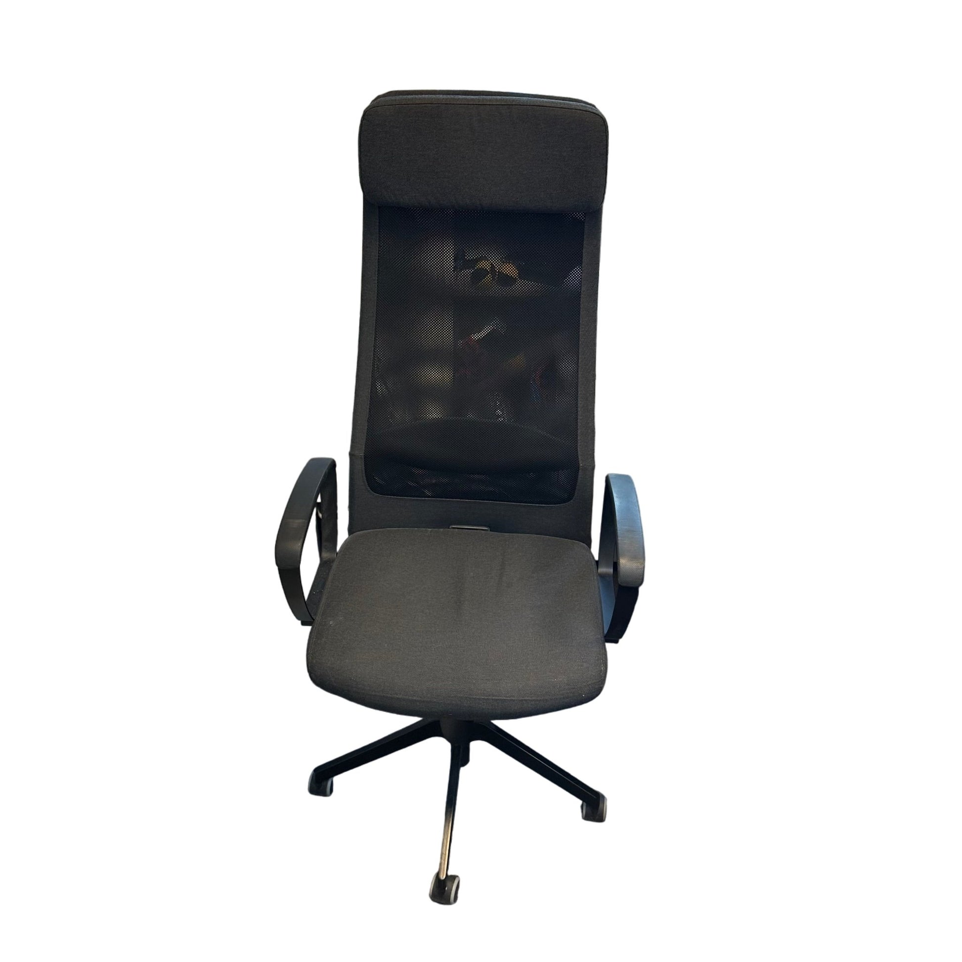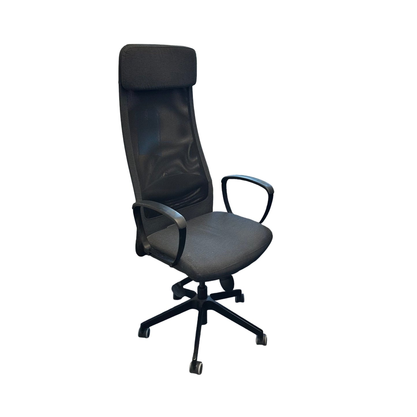 Komfortabel IKEA Markus kontorstol i mørk grå med høy rygg og justerbar sittehøyde. Stolen gir god støtte til både rygg og armer, perfekt for kontorbruk.