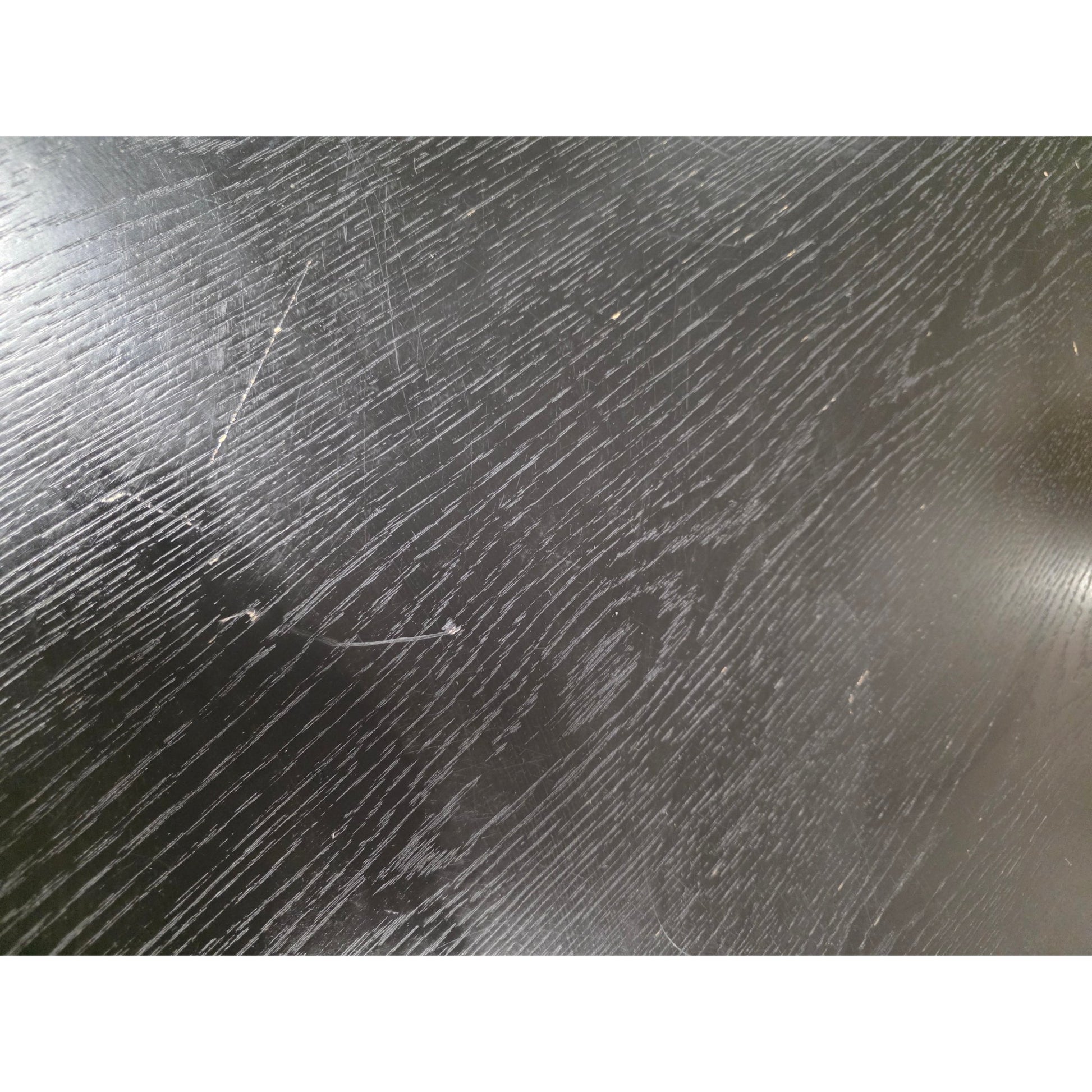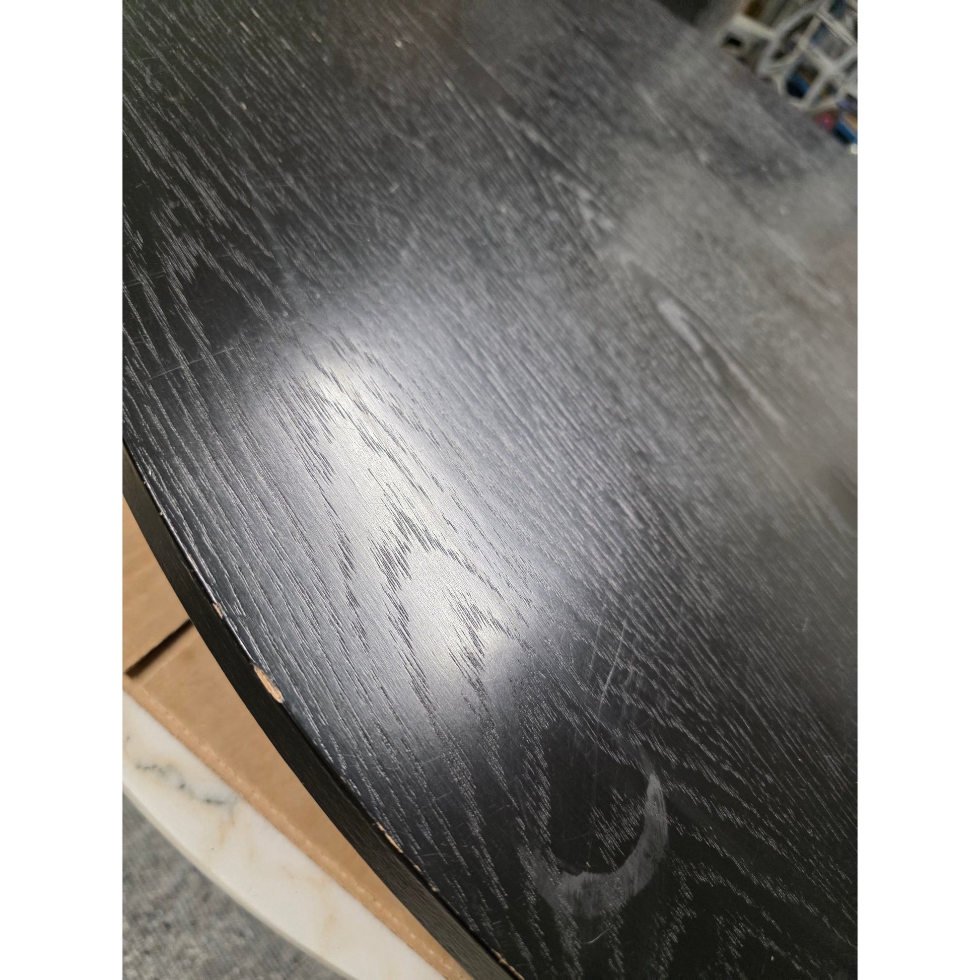 Bordet er godt brukt, med flere synlige slitasjemerker og riper på bordplaten og stammen, men det gir fortsatt et godt helhetsinntrykk.