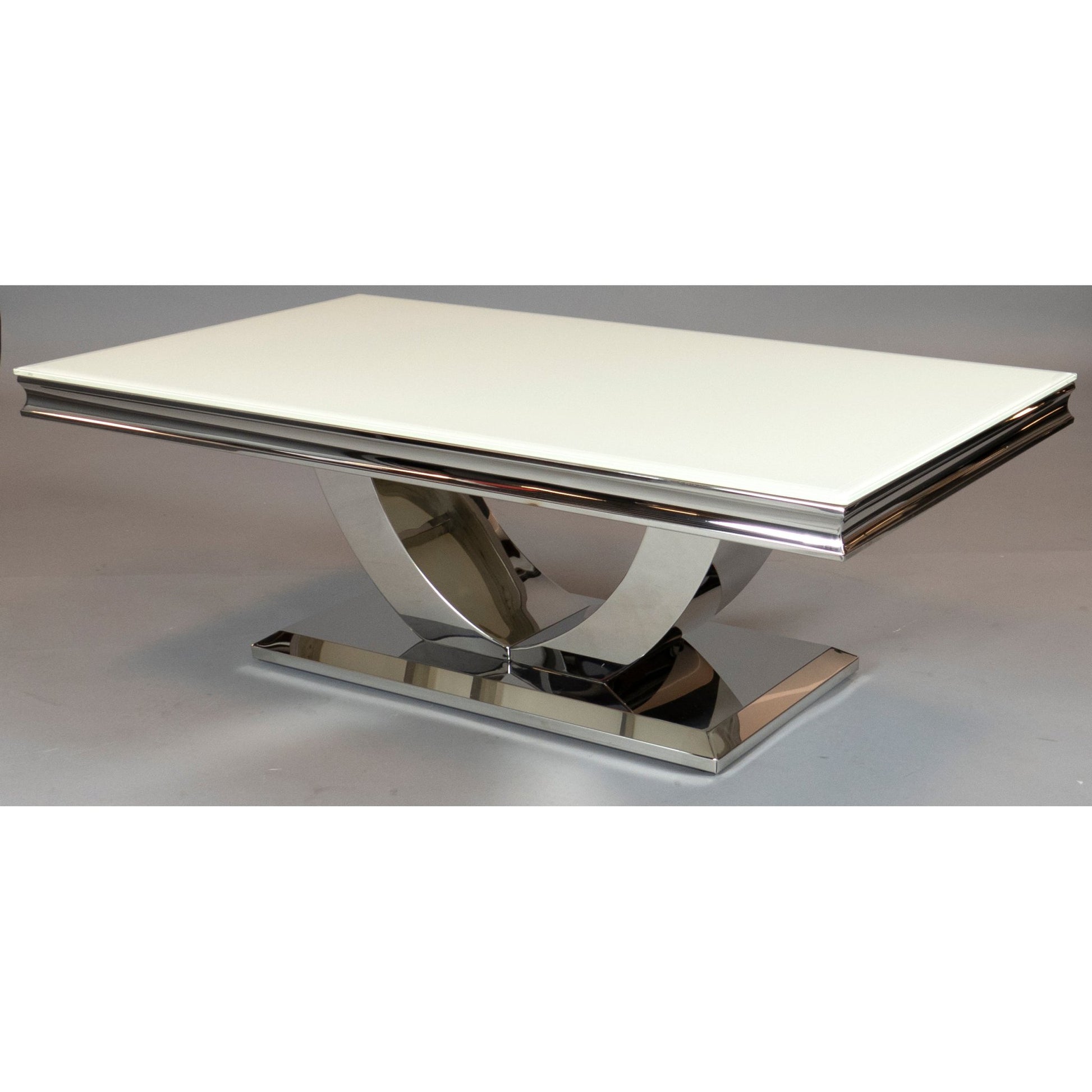 Firenze sofabord er et elegant møbel som tilfører moderne stil til ditt hjem. Bordplaten er laget i hvitt glass, mens understellet er i rustfritt stål, noe som kombinerer skjønnhet med funksjonalitet. Den sølvfargede finishen på understellet gir bordet et eksklusivt preg, og gjør det til et blikkfang i enhver spisestue.