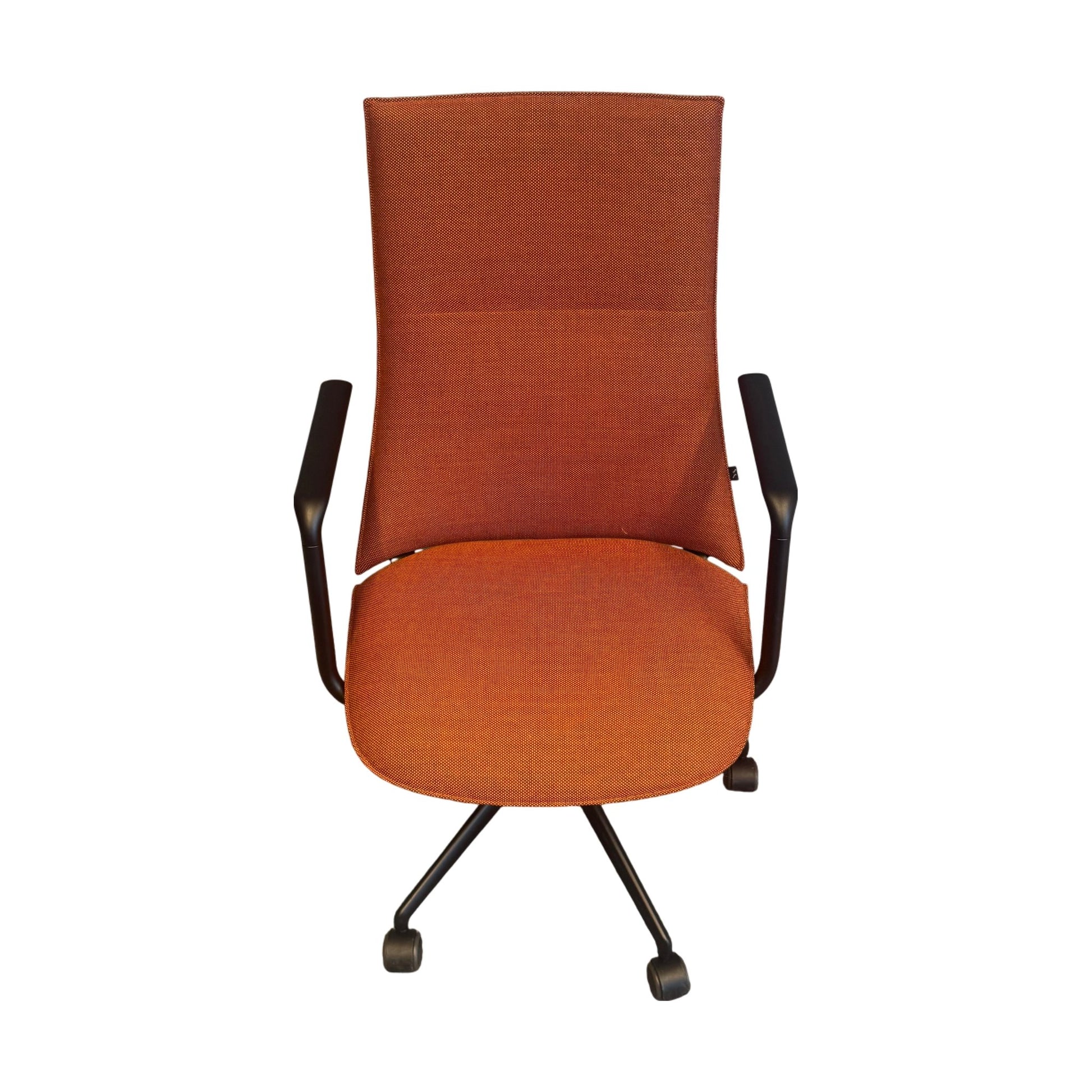 Moderne møteromsstol fra Fora Form med et stilrent og funksjonelt design. Denne stolen har et komfortabelt, polstret sete og rygg trukket i et lyst og nøye utvalgt oransje stoff, som gir et friskt preg til ethvert møterom. Med sine lette hjul kan stolen enkelt flyttes rundt, noe som gjør den perfekt til varierte møtesituasjoner. Rammens design gir en moderne følelse samtidig som den støtter ergonomisk sittestilling.