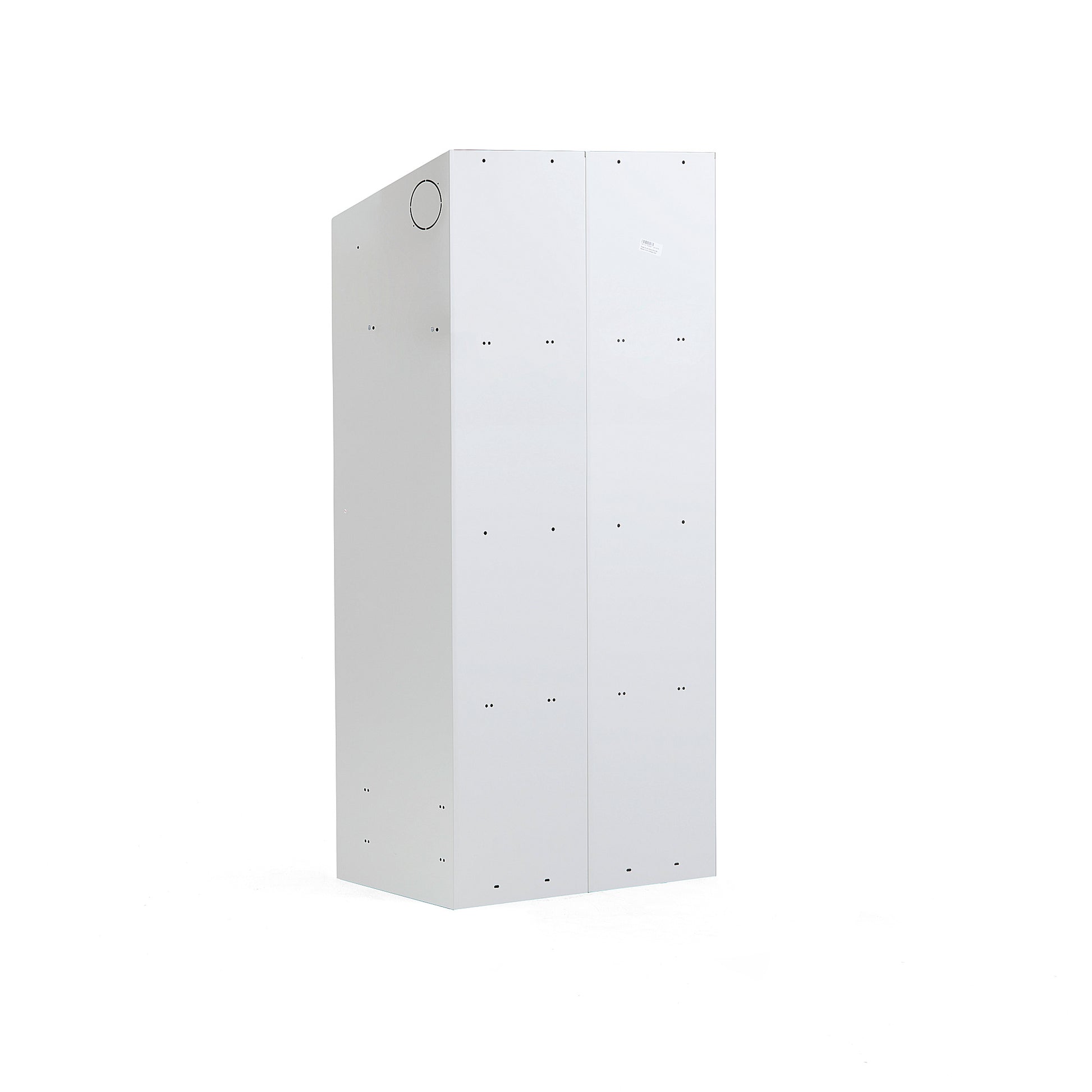 Garderobeskap med to seksjoner i bredden. Med hattehylle, klesstang med to kroker, skrått tak og ventilasjonshull. Klargjort for eksternt ventilasjonssystem. Dører med dørstopp og gummidemping. Kan kompletteres med tilbehør og understell.