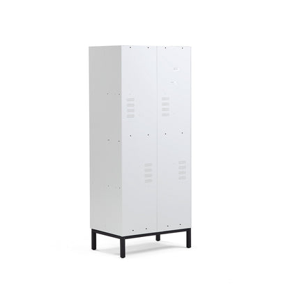 Garderobeskap med ventilasjonshull, hattehylle og klesstang med to kroker. Dører med dørstopp ved 90° og gummidemping. Inkludert benstativ.