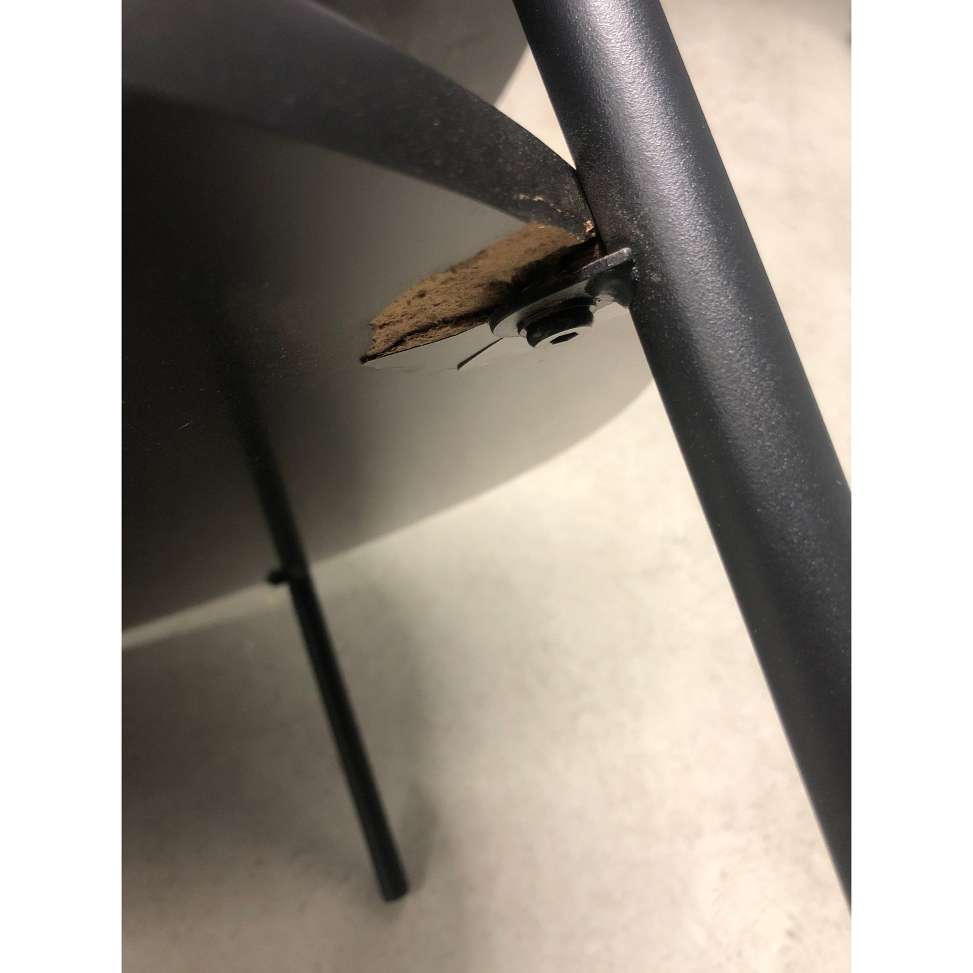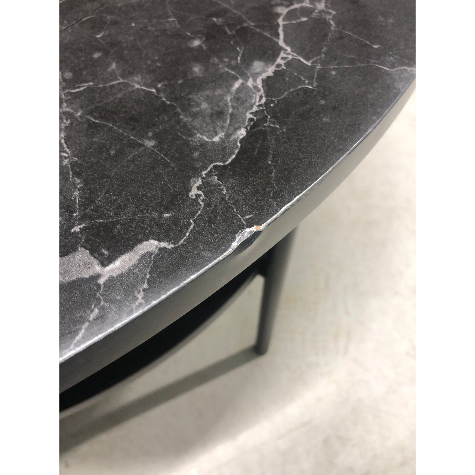 Bordet er i godt brukt tilstand med et par bruksmerker på bordflaten som vist på bildene. Det er også en skade i det ene festet på hylla under bordet.