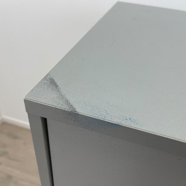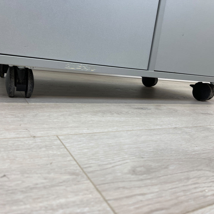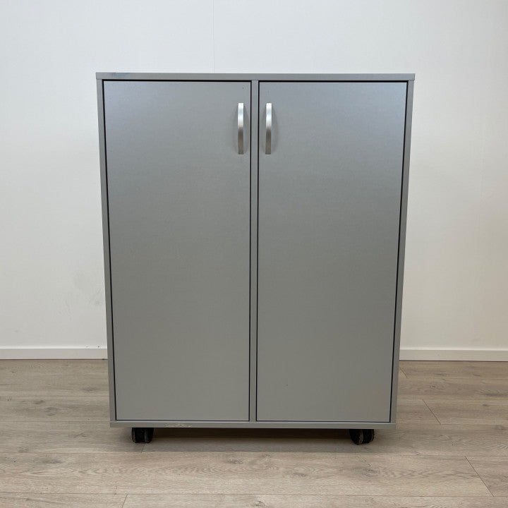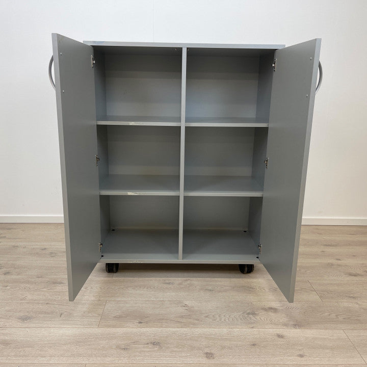 Arkivskap på hjul i fargen grå. 2 stk skapdører med 6 stk hyller. Arkivskapene har noe skader og bruksslitasjer på toppen av skapet, og på bunn ved hjulene.