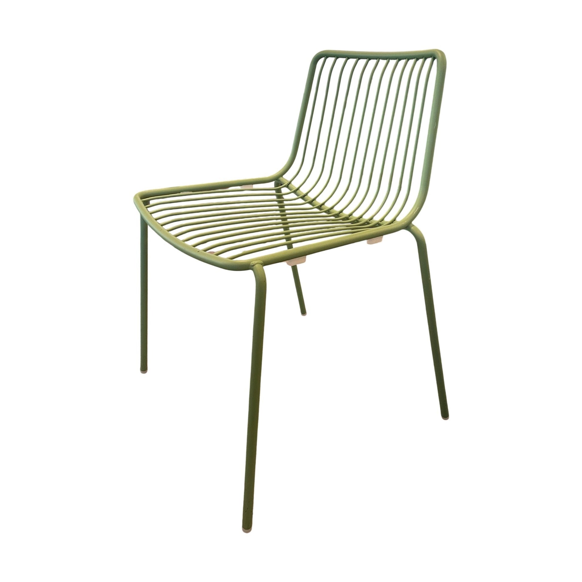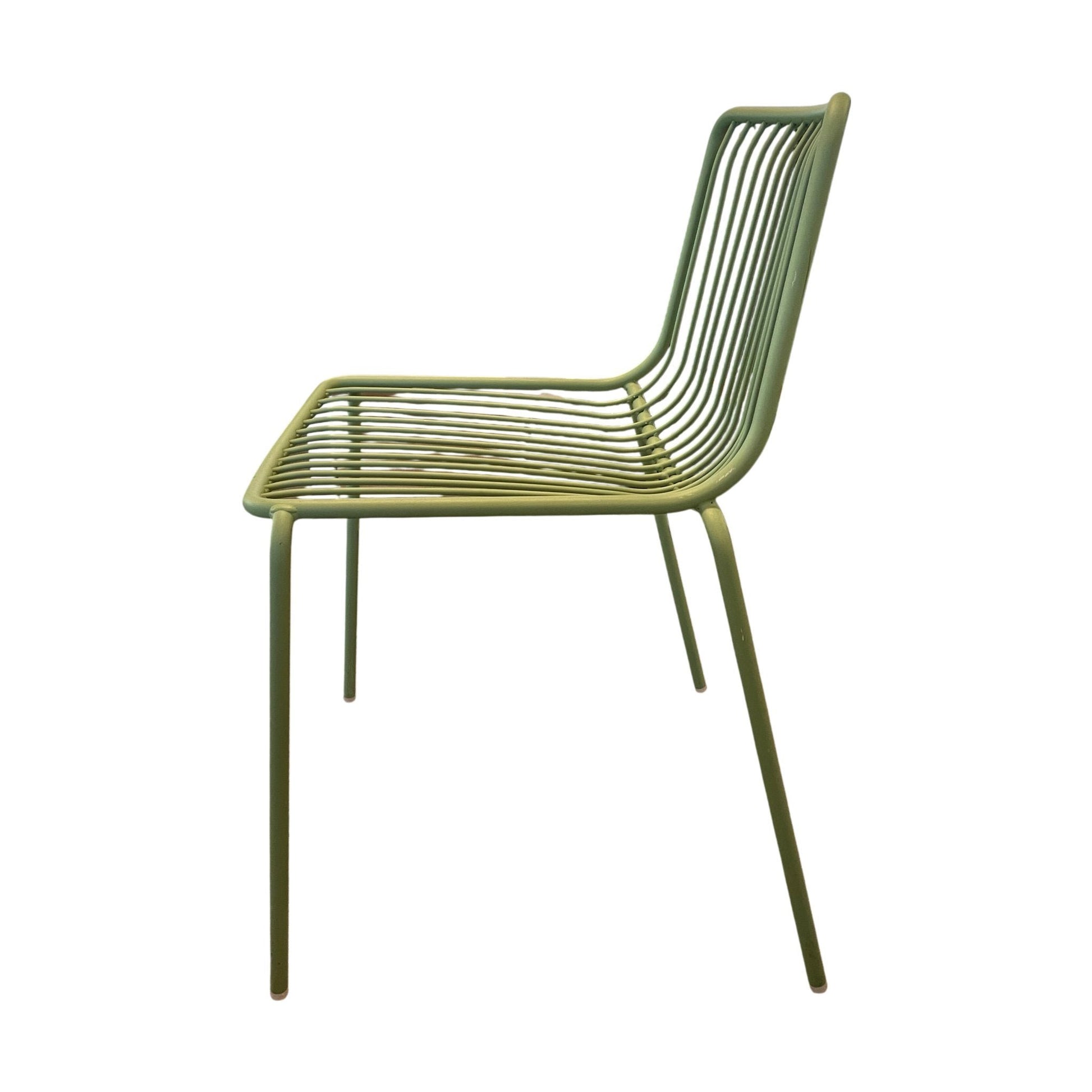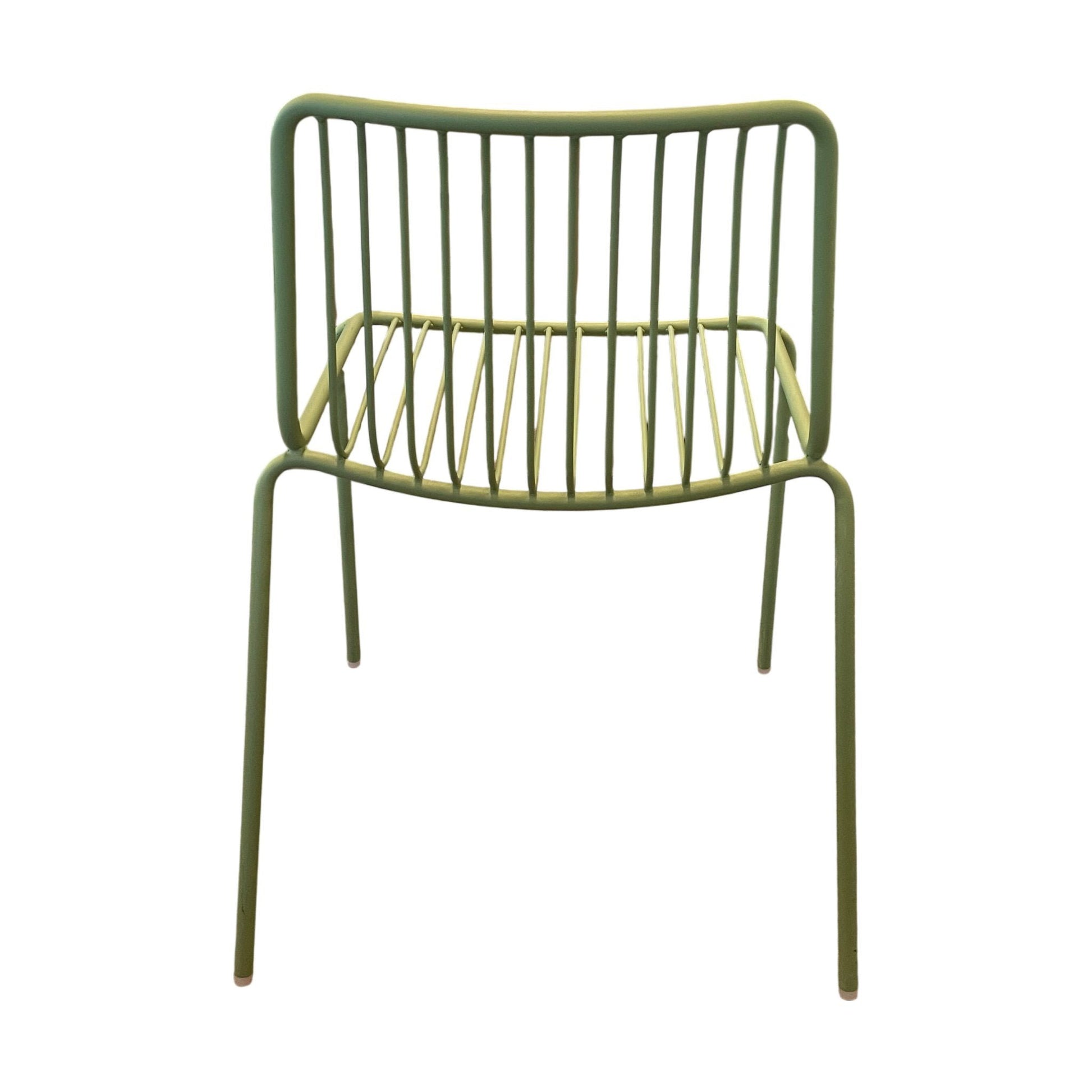 Denne stilrene hagestolen i metall har en moderne, åpen design som skaper en lett og luftig følelse. Den grønne fargen tilfører et friskt preg, og stolen passer perfekt både på terrassen og i hagen.