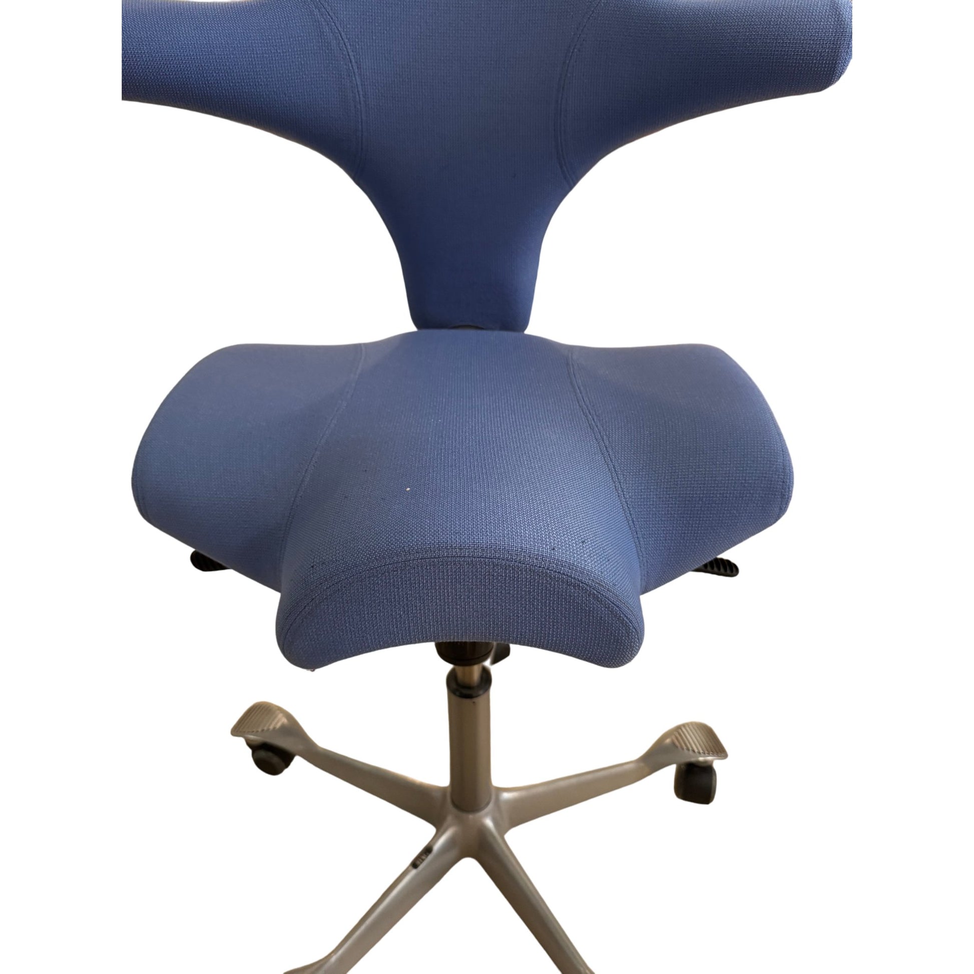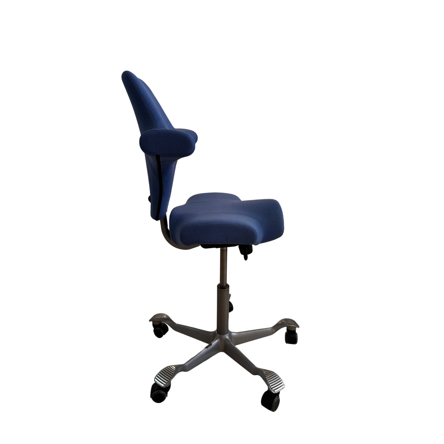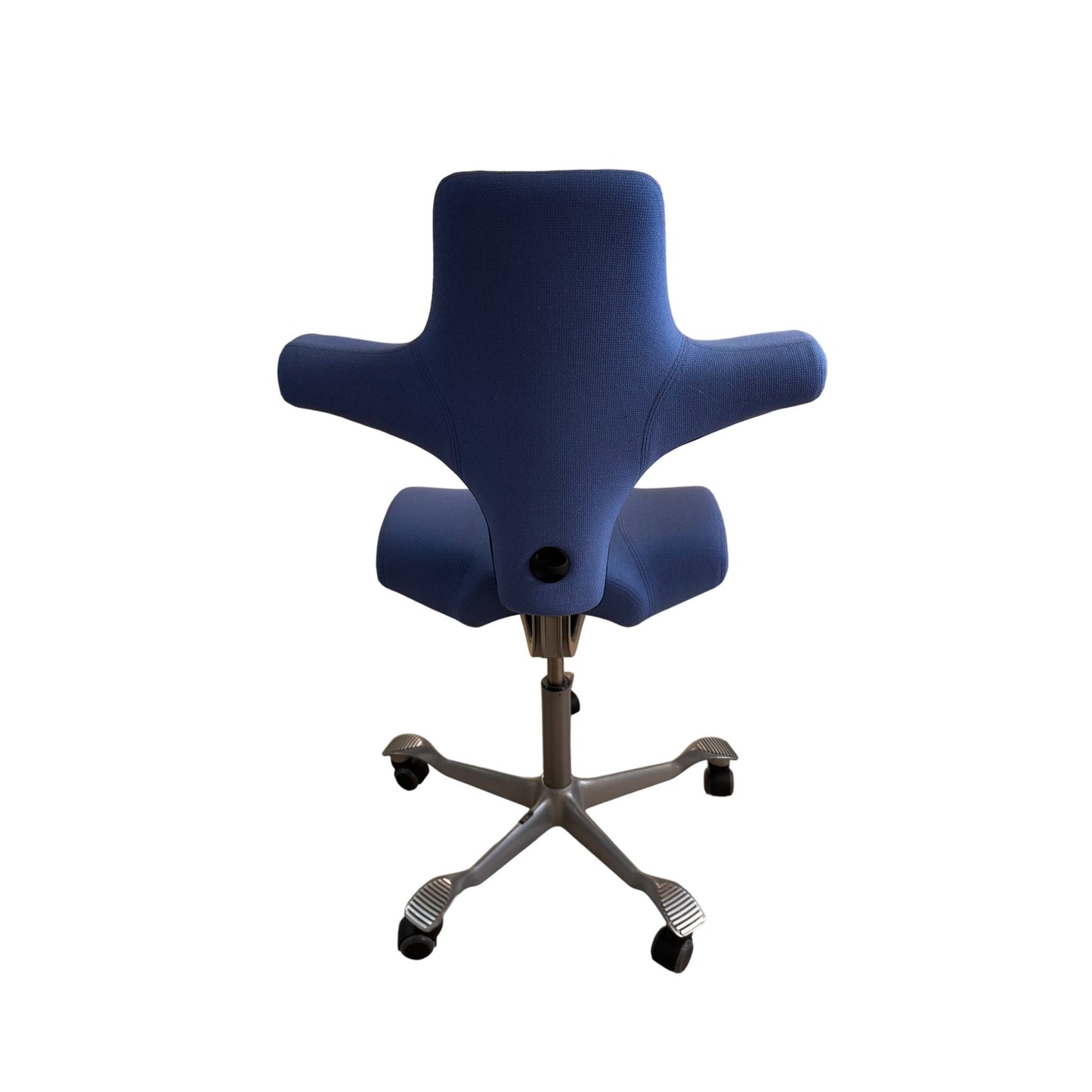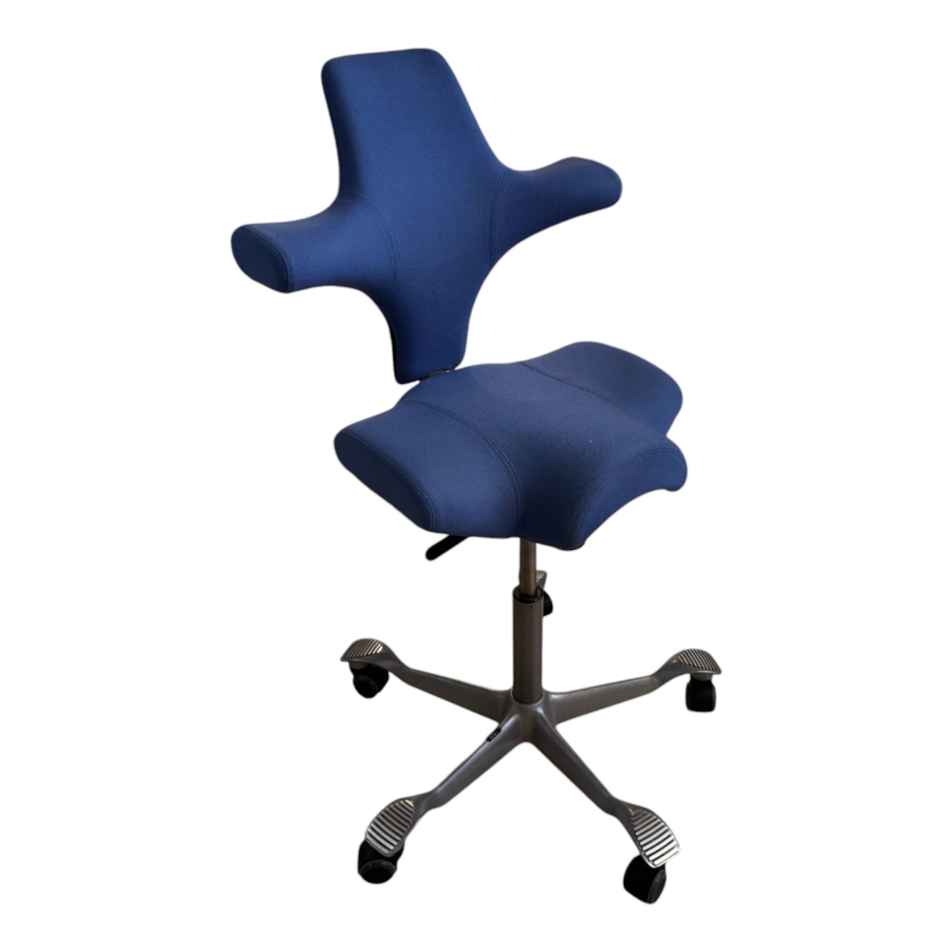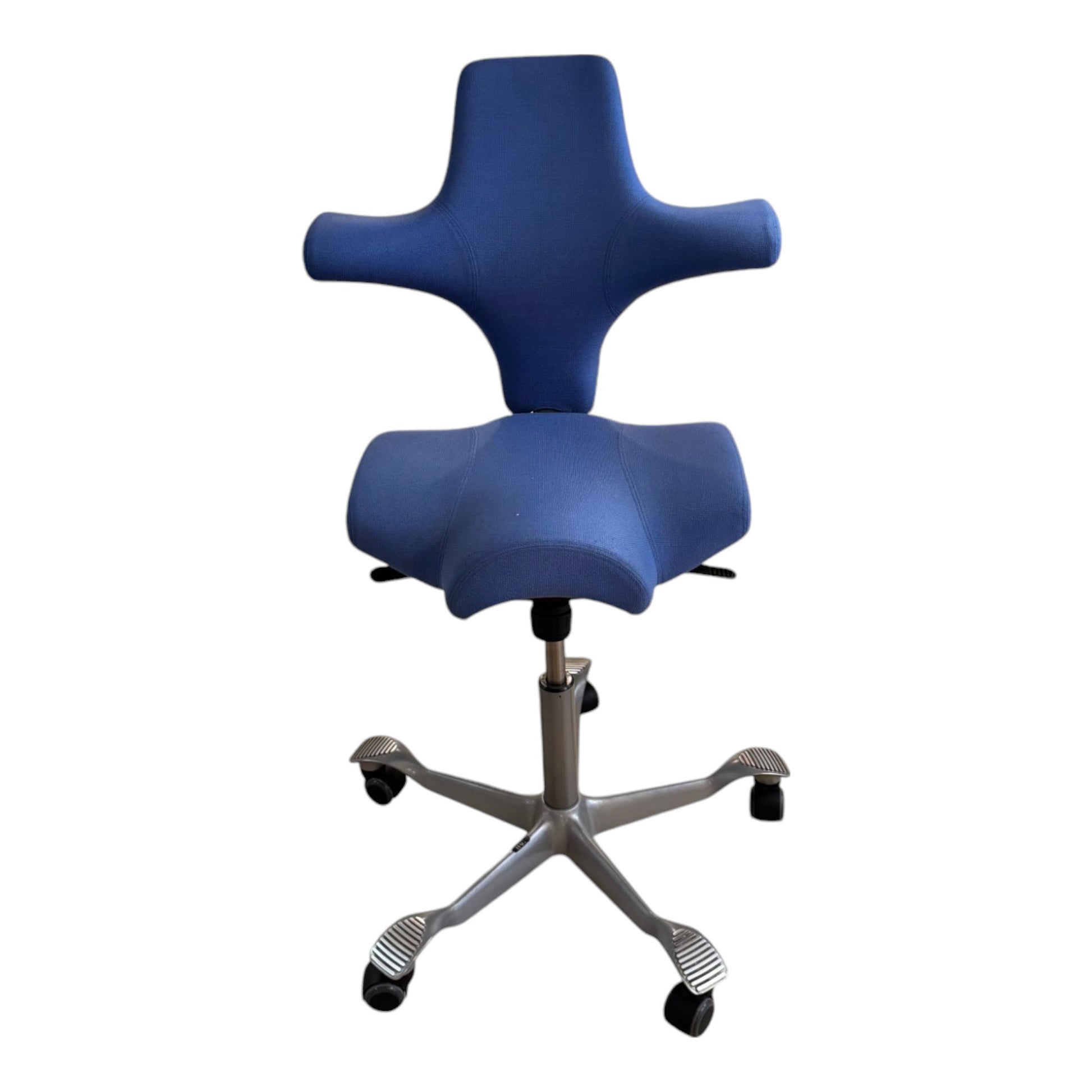 HÅG Capisco kontorstol i en livlig blå farge gir en unik og dynamisk arbeidsopplevelse. Stolen er designet for optimal støtte og bevegelse, noe som gjør den ideell for lange arbeidsøkter.