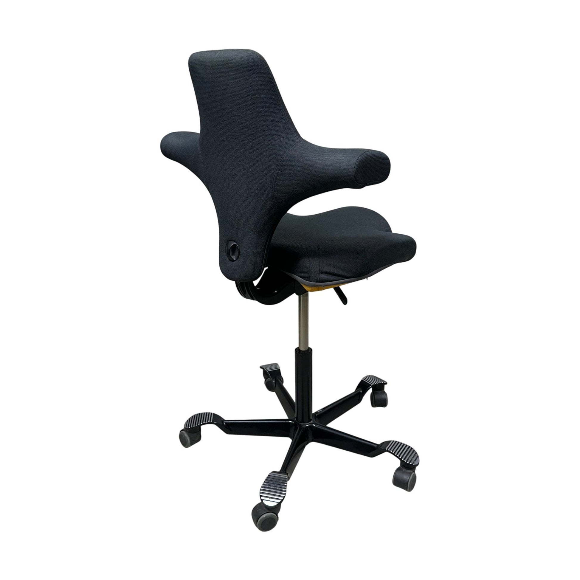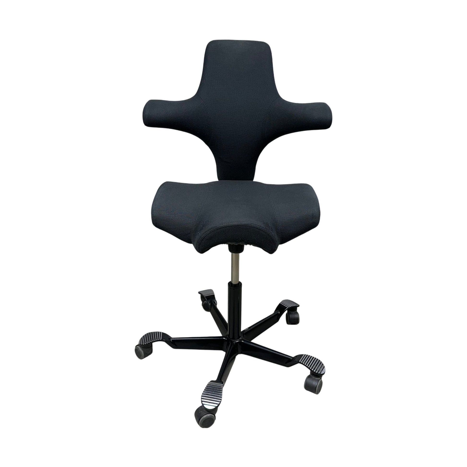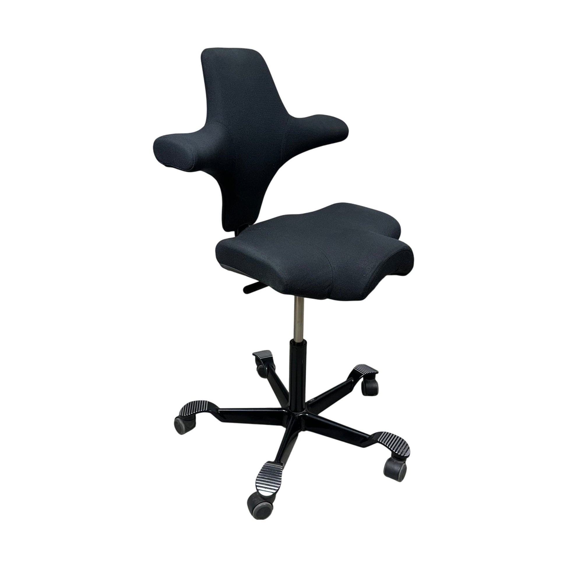 Ergonomisk kontorstol fra HÅG, modellen Capisco, er designet for å fremme aktiv sitting med sitt unike sadelformede sete. Stolen er ideell for både standard og høye arbeidsbord, og dens mørk grå farge gir et stilrent uttrykk på kontoret.