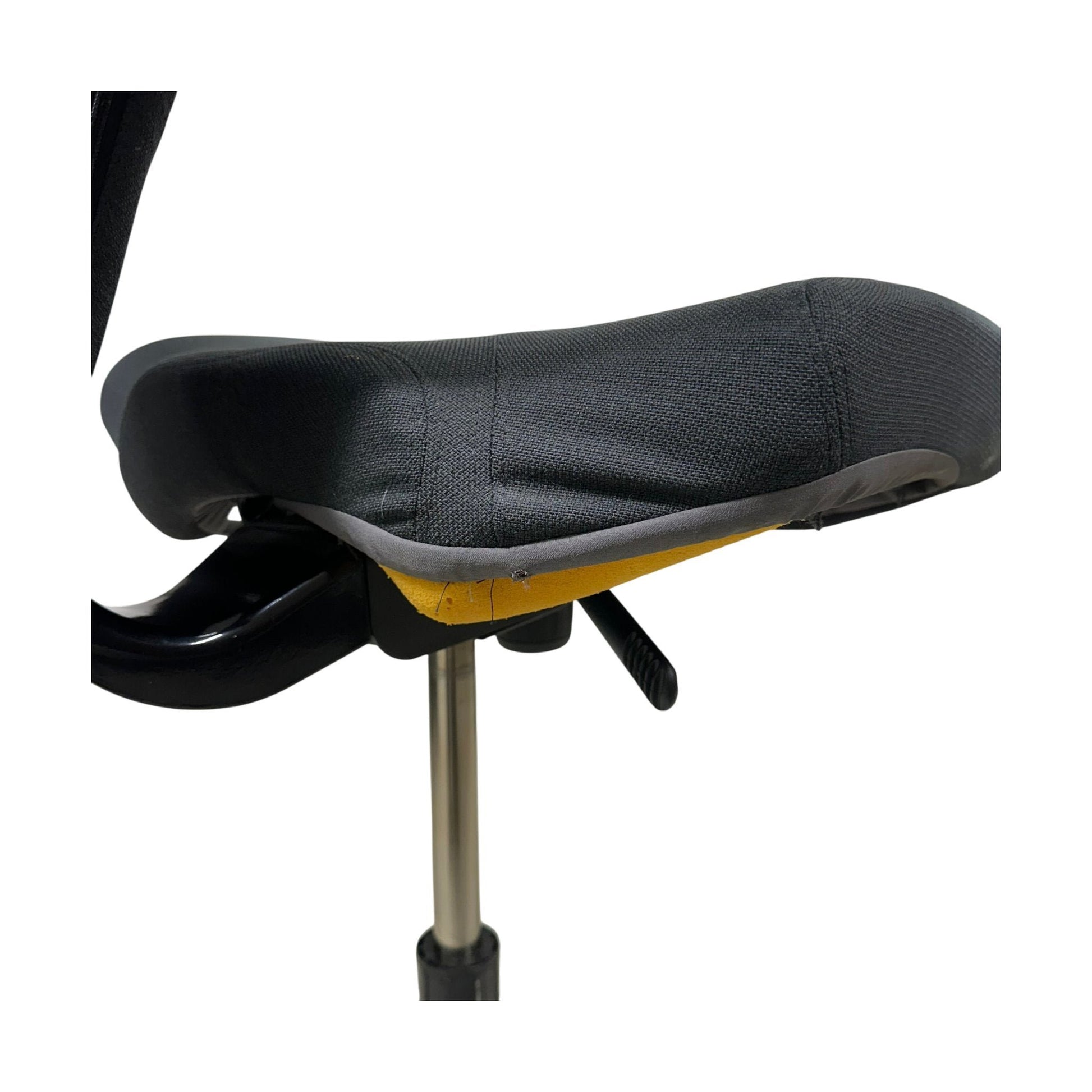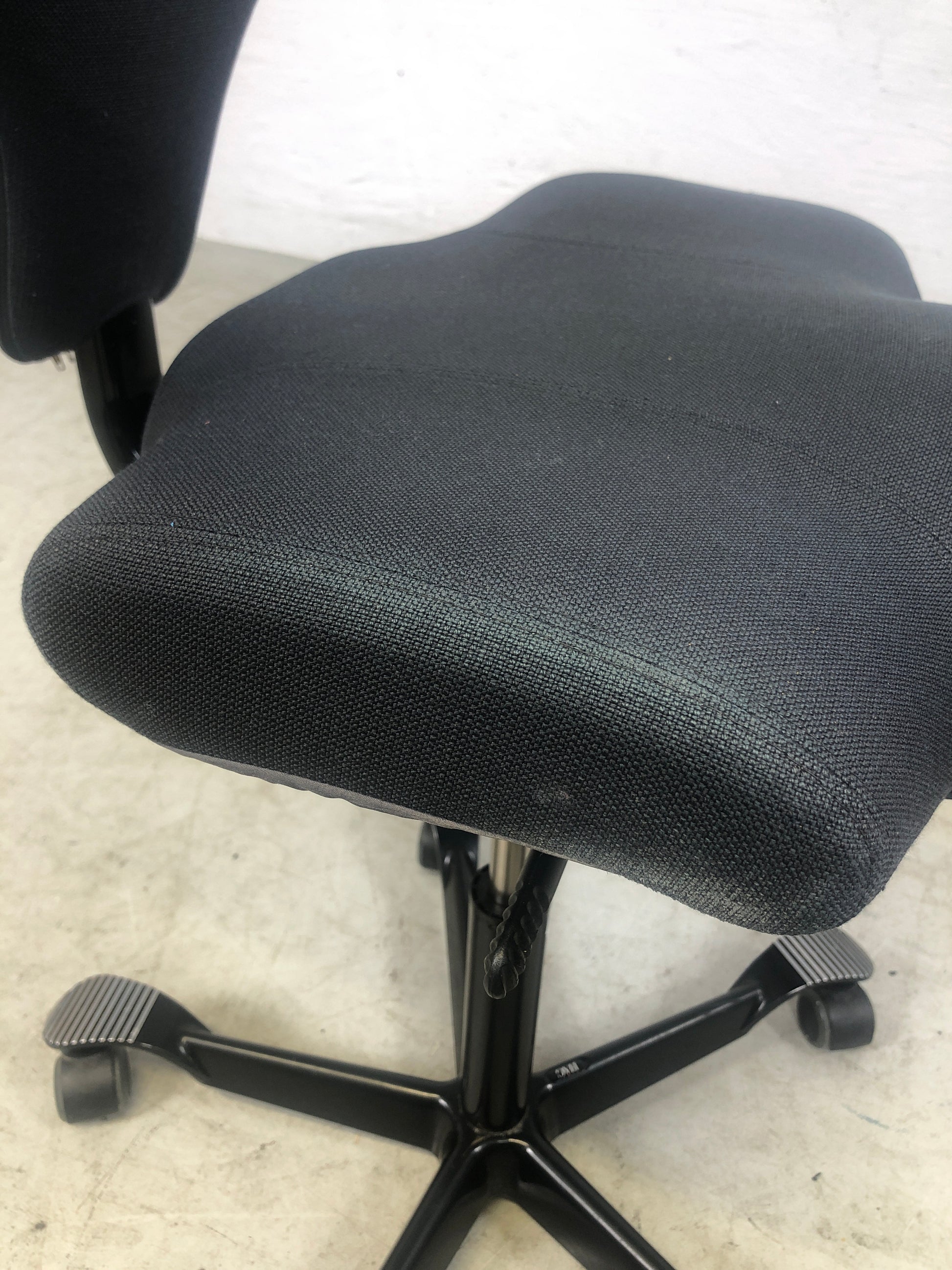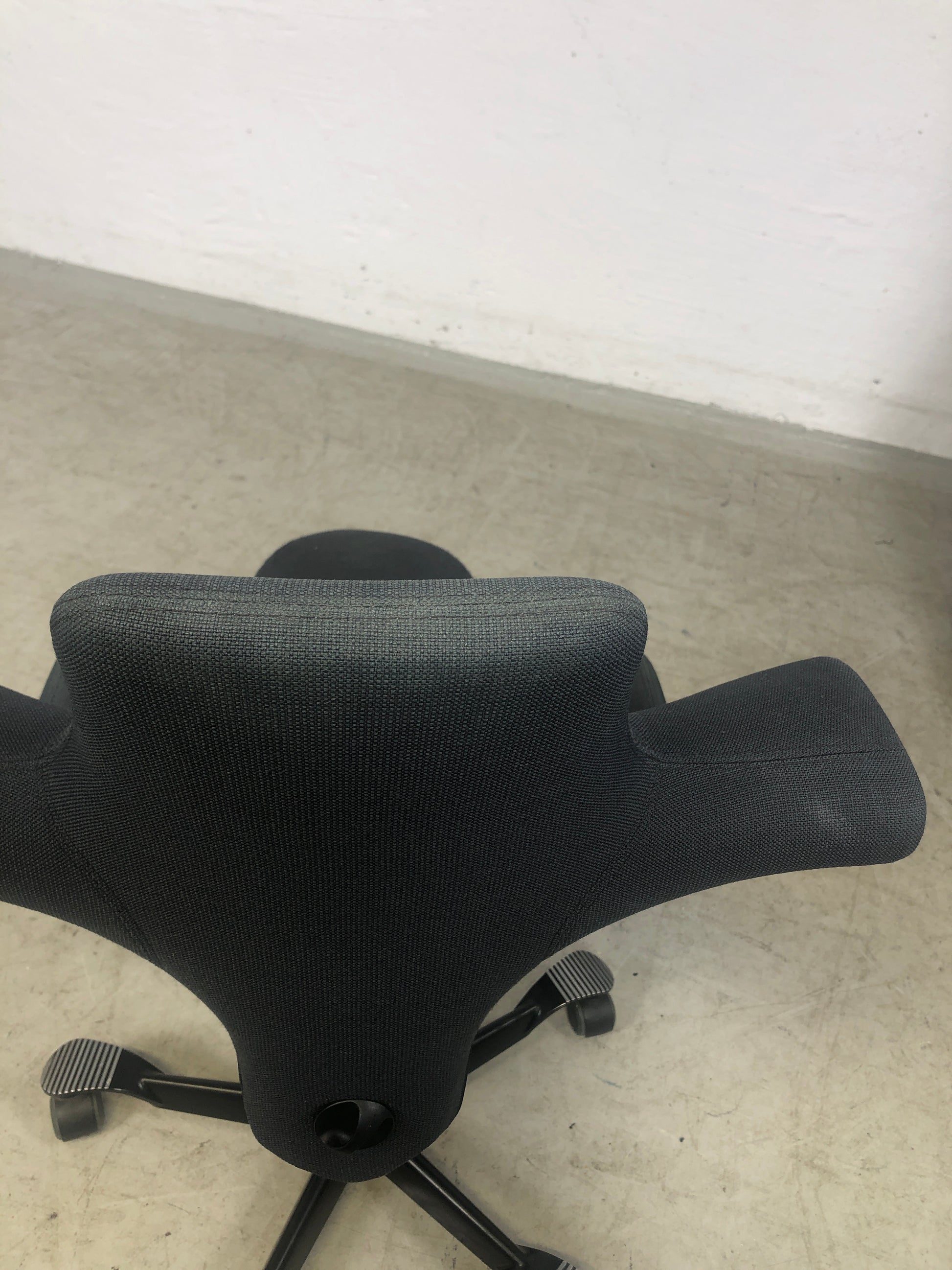 Ergonomisk kontorstol fra HÅG, modellen Capisco, er designet for å fremme aktiv sitting med sitt unike sadelformede sete. Stolen er ideell for både standard og høye arbeidsbord, og dens mørk grå farge gir et stilrent uttrykk på kontoret.