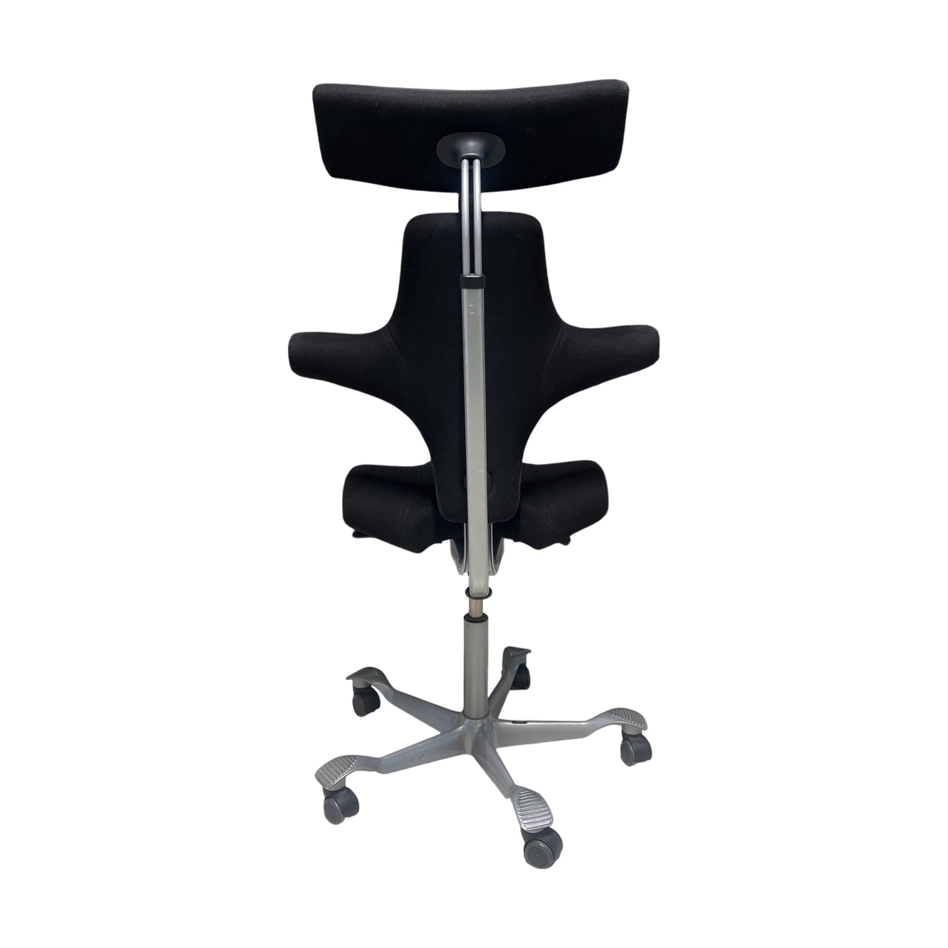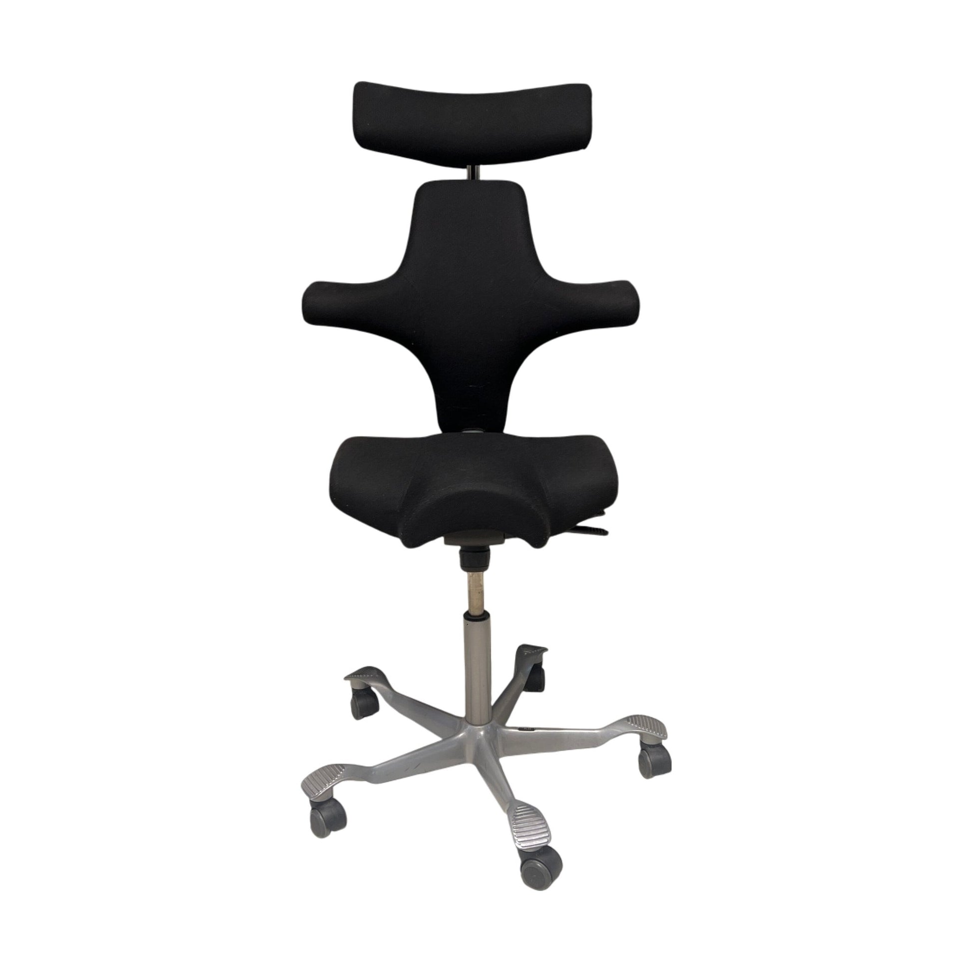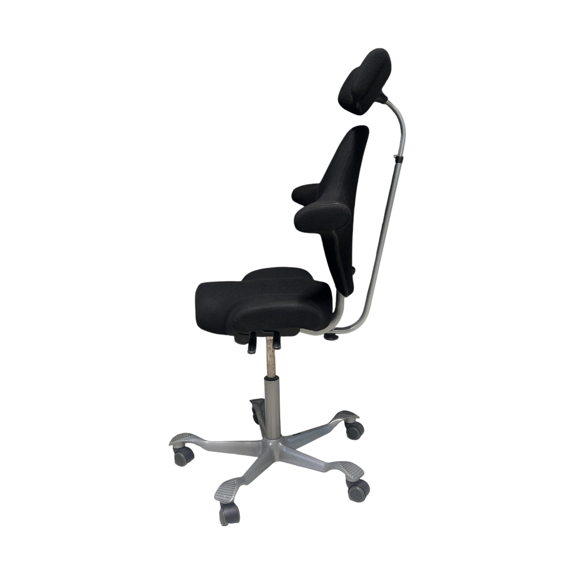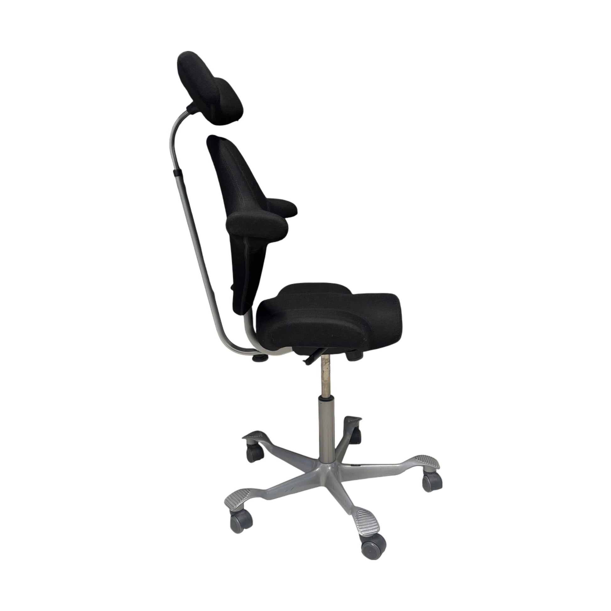 Kontorstolen HÅG Capisco er designet for å fremme ergonomisk sitting med sitt særegne sadelformede sete og nakkestøtte. Stolen har sorte ben som gir et moderne preg, og er ideell for både hjemmekontoret og profesjonelle arbeidsplasser.