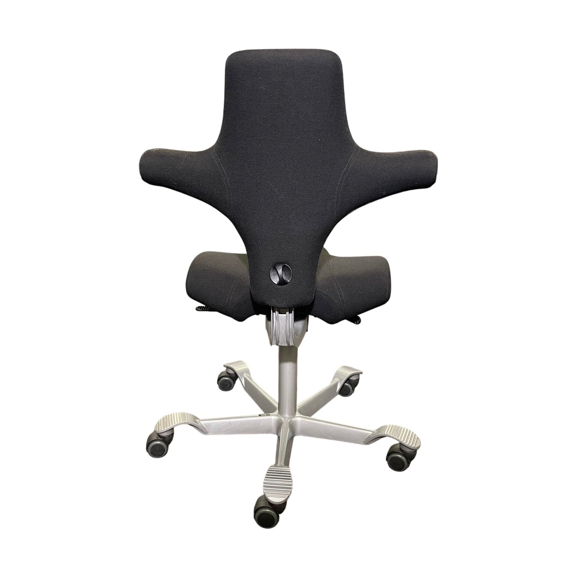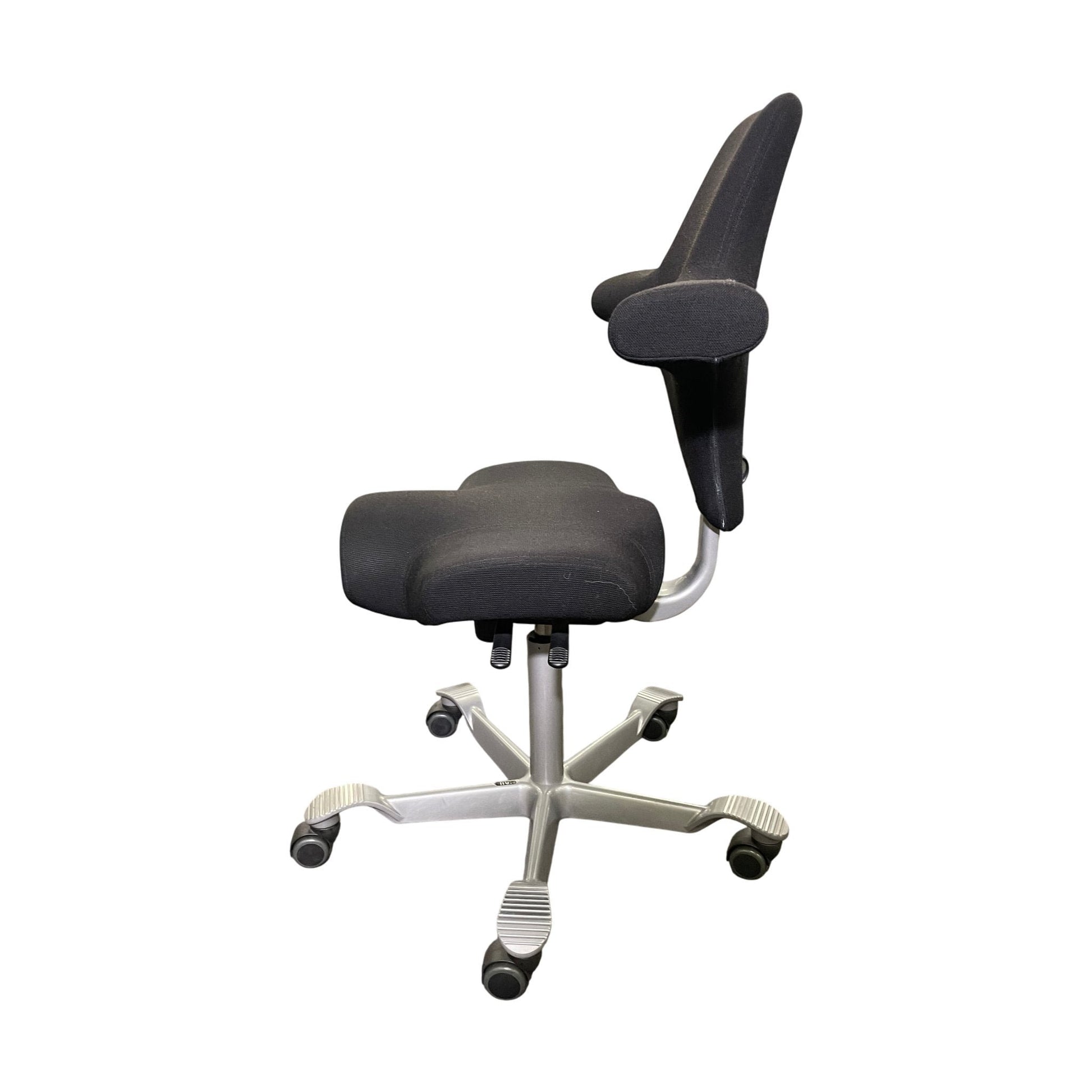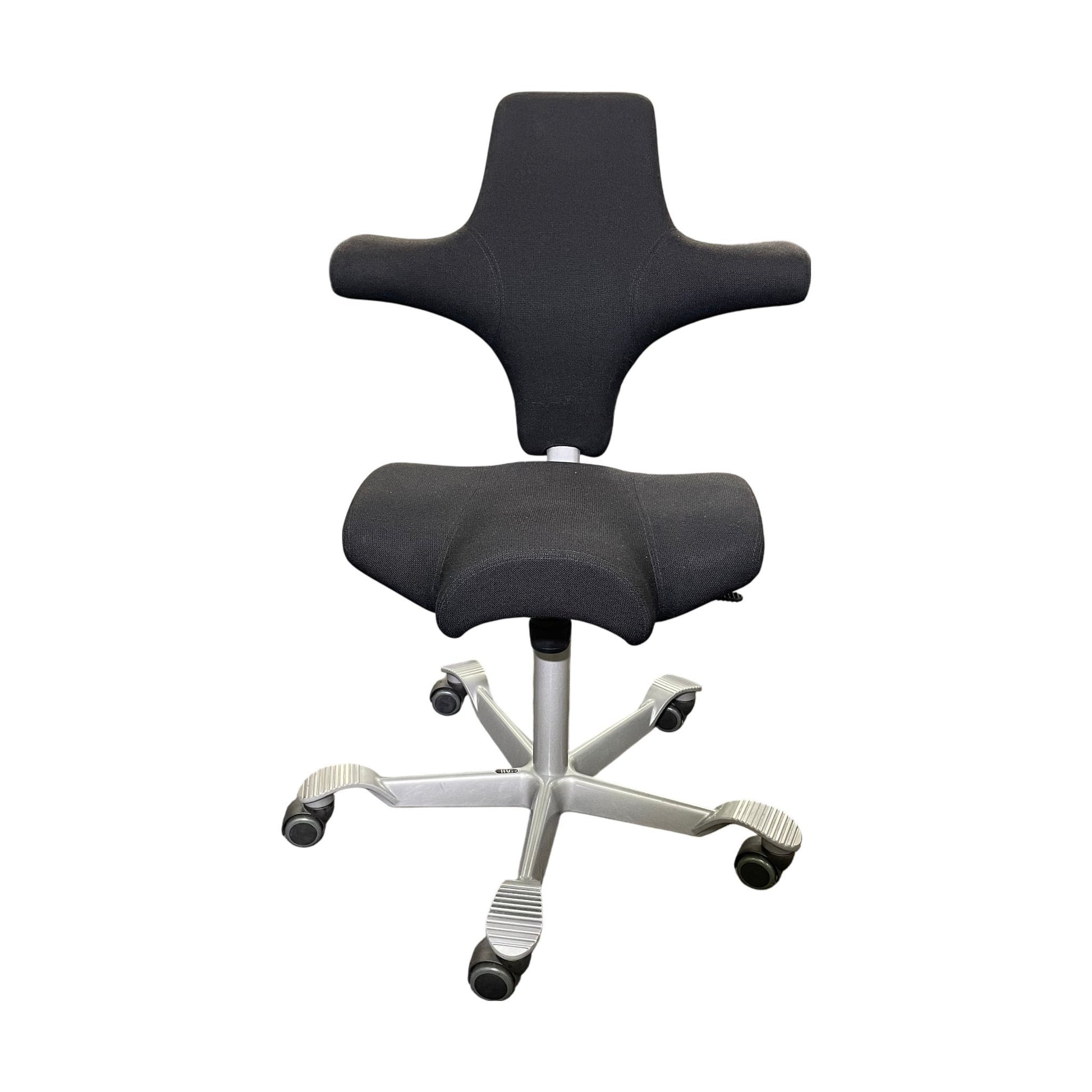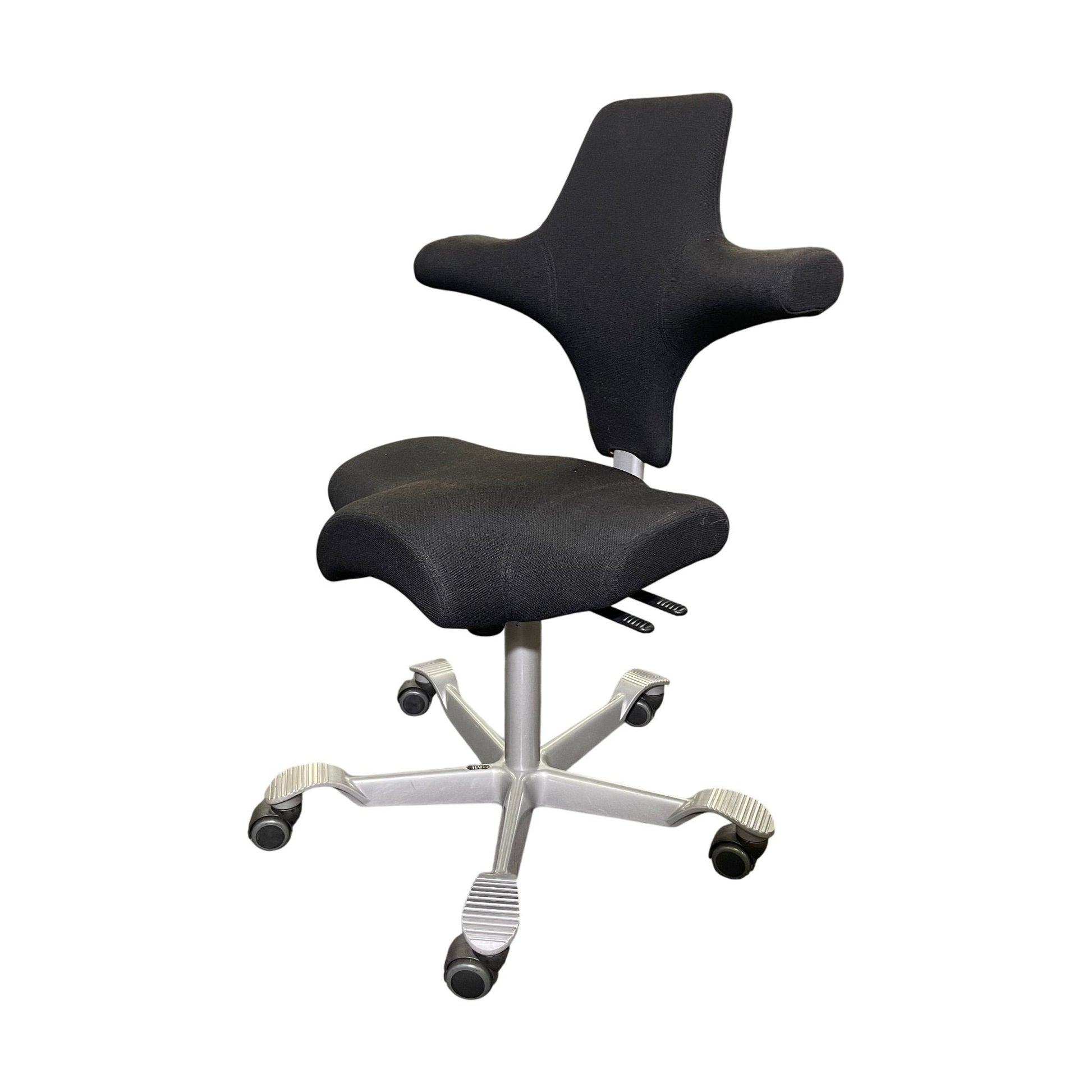 Ergonomisk kontorstol fra Håg med etunikt design og aktiv sittestilling. Denne Capisco-modellen er laget for å støtte en rekke arbeidsstillinger, noe som gjør den ideell for både standard og høye arbeidsbord. Den mørke, svarte fargen gir et moderne og tidløst uttrykk.