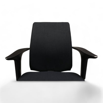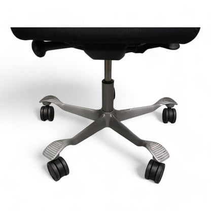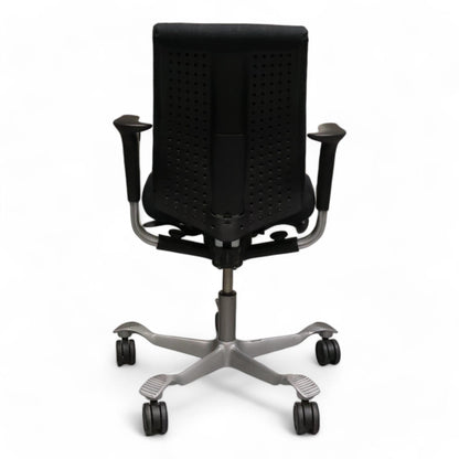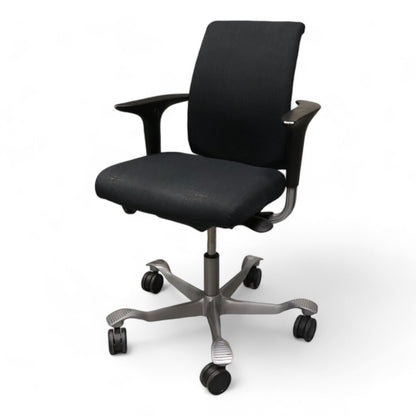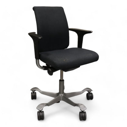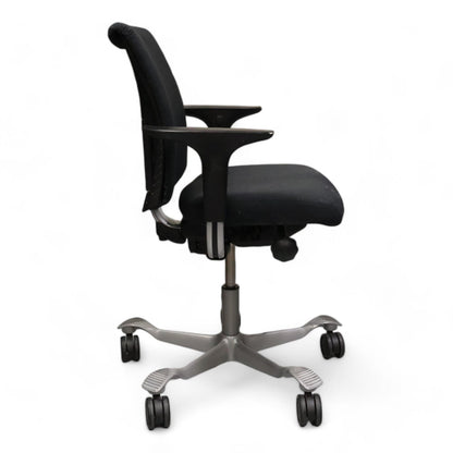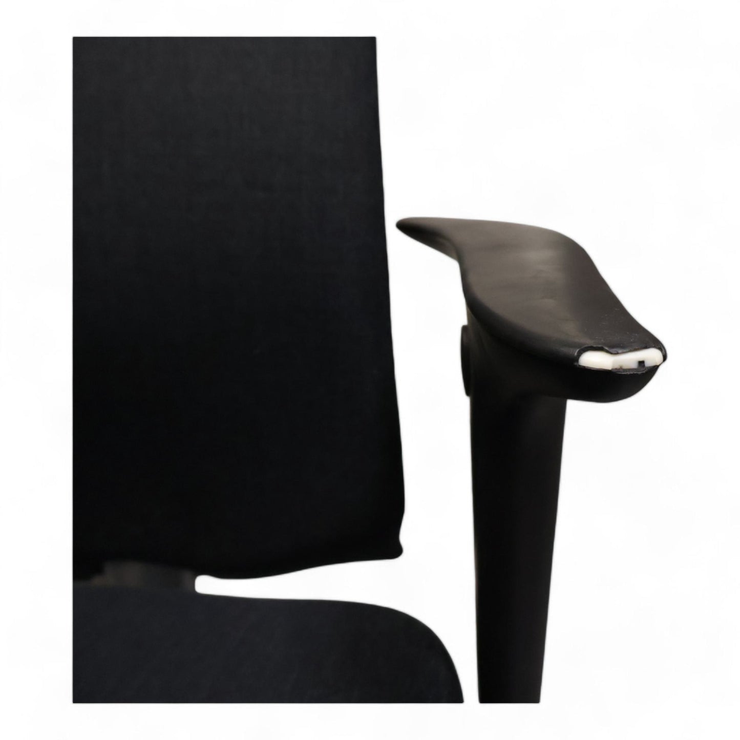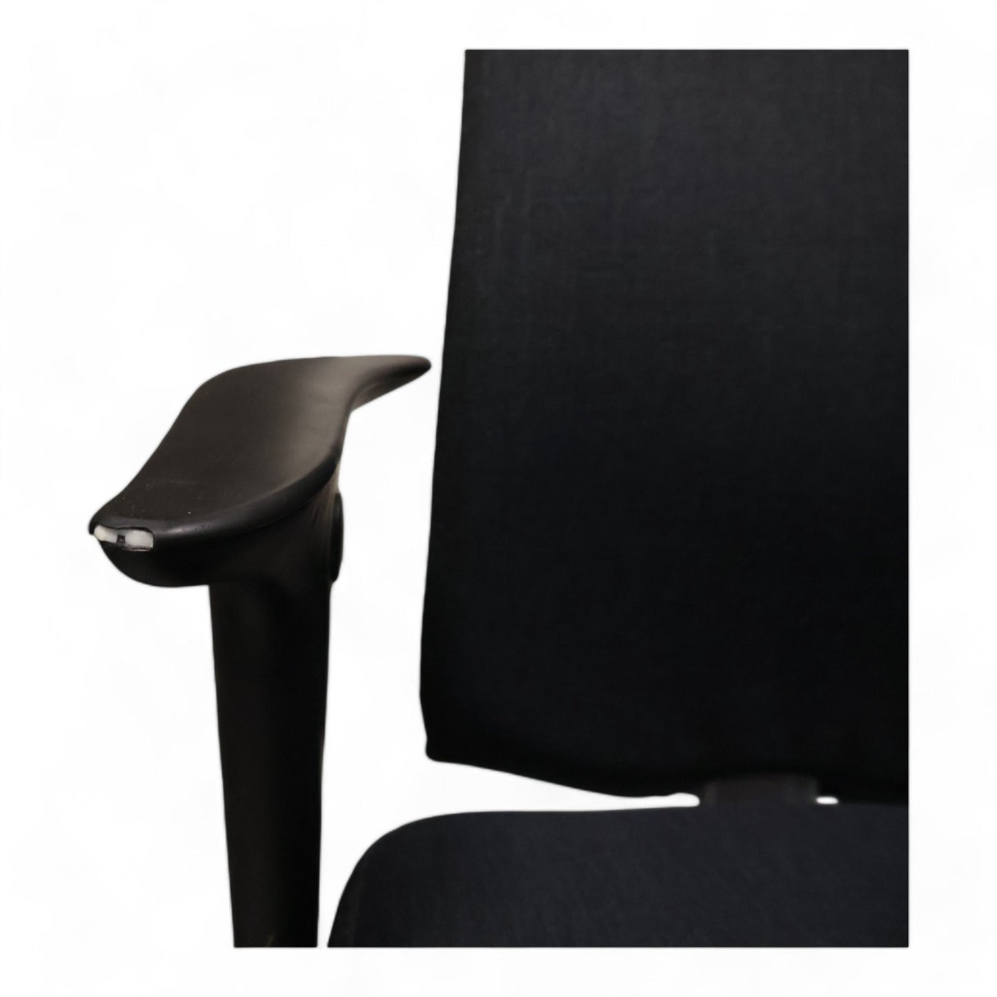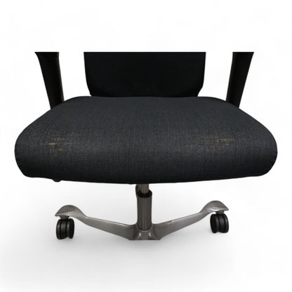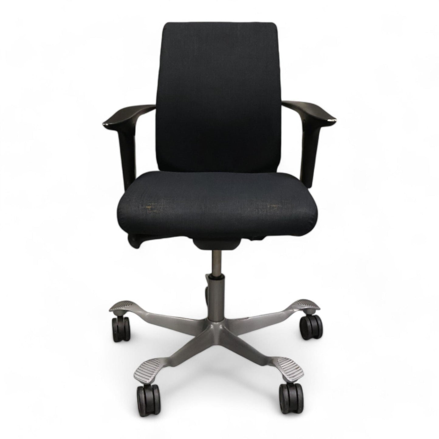 Stolen har tydelig bruksslitasje, inkludert skrapet silikon på armlenene og slitasje i stoffet. Likevel fungerer stolen fint og gir fortsatt god støtte.