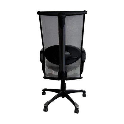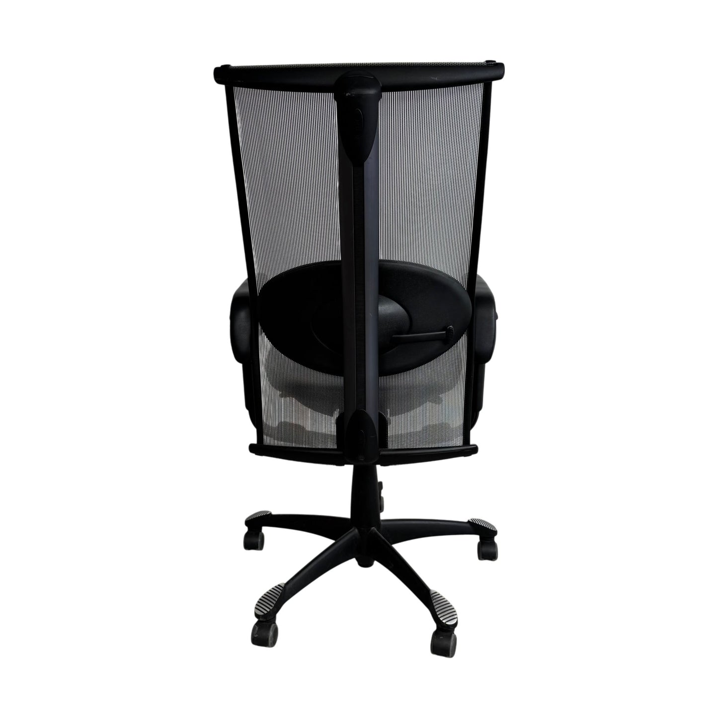 Det matte sorte understellet gir et stilrent utseende. Tilstanden er god med minimale bruksmerker, noe som er forventet fra normal bruk. Denne stolen kombinerer ergonomisk design med holdbarhet for å skape en ideell arbeidsplass. Sittepute i skinn, rygg i luftbar mesh.