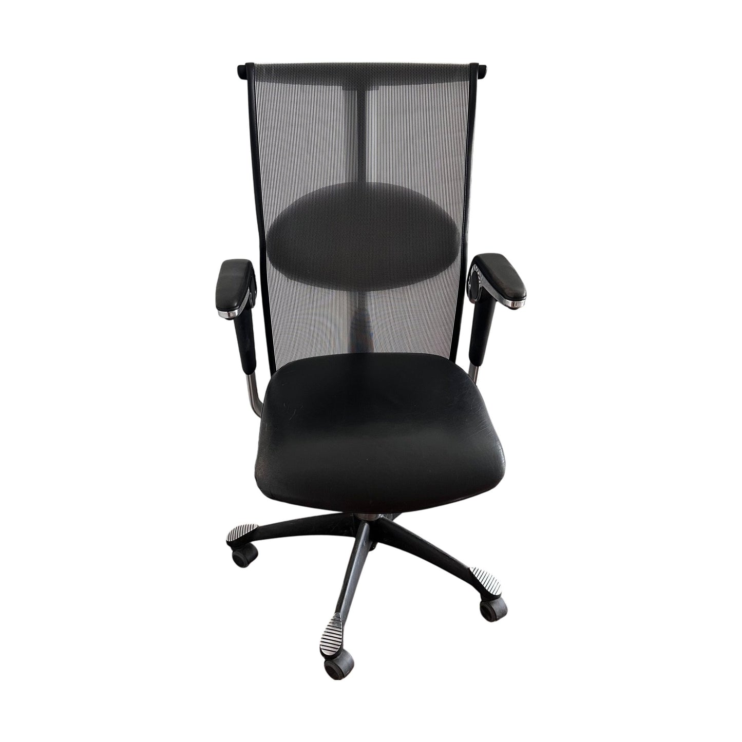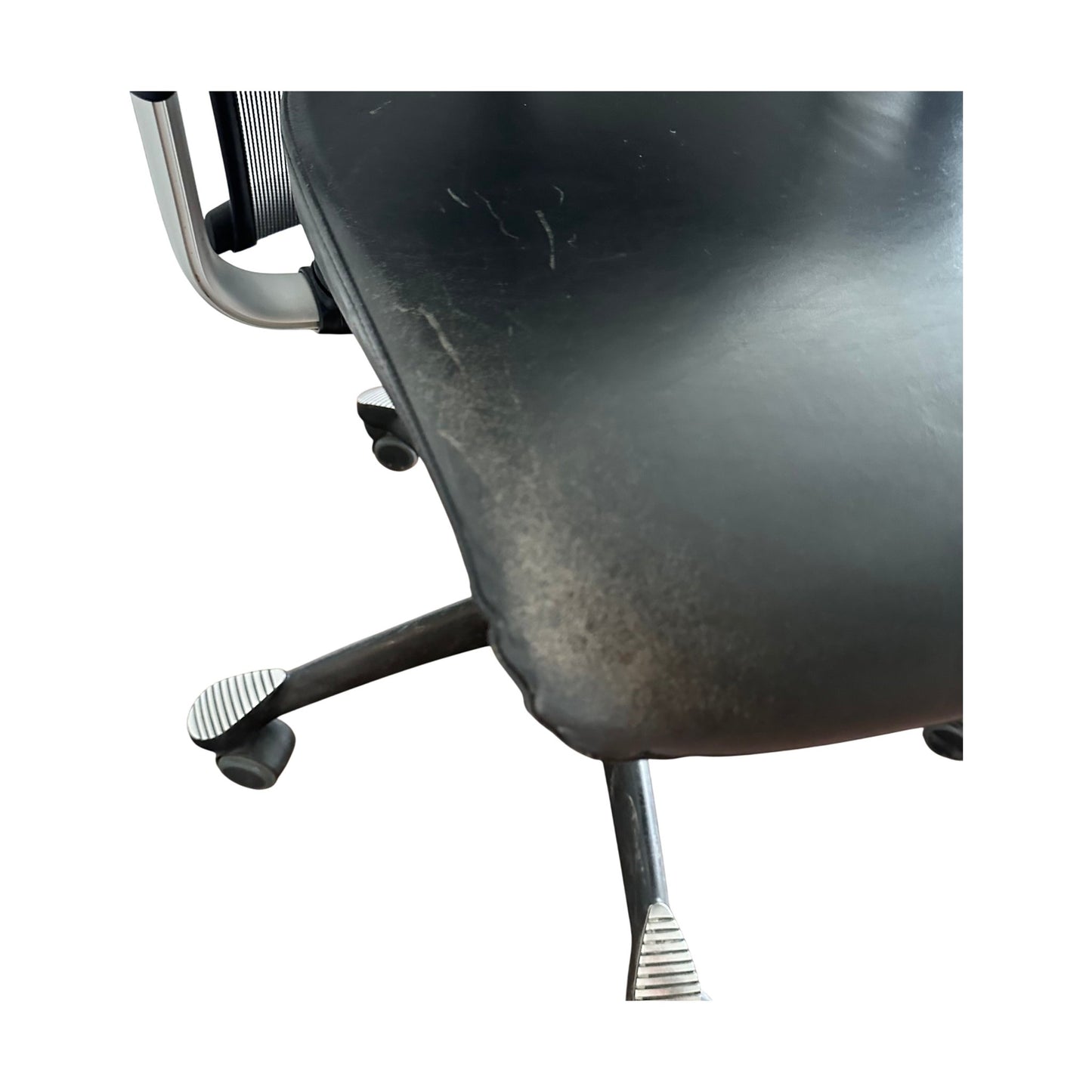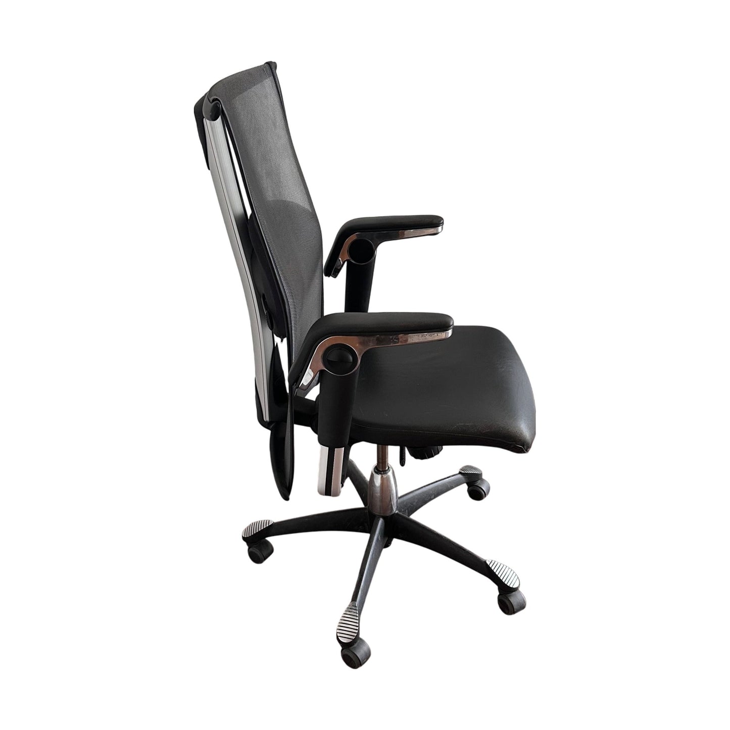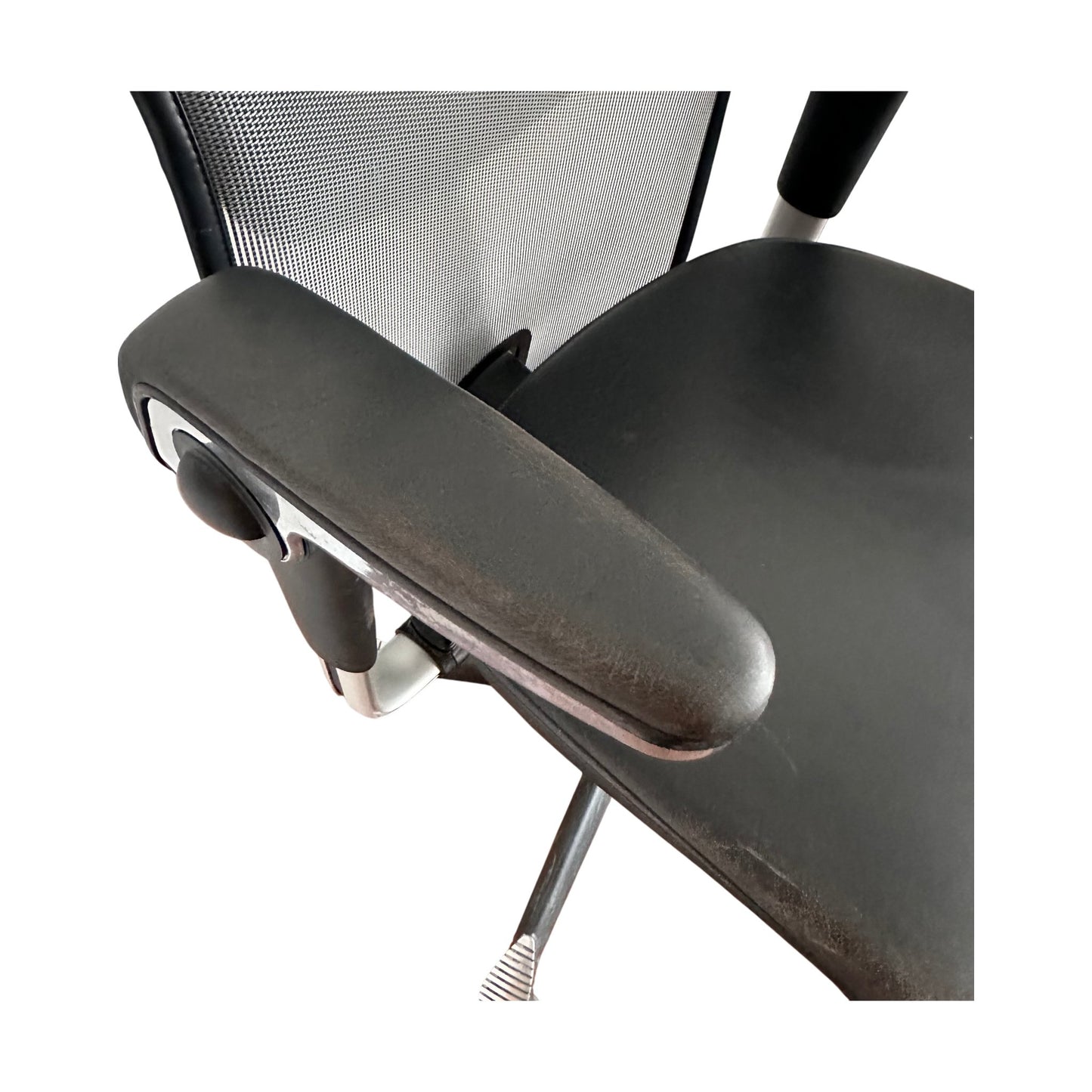 Stolen er i godt brukt stand med merkbare slitasjer på skinnsetet og generelt i stoffet og rammen. Til tross for bruksmerkene, fungerer alle justeringsmekanismer som de skal, og stolen er fortsatt en pålitelig valg for kontoret.