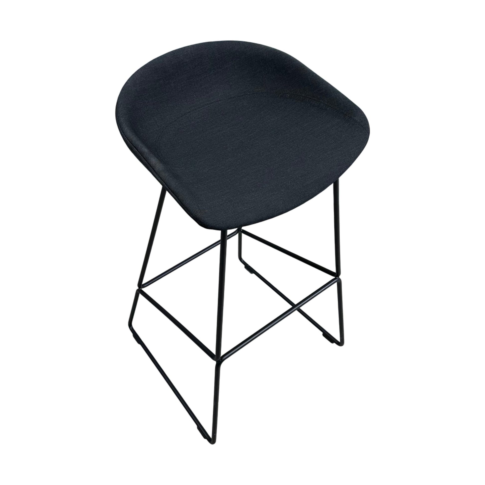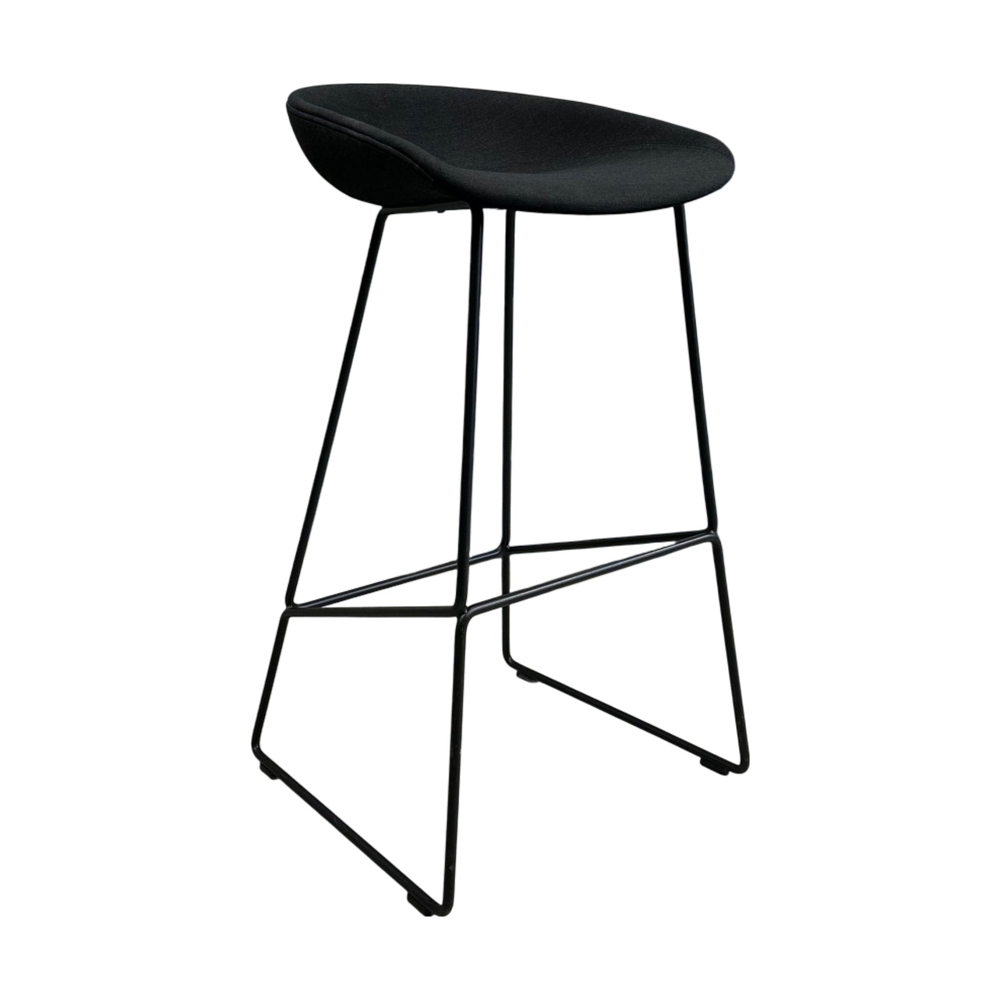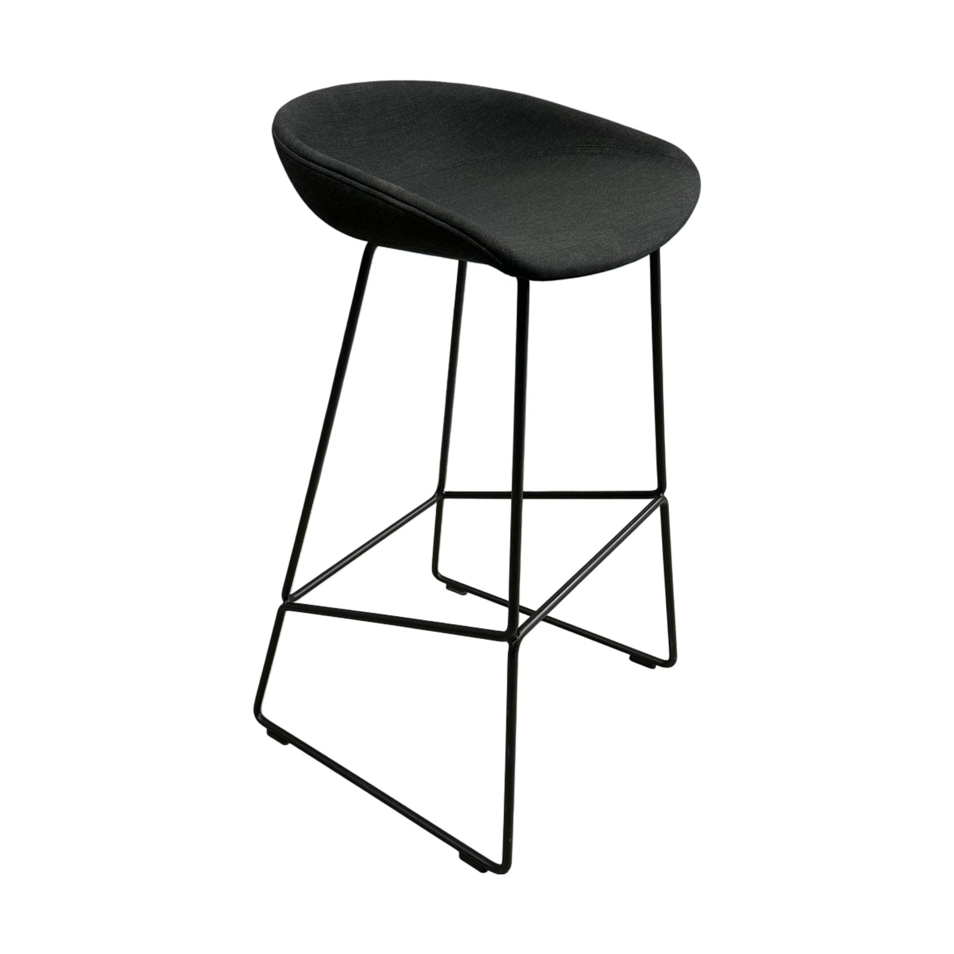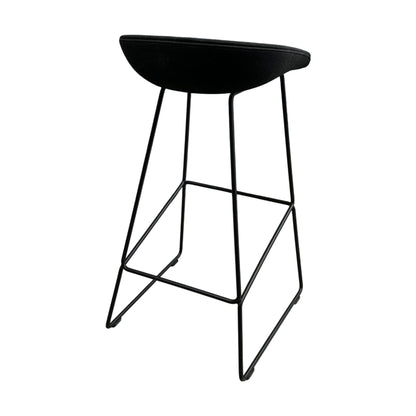 Elegant barstol fra Hay’s About a Chair-serie med setetrekk i sort tekstil og slanke, stilrene ben. Stolen kombinerer komfort og moderne design, og passer perfekt til kjøkkenøyer, barer eller spiseområder med høyere bord.