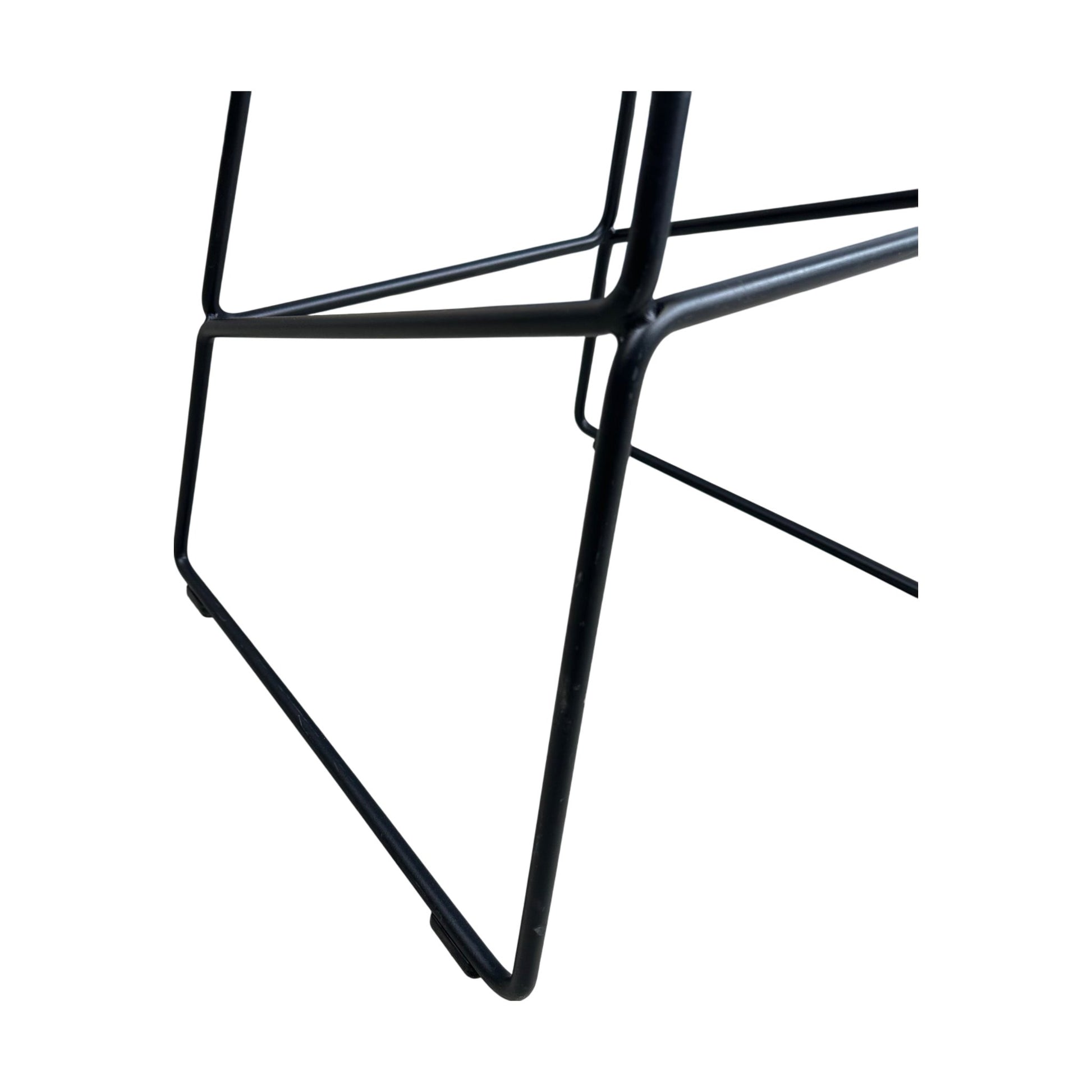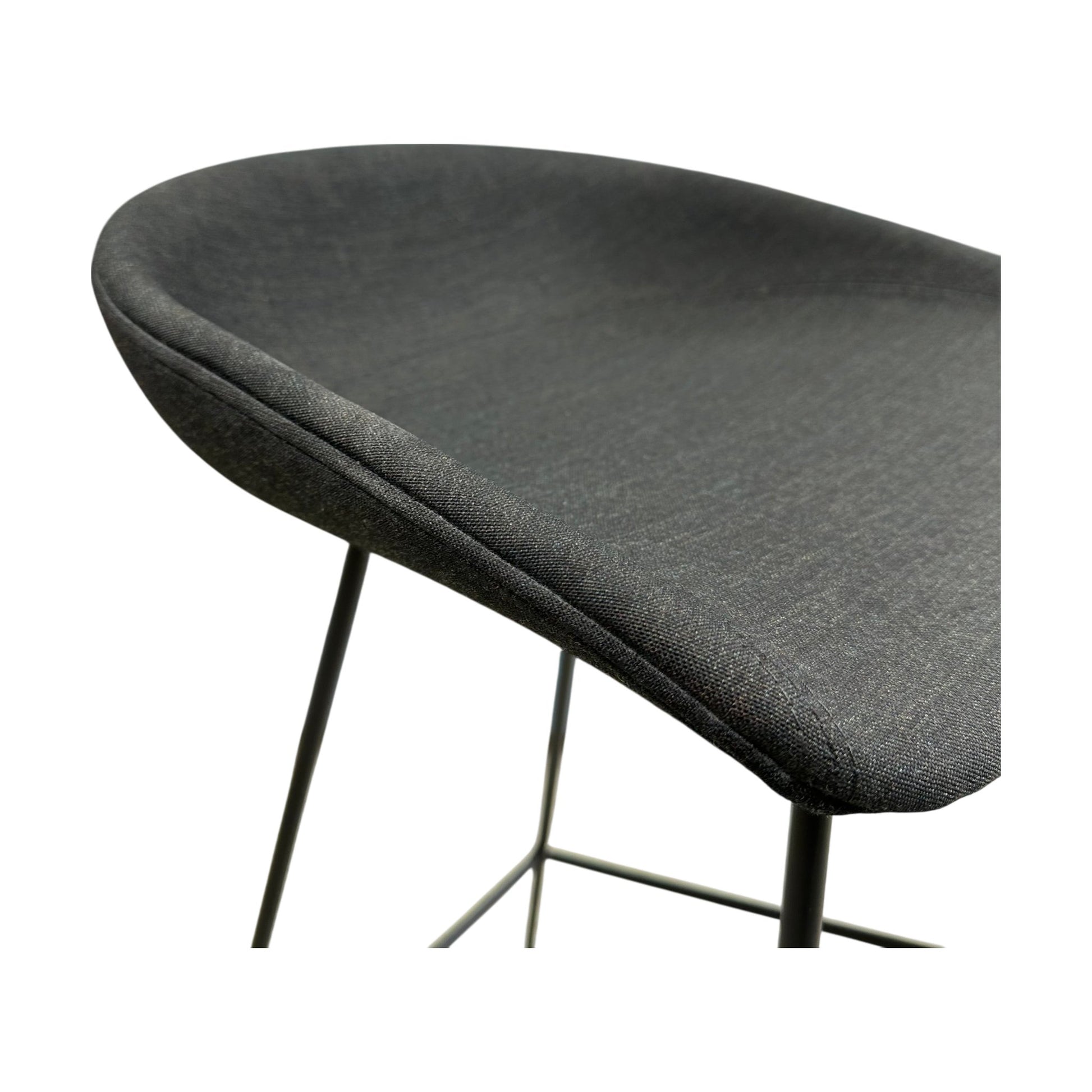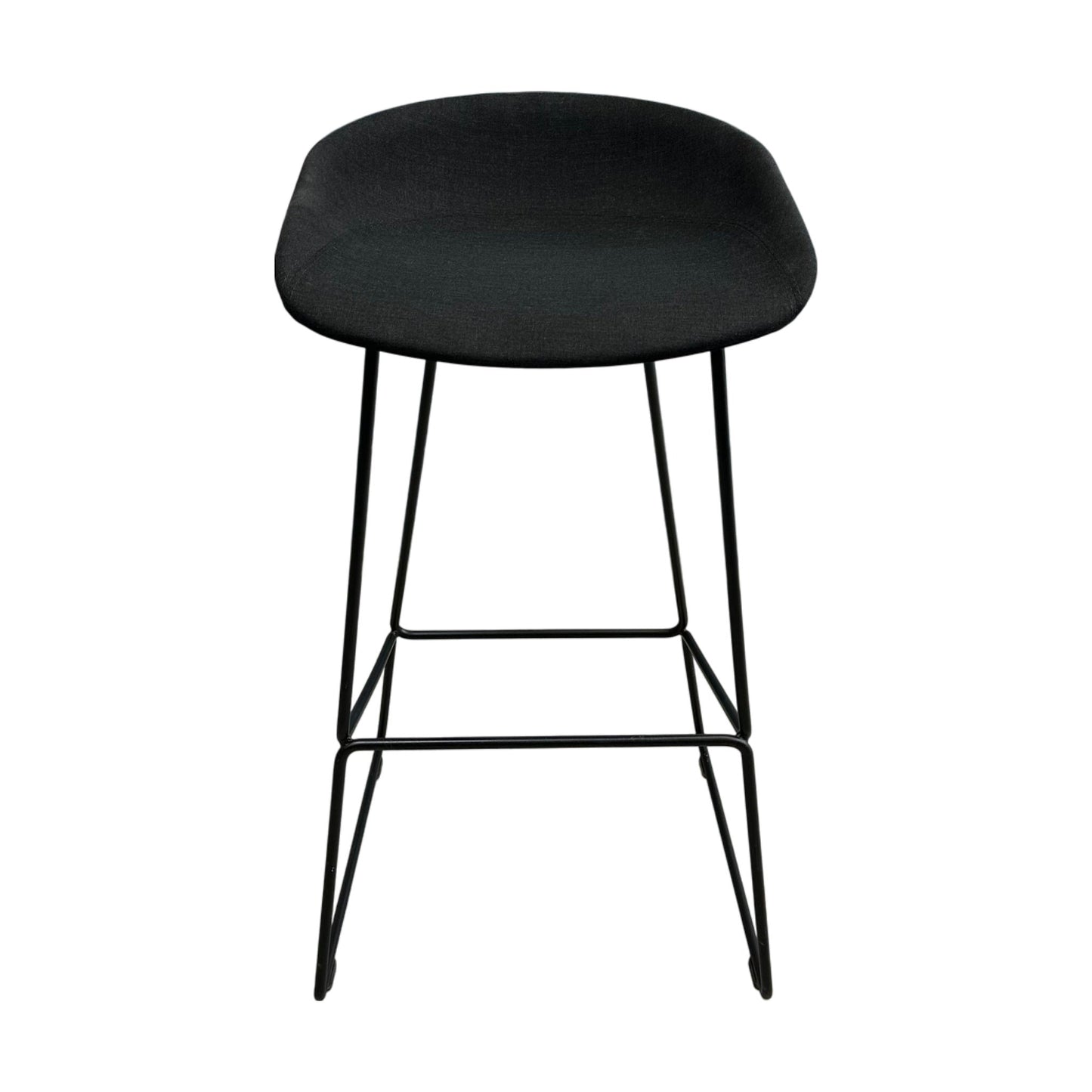 Elegant barstol fra Hay’s About a Chair-serie med setetrekk i sort tekstil og slanke, stilrene ben. Stolen kombinerer komfort og moderne design, og passer perfekt til kjøkkenøyer, barer eller spiseområder med høyere bord.