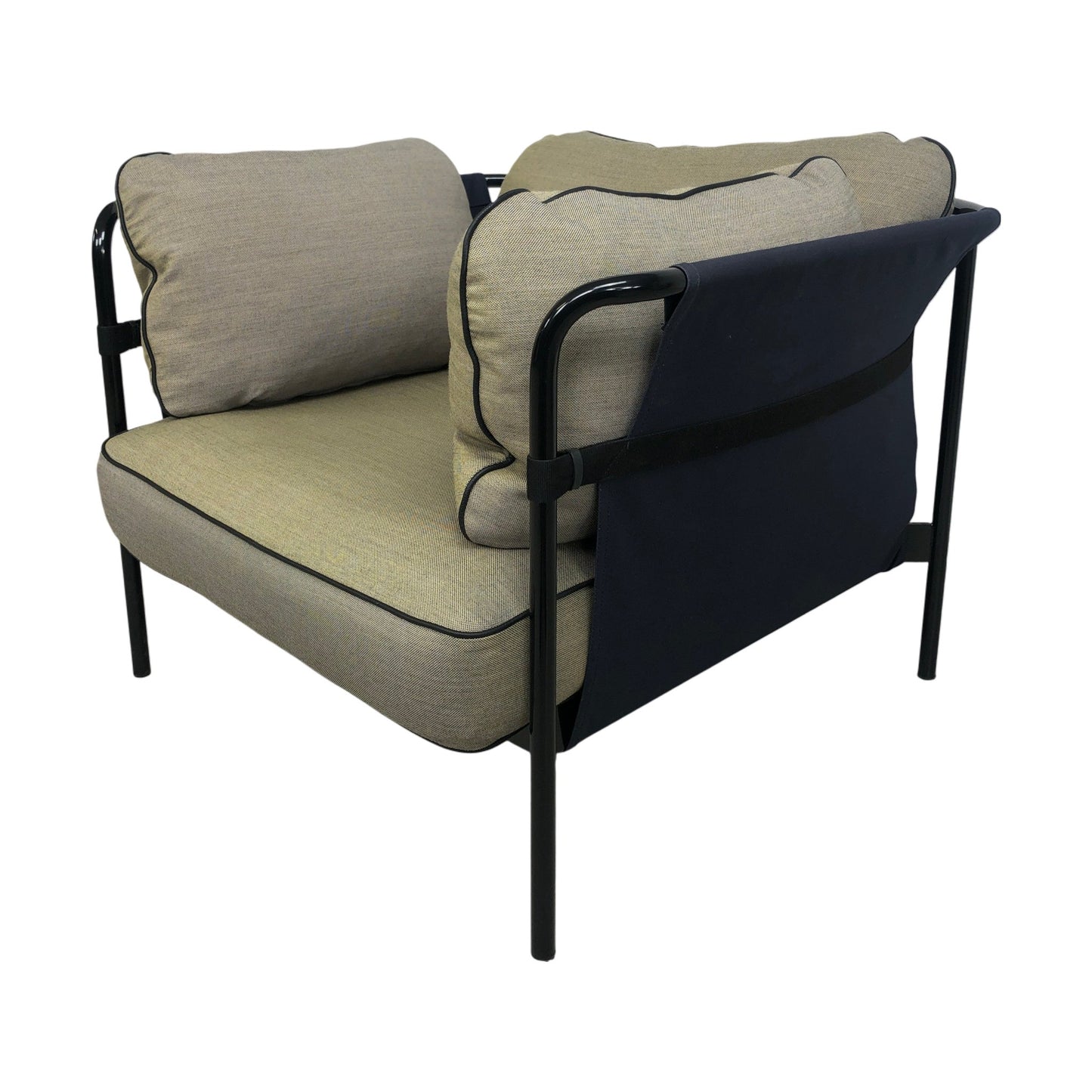 Tidløs stol fra Hay med en stilren sort metallramme med blått trekk. Lenestolen inkluderer fire beige puter med avtagbare trekk, noe som gir et friskt og livlig uttrykk til din stue eller arbeidsplass.