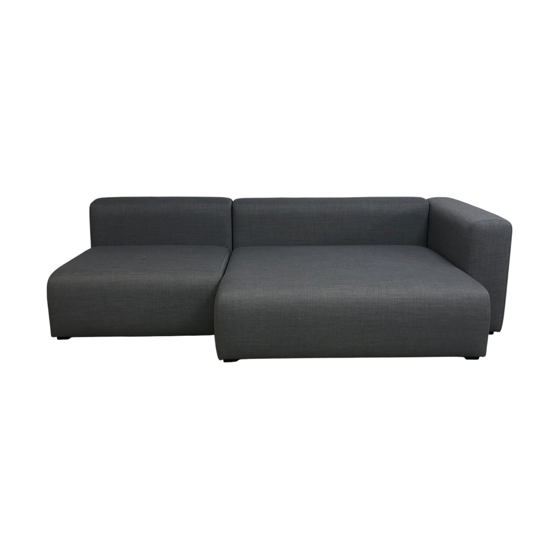 Moderne og stilren sofa med sjeselong fra HAY. Denne grå sofaen har et minimalistisk design med en myk, tekstiloverflate som gir et innbydende preg. Modulene er lett sammenkoblet, og den åpne enden gir mulighet for tilpasning med ekstra deler.