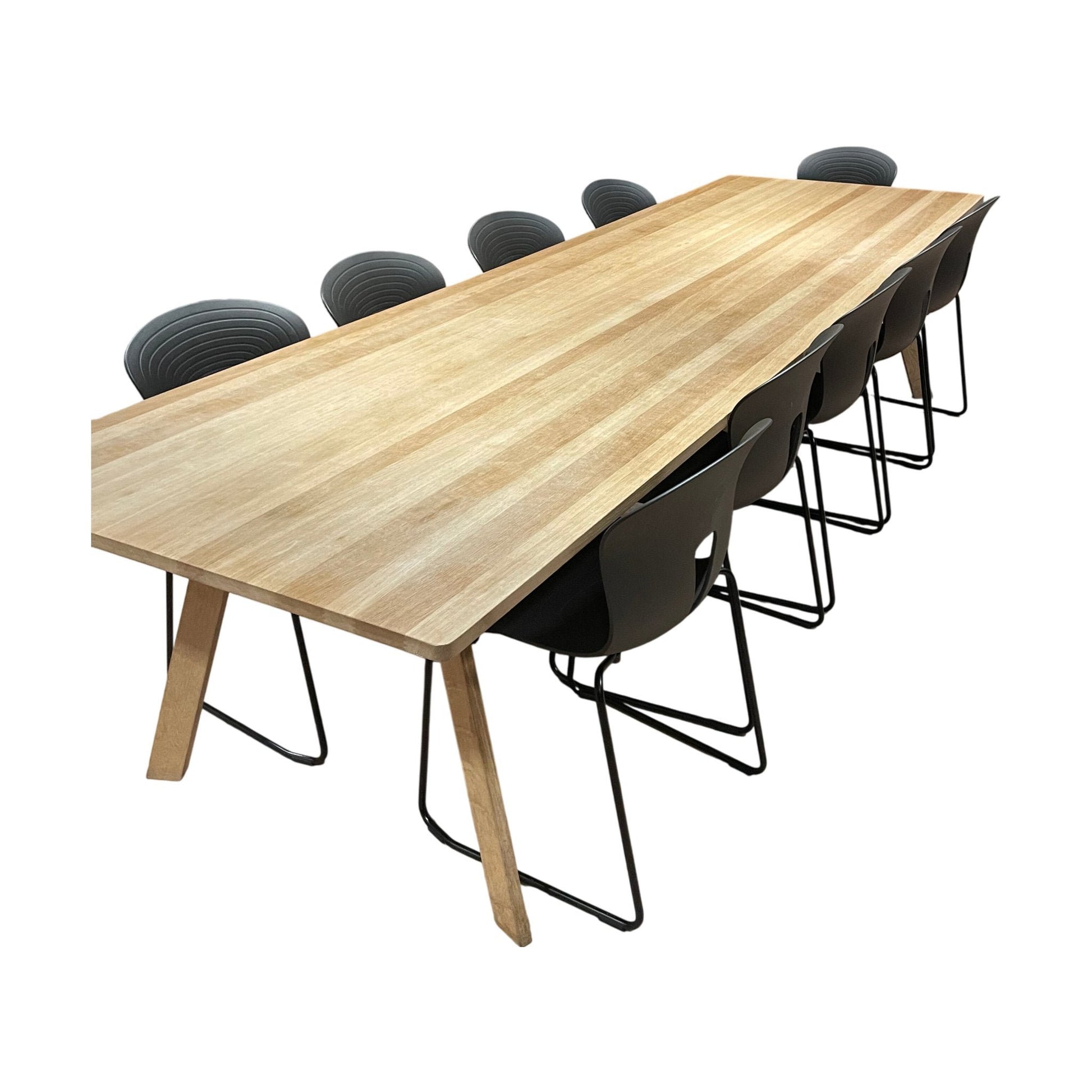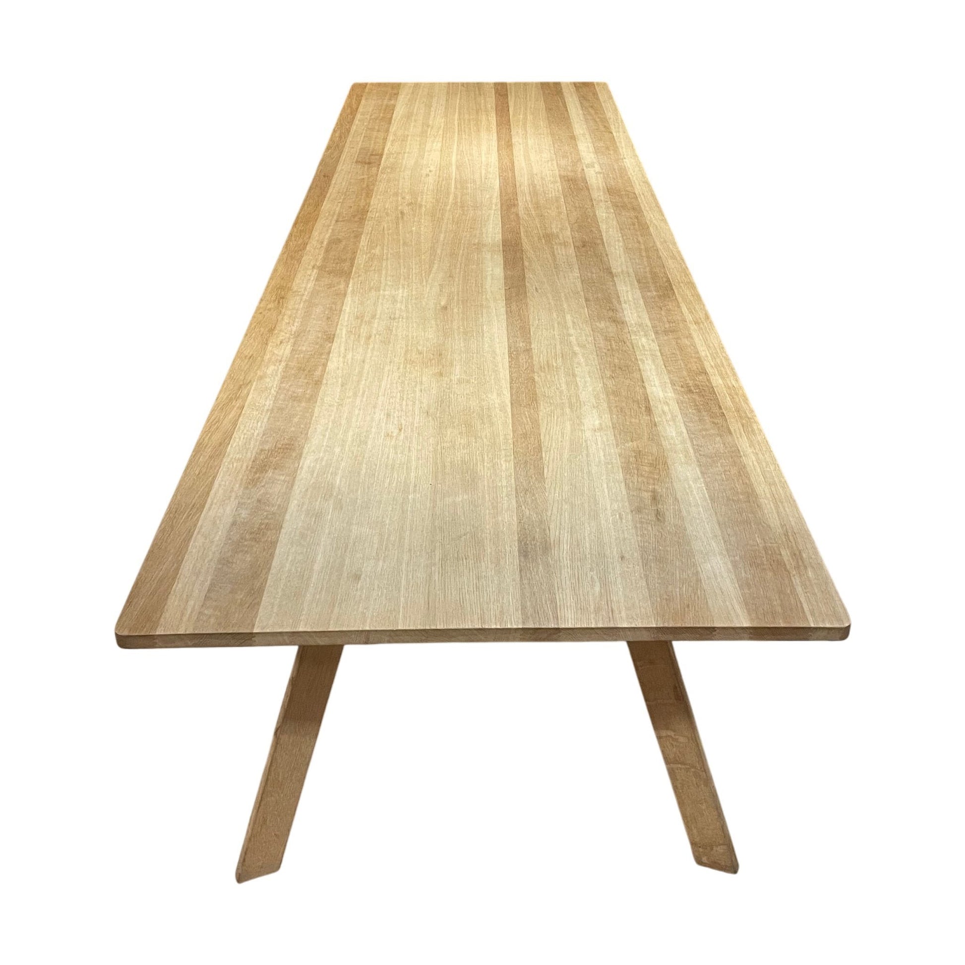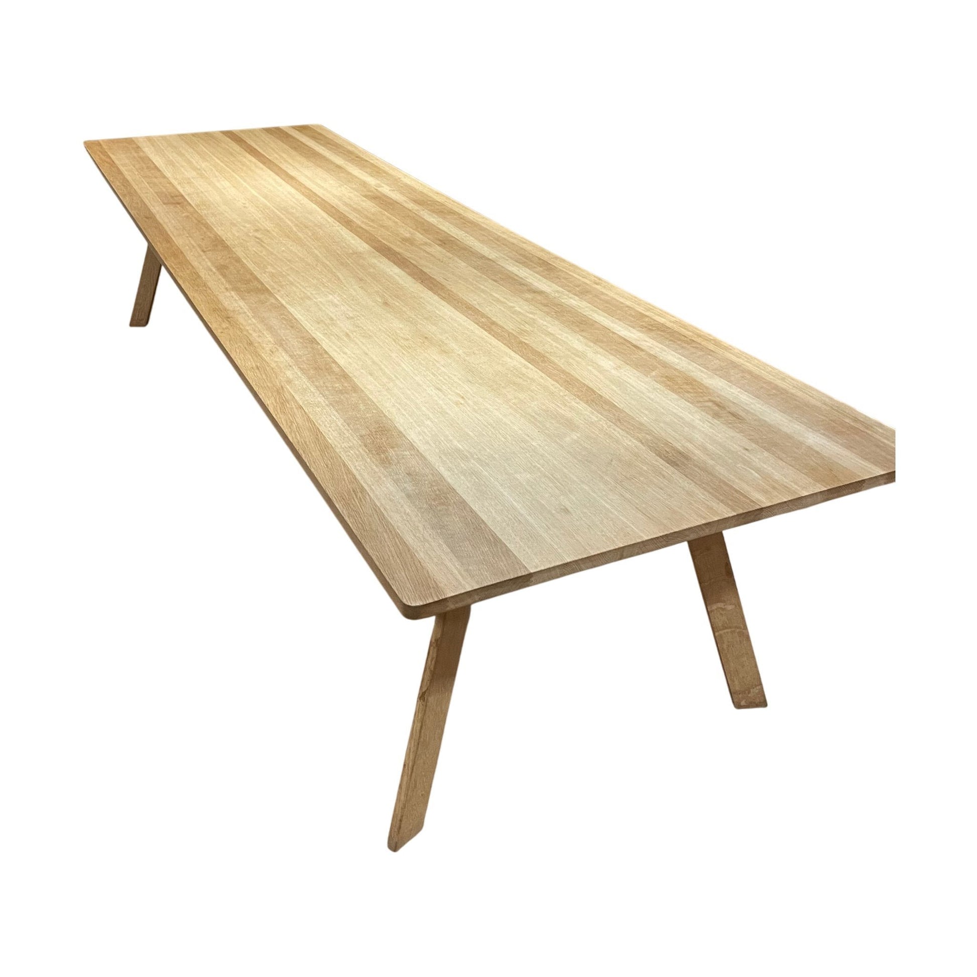 Stilrent helplate trebord med en imponerende lengde på 320 cm, perfekt for både store middagsselskaper og hverdagsbruk i romslige spiseområder. Bordplaten er laget av naturlig tre med et delikat trefarget design, som fremhever de varme nyansene i treverket. Den solide konstruksjonen og de skrå benene gir bordet et moderne og elegant uttrykk, samtidig som det gir nødvendig stabilitet.
