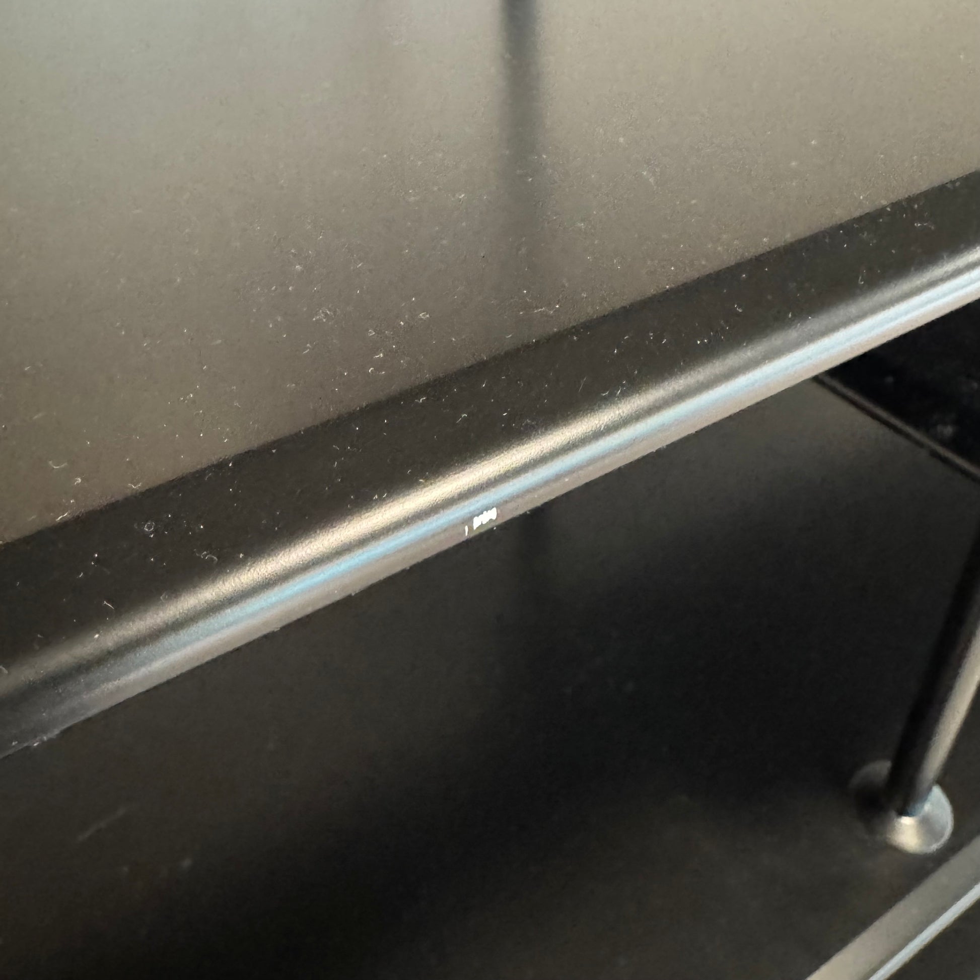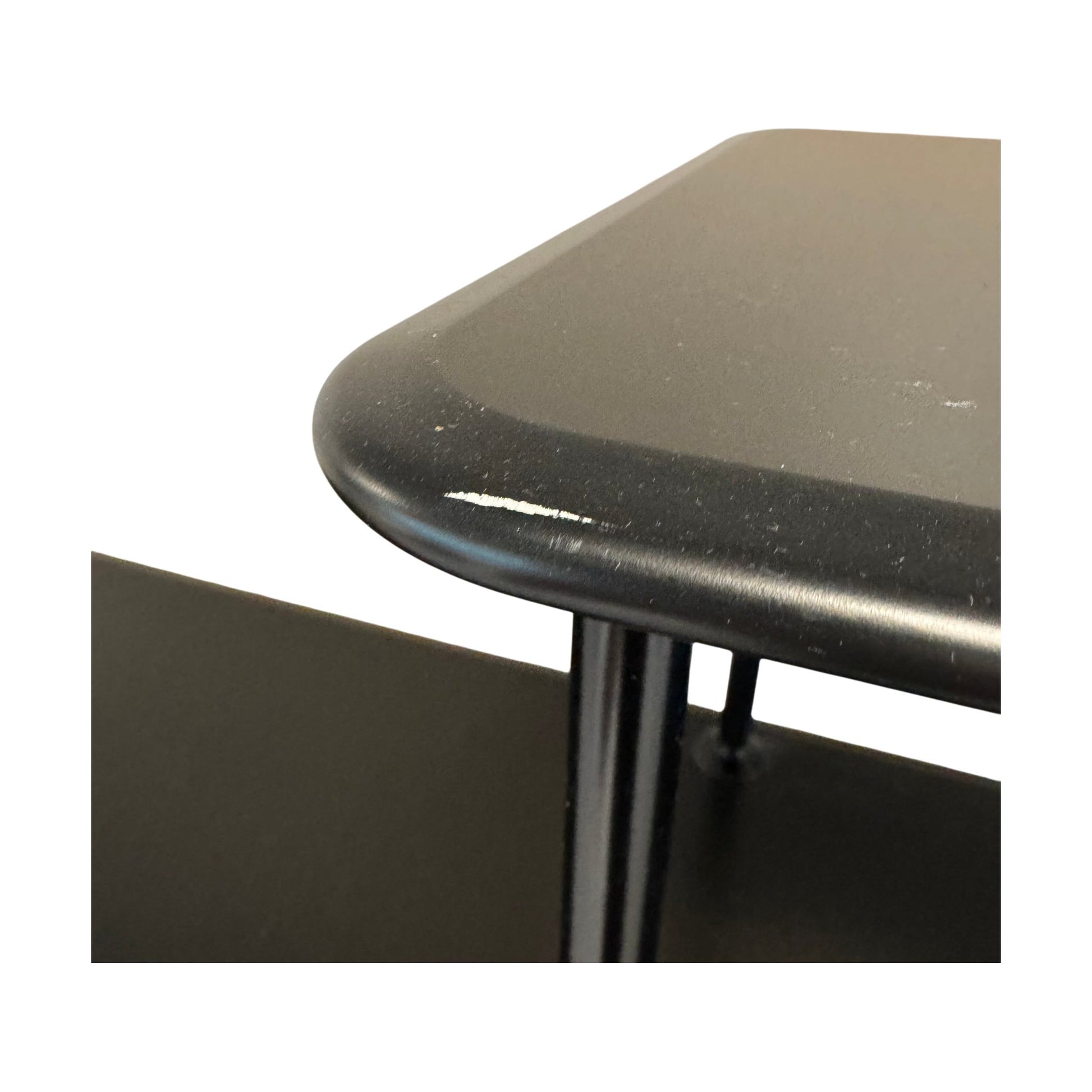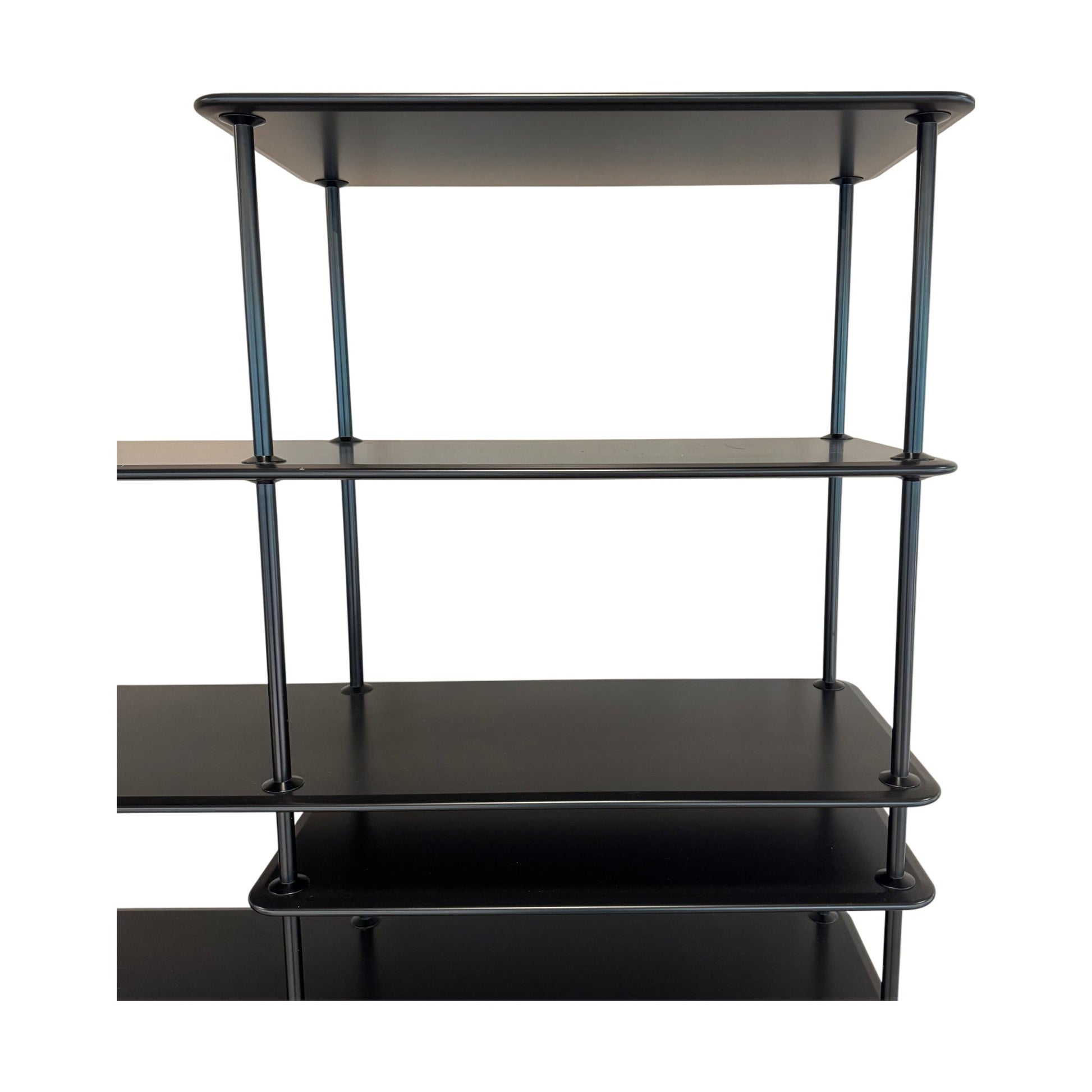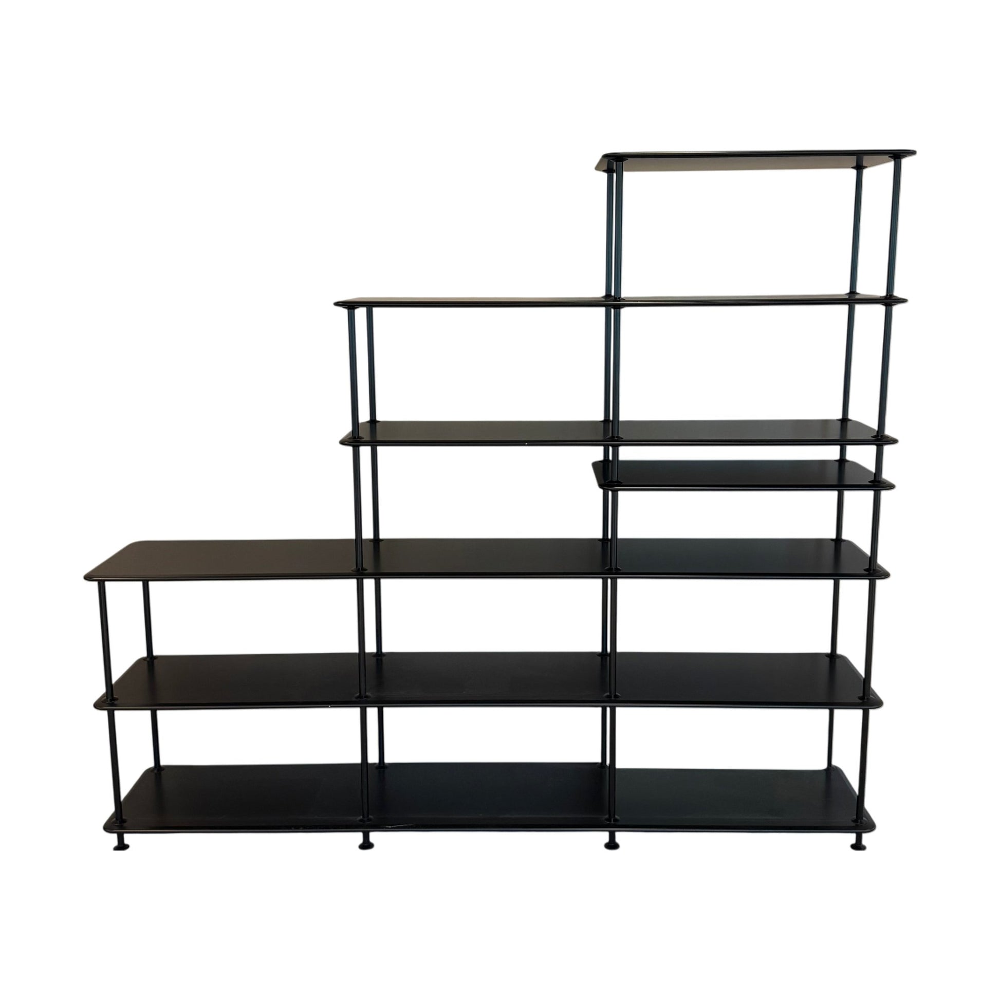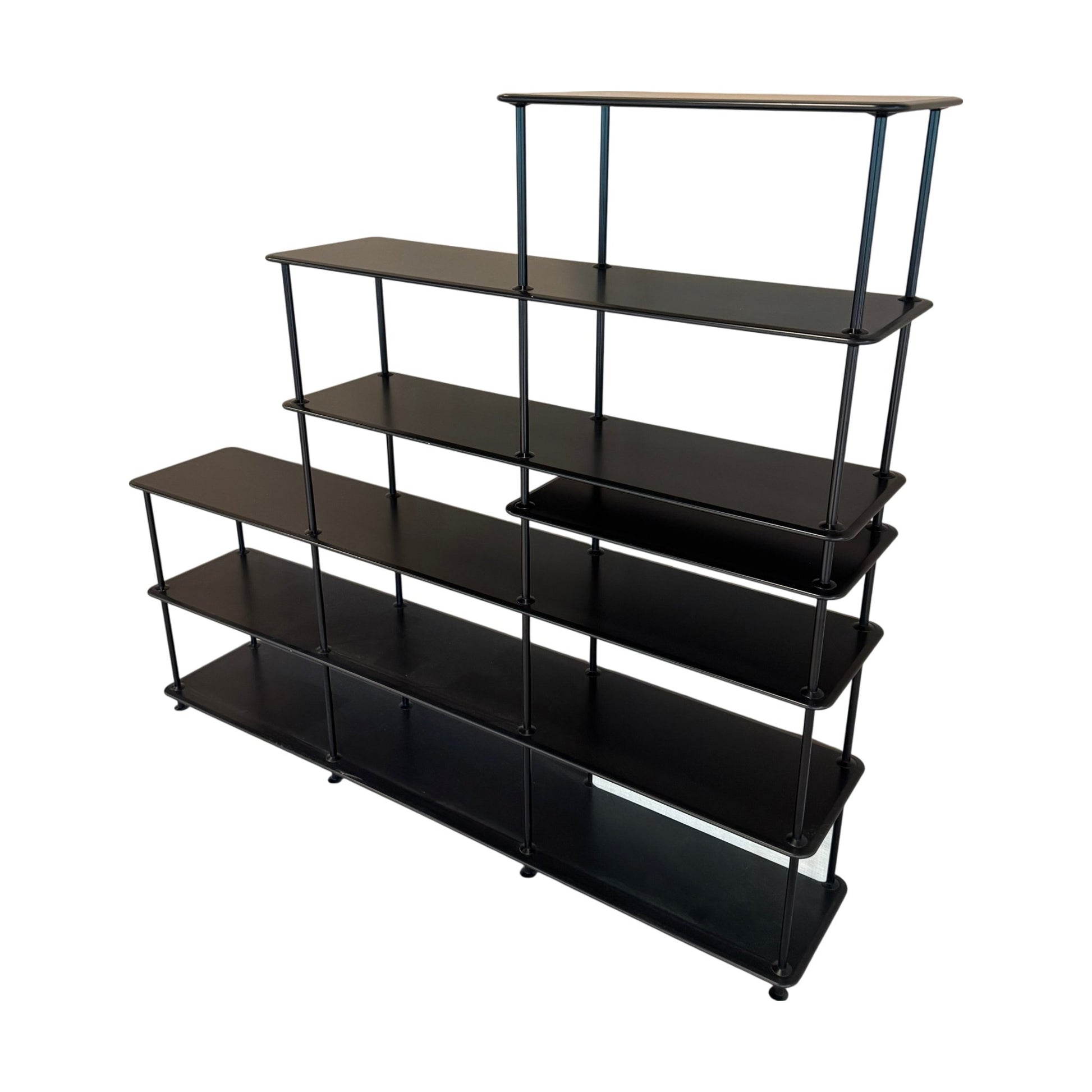 Moderne og stilren hyllereol i svart metall, ideell for kontoret. Denne hyllereolen har flere nivåer som gir fleksibel oppbevaring og et unikt, skulpturelt uttrykk. Den enkle, men funksjonelle designen gjør det enkelt å tilpasse oppbevaringen etter behov.