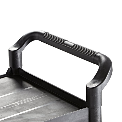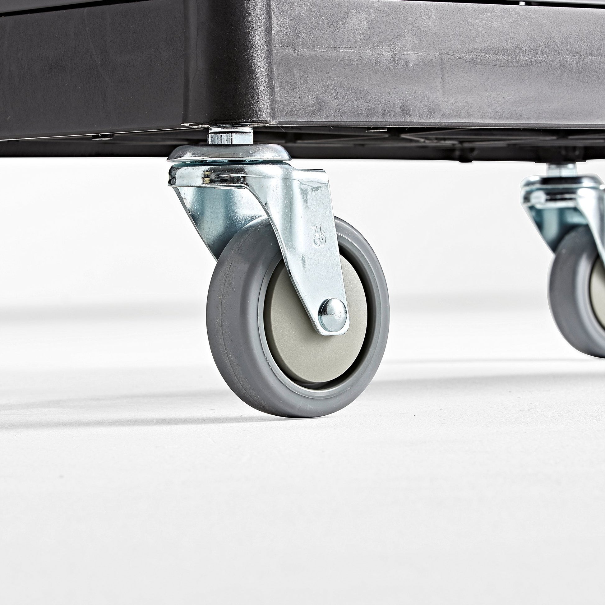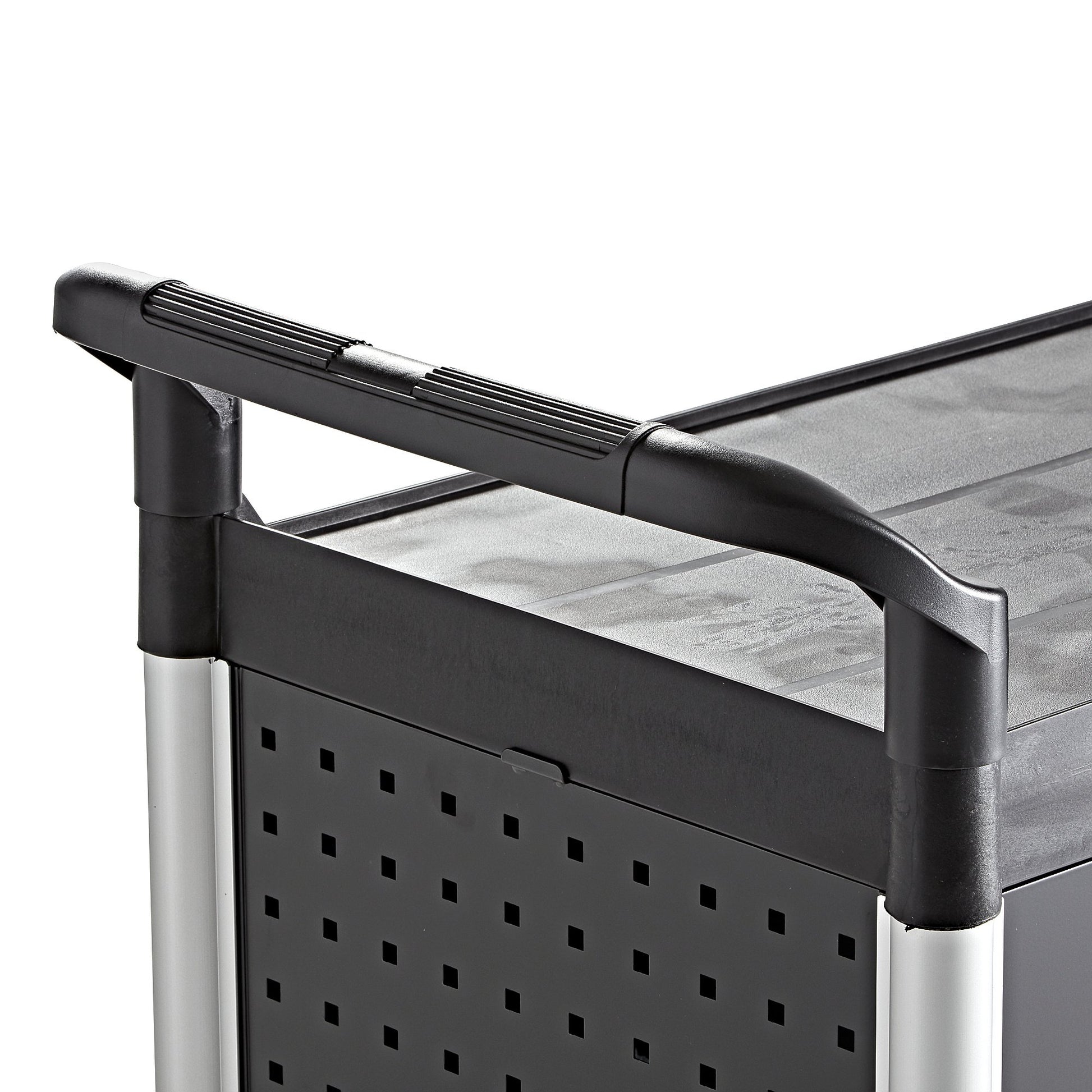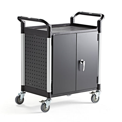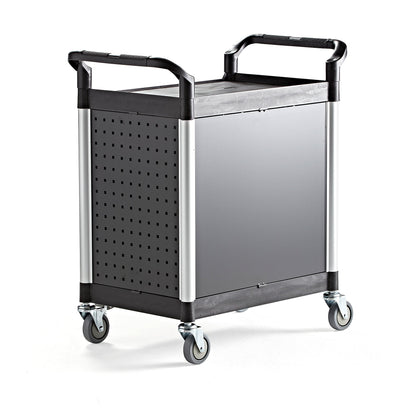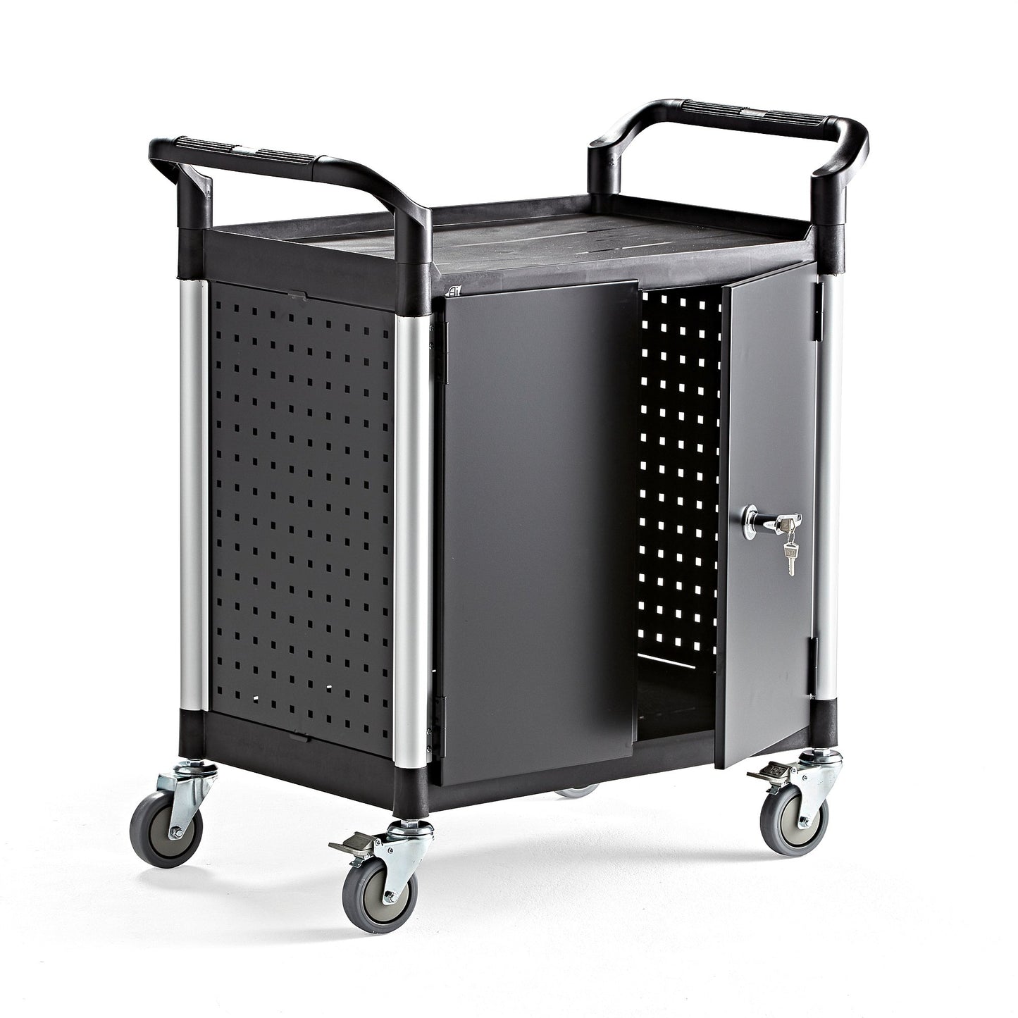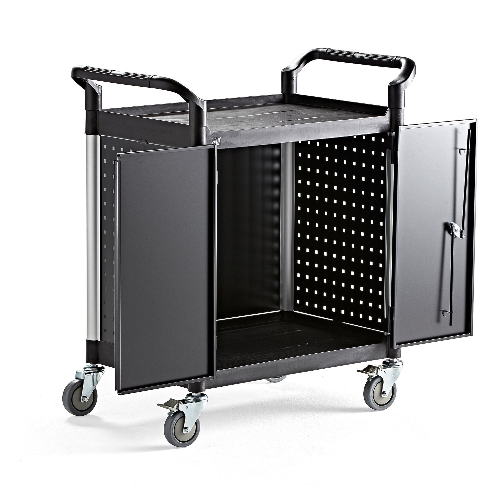 Vogn i stål med låsbart skap. Vognen har praktiske verktøypaneler på sidene for ekstra oppbevaringsplass og hyller i plast med opphøyde kanter. Fire svingbare hjul og praktiske håndtak på hver kortside gjør at vognen er enkel å flytte.