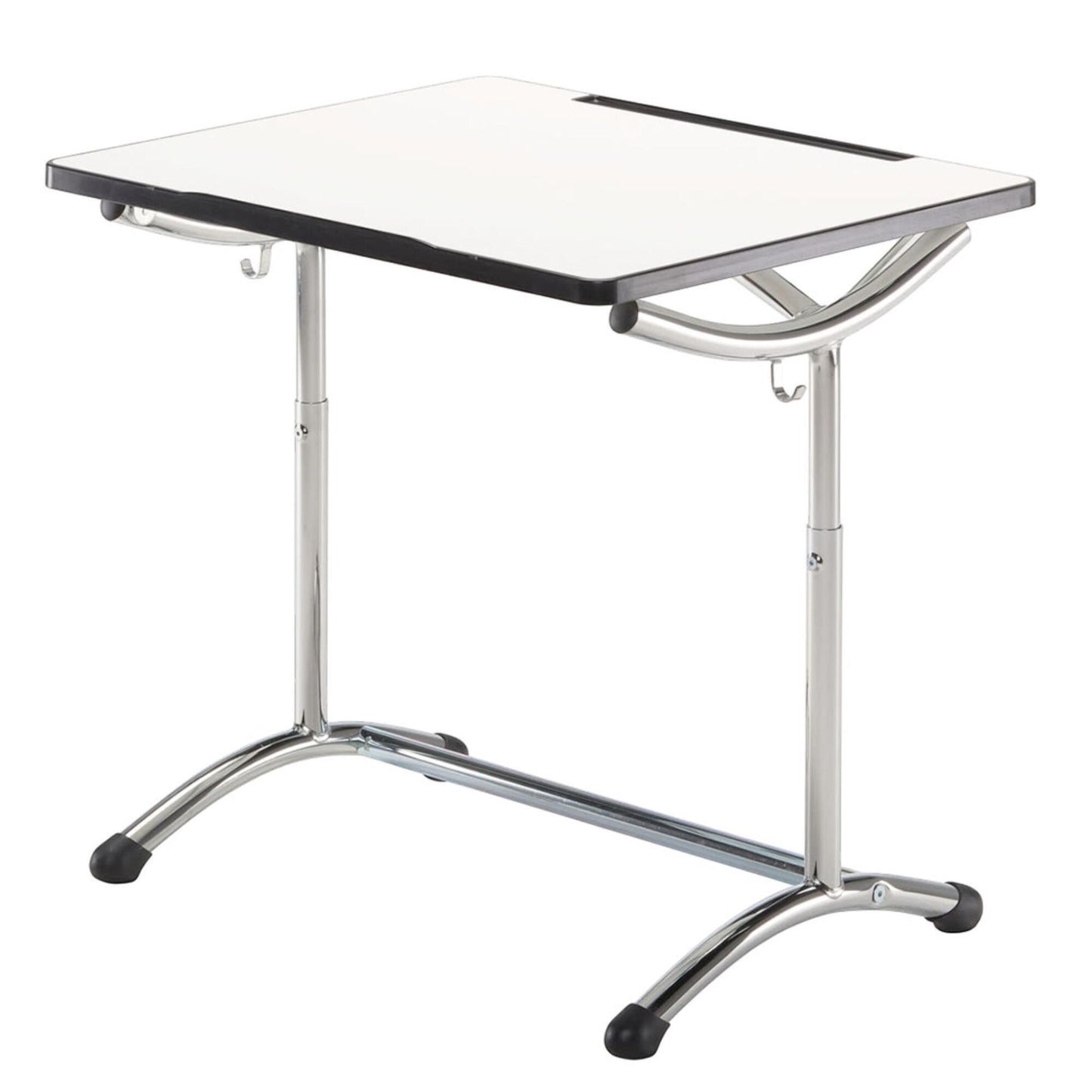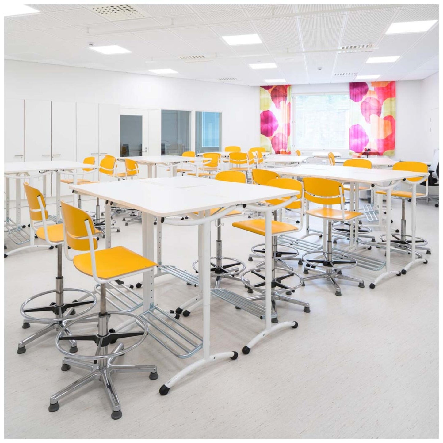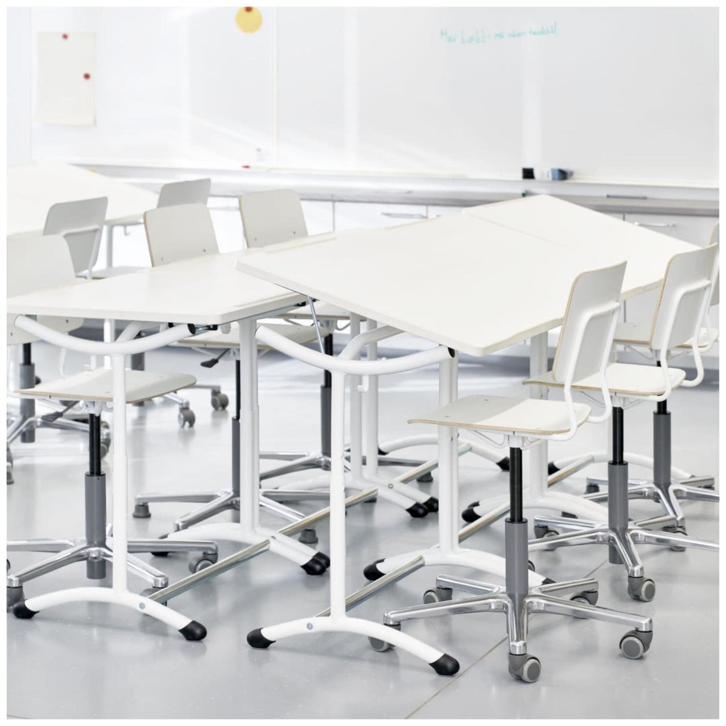 Bordet har en justerbar høyde og en vinklingsbar plate, noe som forbedrer brukerkomforten og ergonomien for elevene. Det er utstyrt med detaljer som sikkerhetsmargin på de vippbare lokkene, krok for vesker, feste for stol og et fotdesign som sikrer enkel rengjøring og sikkerhet. Det perfekte valget for en pedagogisk setting som verdsetter funksjonalitet og elevkomfort.