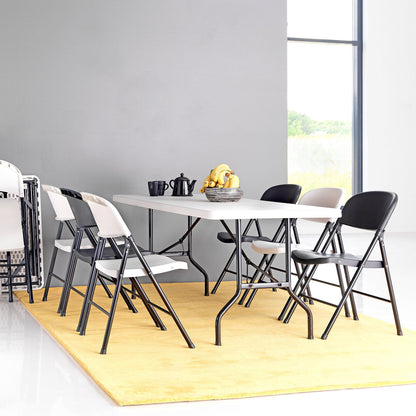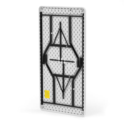Praktisk sammenleggbart bord med svartlakkert understell og bordplate i hvit plast. Dette bordet tar minimal plass ved lagring, perfekt for fleksible arbeidsområder og møter. Ideelt for både kontor og hjemmekontor.