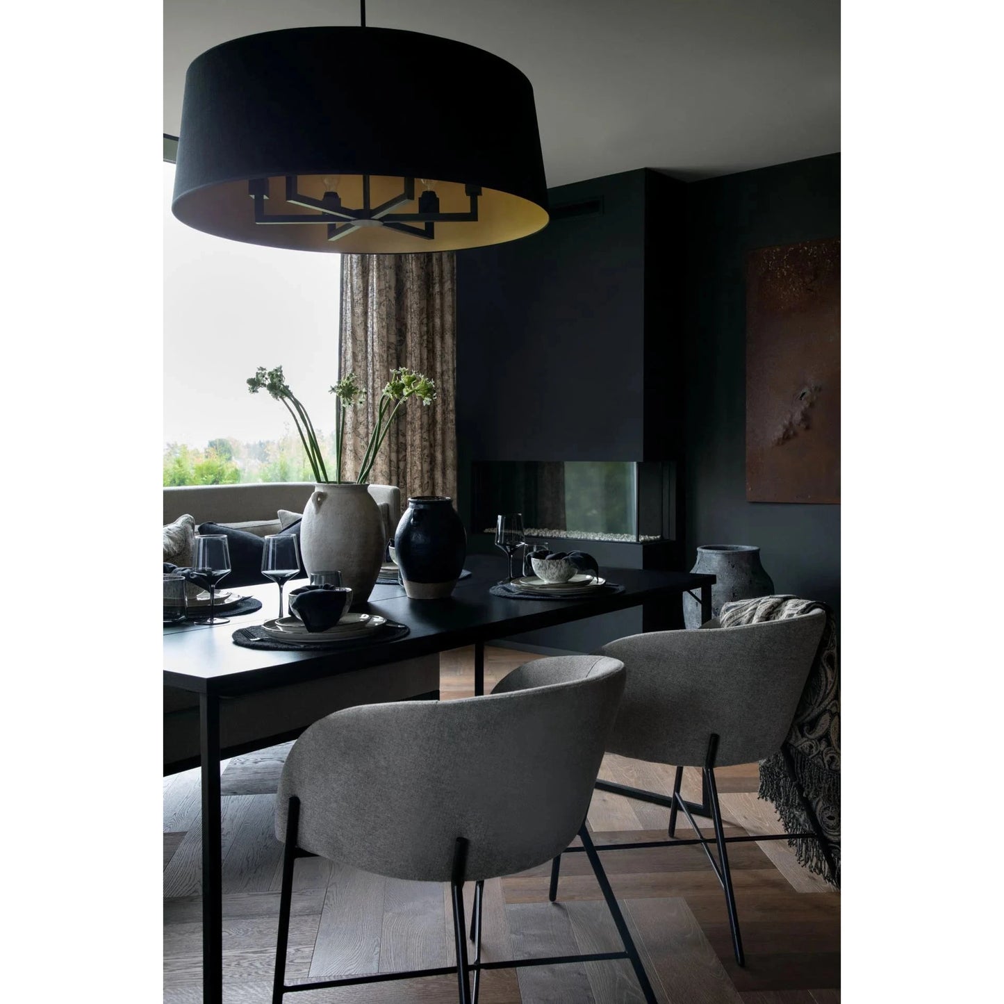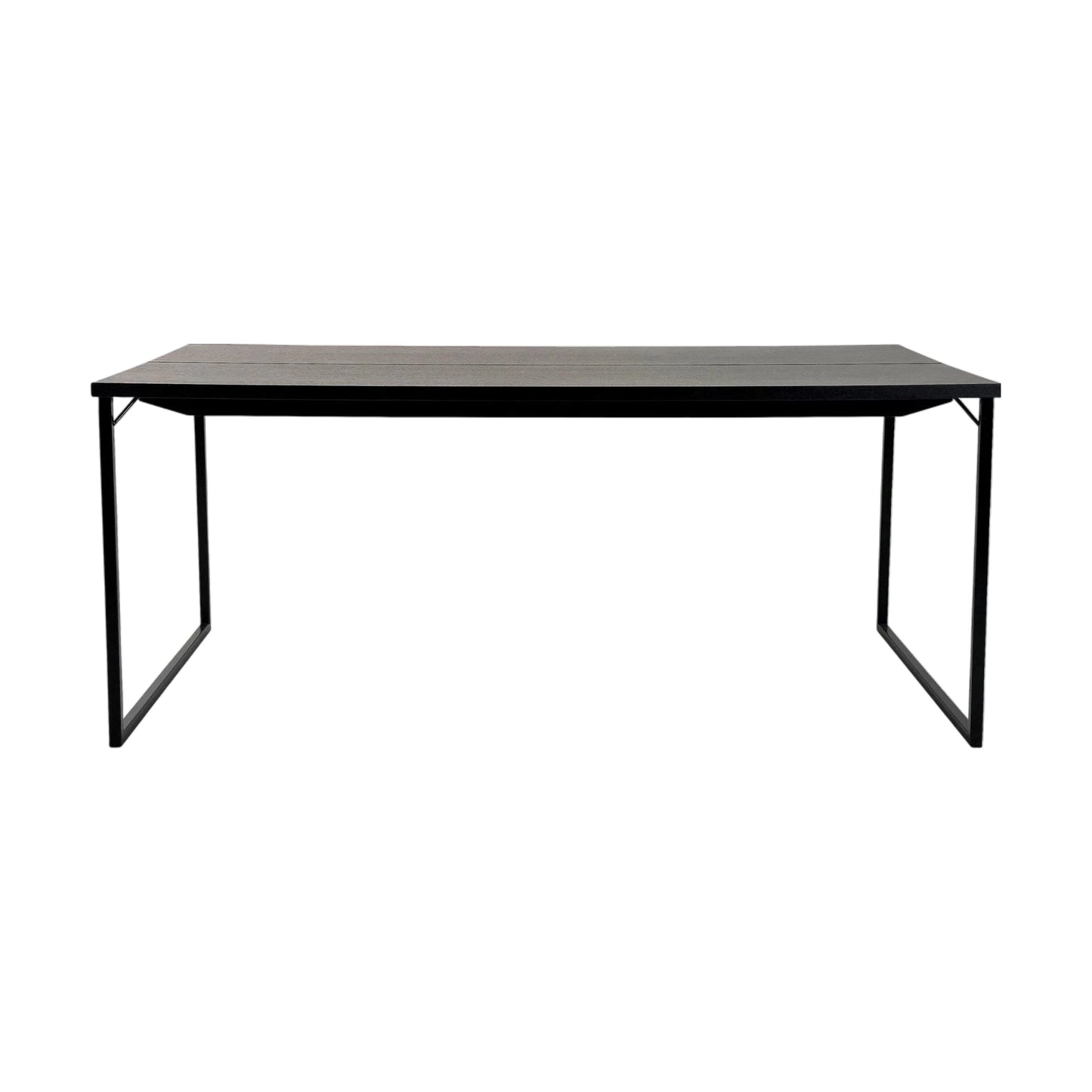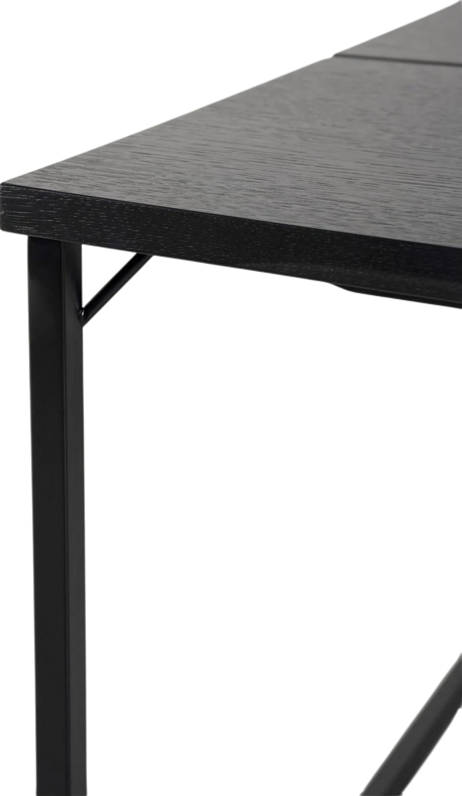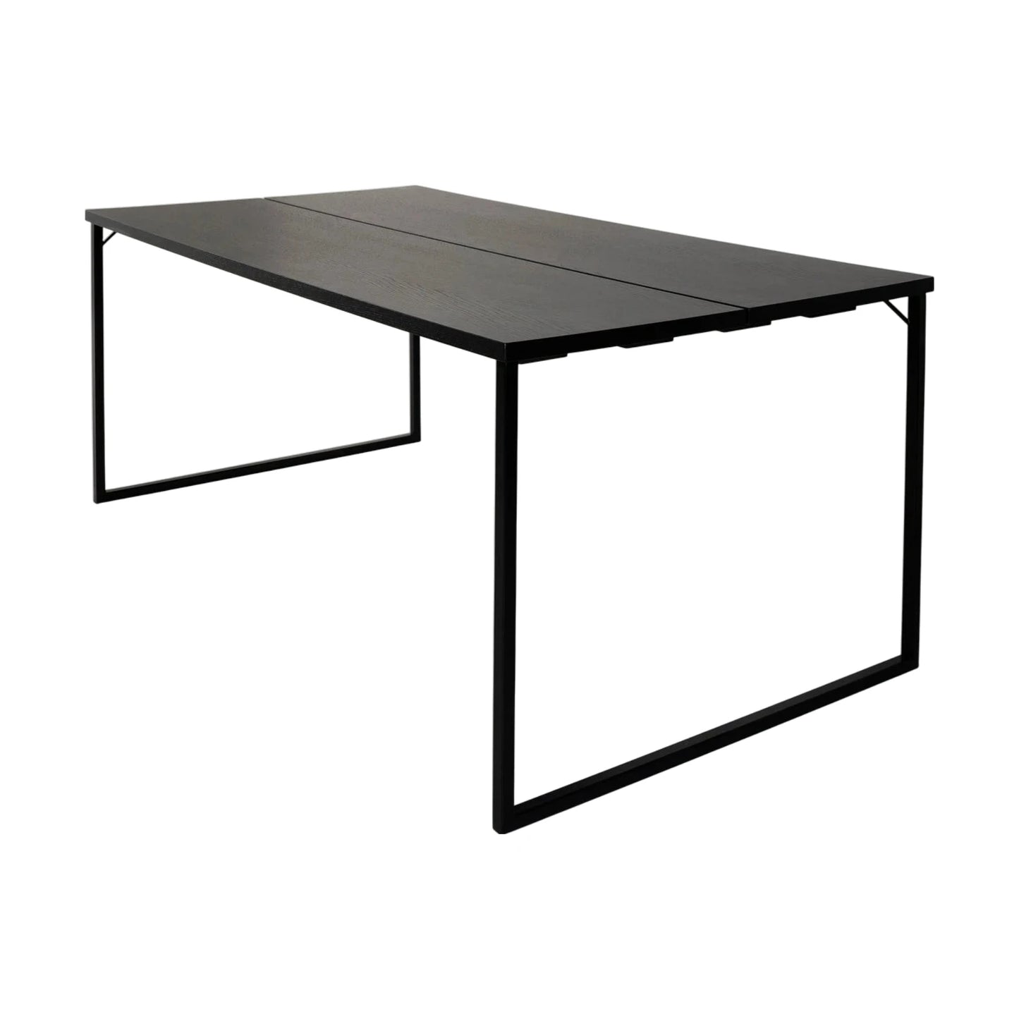 Stilrent spisebord med slank utforming i skandinavisk minimalisme. Den todelte bordplaten fremhever det stramme uttrykket og gir en spennende kontrast til strukturen i trematerialet. Bordplaten er laget i sortlakkert eikefiner, med forsterkninger i heltre eik på undersiden. Benrammen er i robust, sortlakkert stål.