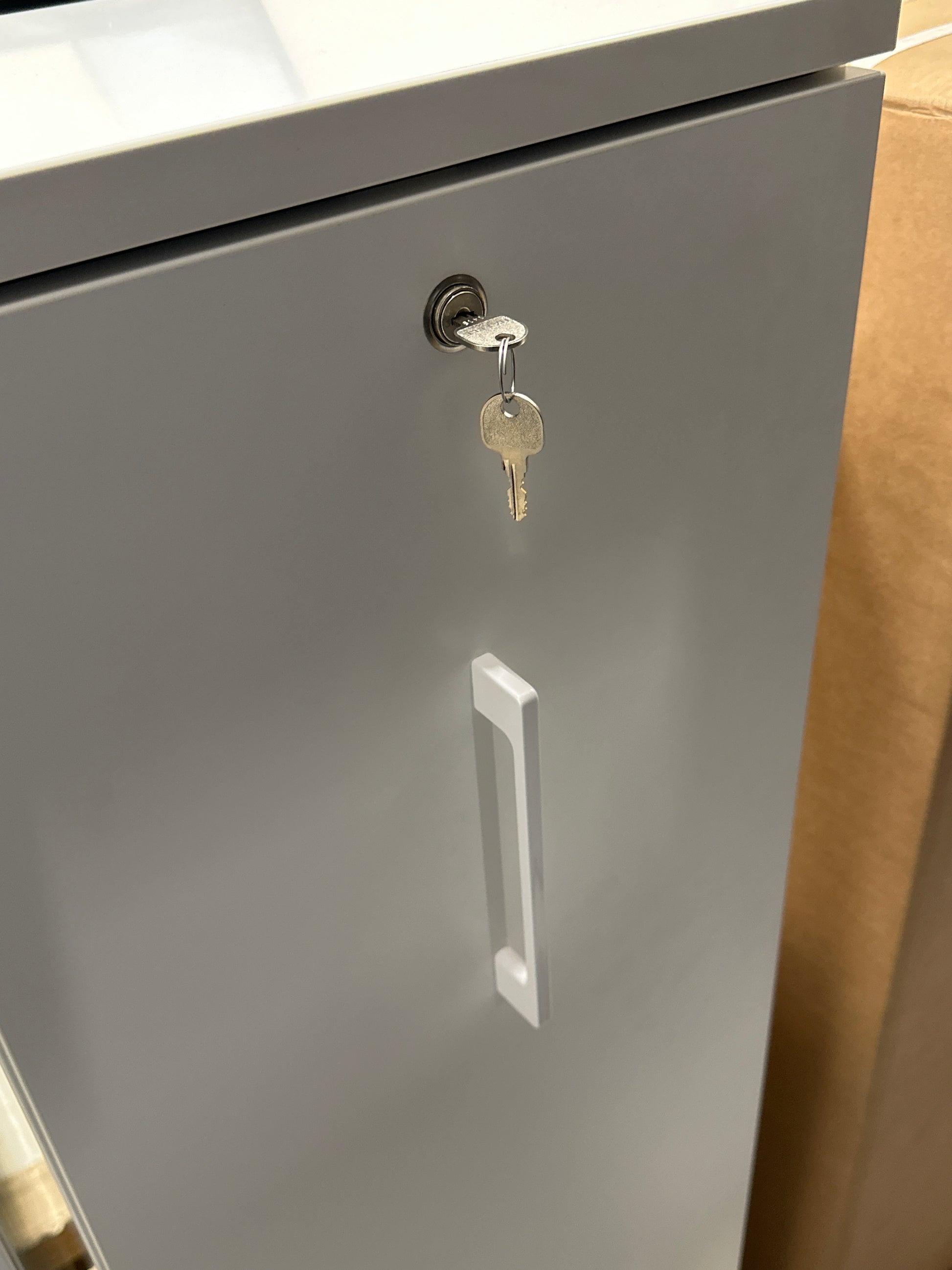 Skapet har et annet håndtak (ikke original), men dette påvirker ikke bruken. Et godt valg for de som ønsker en funksjonell og stilren oppbevaringsløsning.