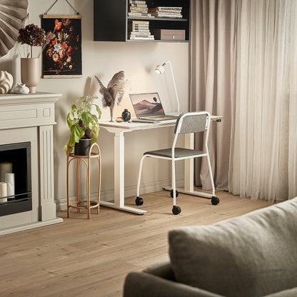 Lite og fleksibelt skrivebord for en liten arbeidsplass eller for personer som jobber hjemmefra. Skrivebordet har et høydejusterbart stativ med antikollisjon og skrå hjørner som gir et mykt inntrykk. Med bordet får du god ergonomi på liten plass! Bordplaten har noen merker på toppen, dette er synlig med påvirker ikke bruken til bordet (avbildet).