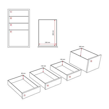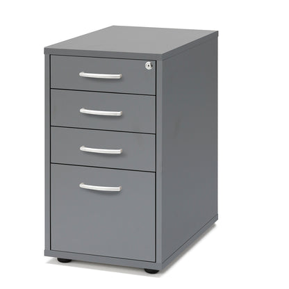 Flexus skuffeseksjon med låsbare skuffer, grå aluminiumshåndtak og sentrallås.