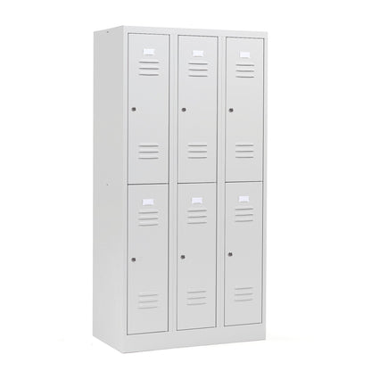 Komplett garderobeskapsmodul fra AJ Produkter, designet for effektiv oppbevaring med perforering i over- og underkant av døren. Utstyrt med 6 rom m/dører, etikettholder, klesstang med tre kroker, og sylinderlås, passer modulen perfekt til kontoret og garderober.