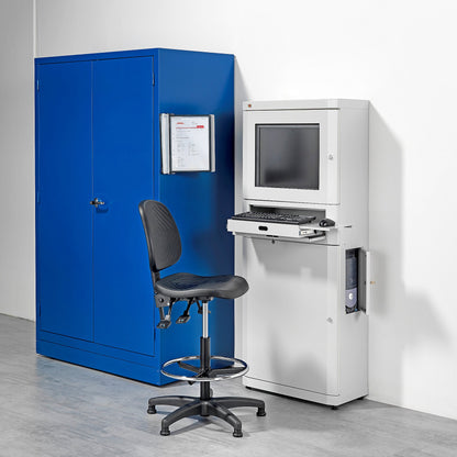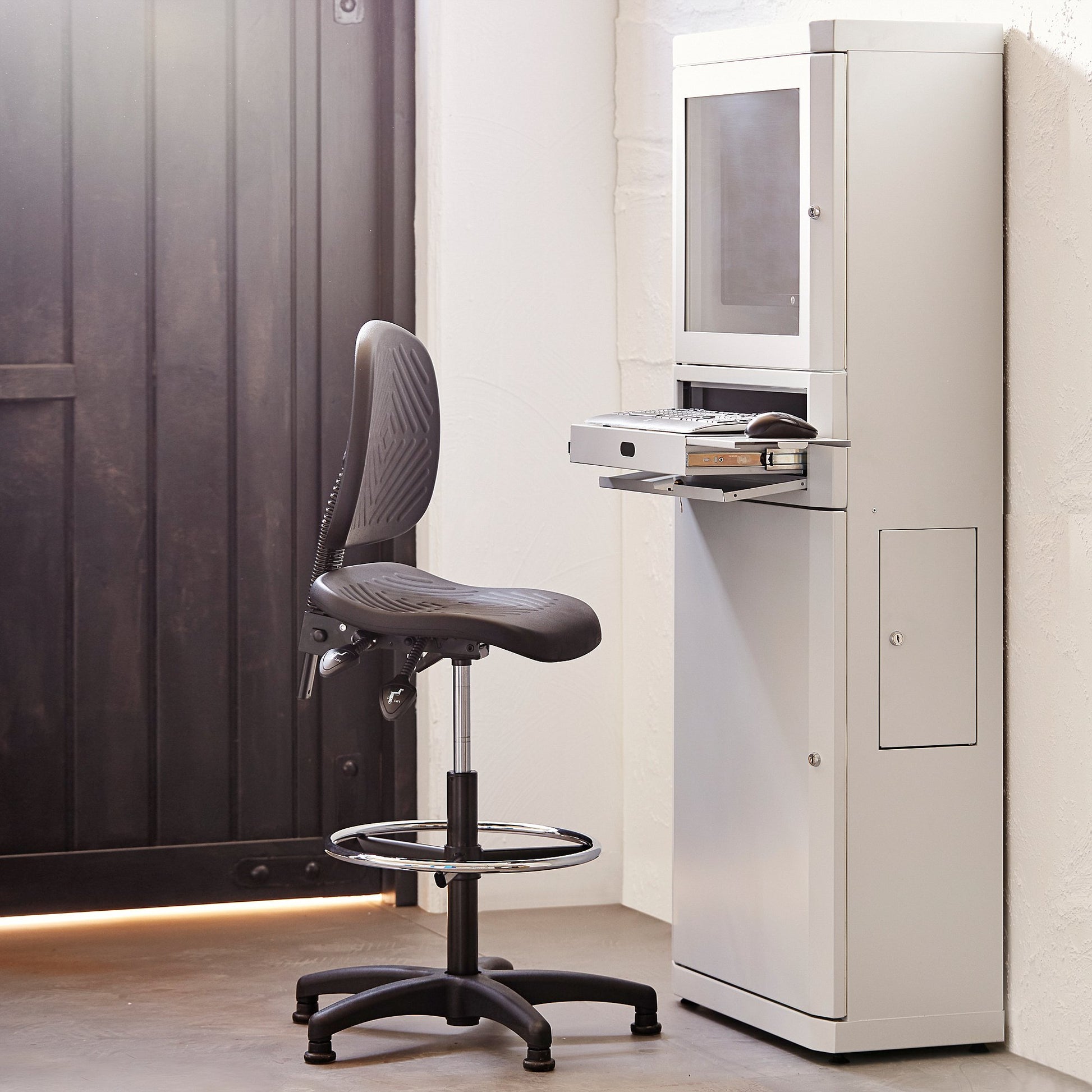 Arbeidsstol med synkronmekanisme som følger kroppens bevegelser. Justerbar rygghøyde, ryggdybde og setevinkel. Sittehøyden justeres med en kraftig gasspatron.