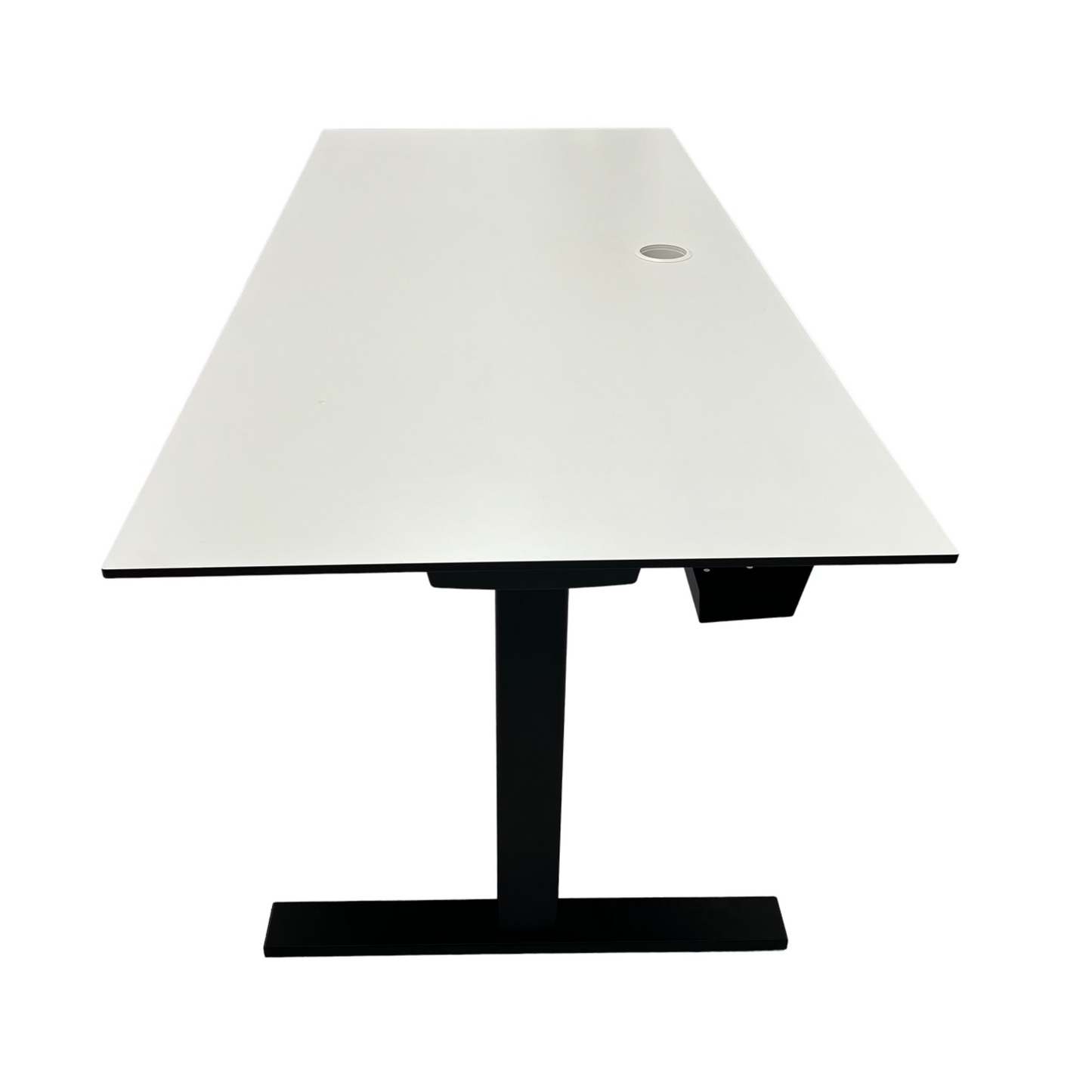 Elektrisk hev/senk skrivebord fra Holmris. Moderne og ergonomisk bord med hvit bordplate, sort understell og sort styreenhet.