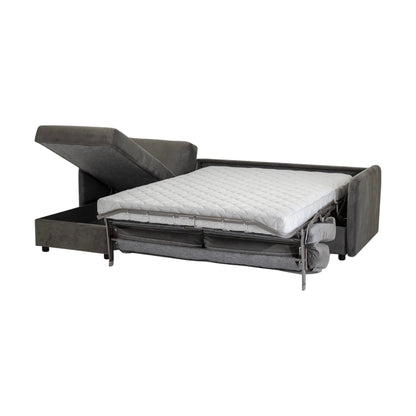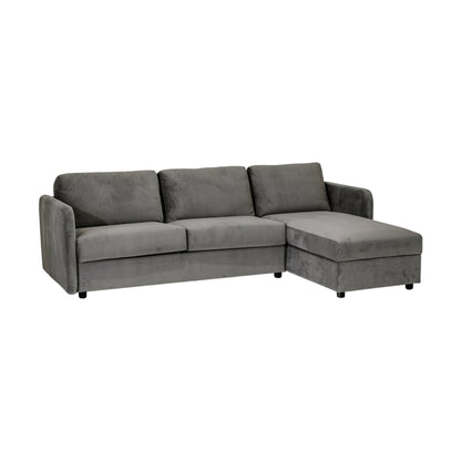 Stilfull sovesofa fra Hovden, perfekt for både stue og gjesterom. Denne 2-seteren har en praktisk chaiselong på høyreside, noe som gir ekstra plass til avslapning. Sofaen er trukket i mykt velourstoff i fargen Seven 65 grey, som gir en behagelig og innbydende følelse. Med en 140 cm bred pocketmadrass blir det enkelt å forvandle sofaen til en komfortabel seng for overnattingsgjester.