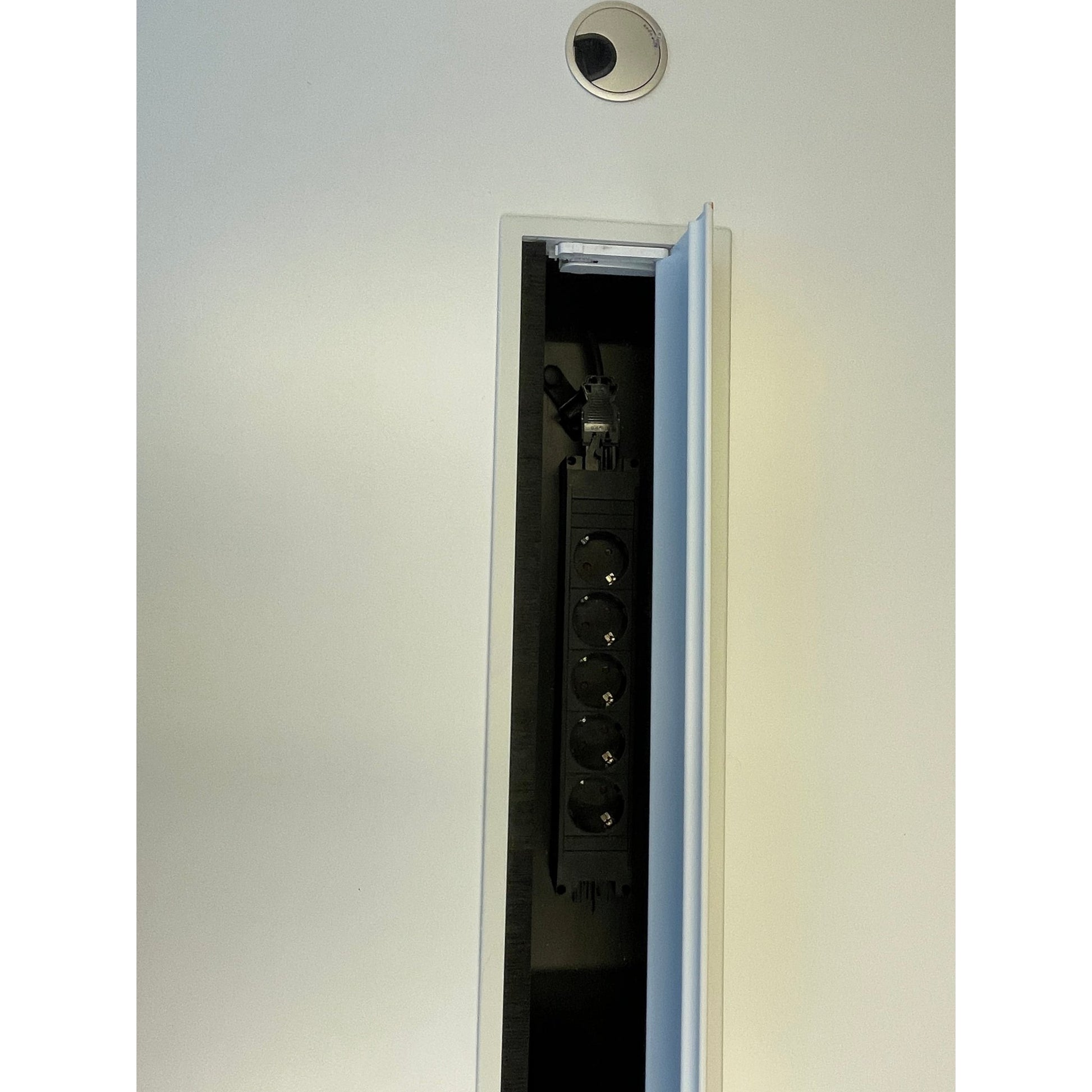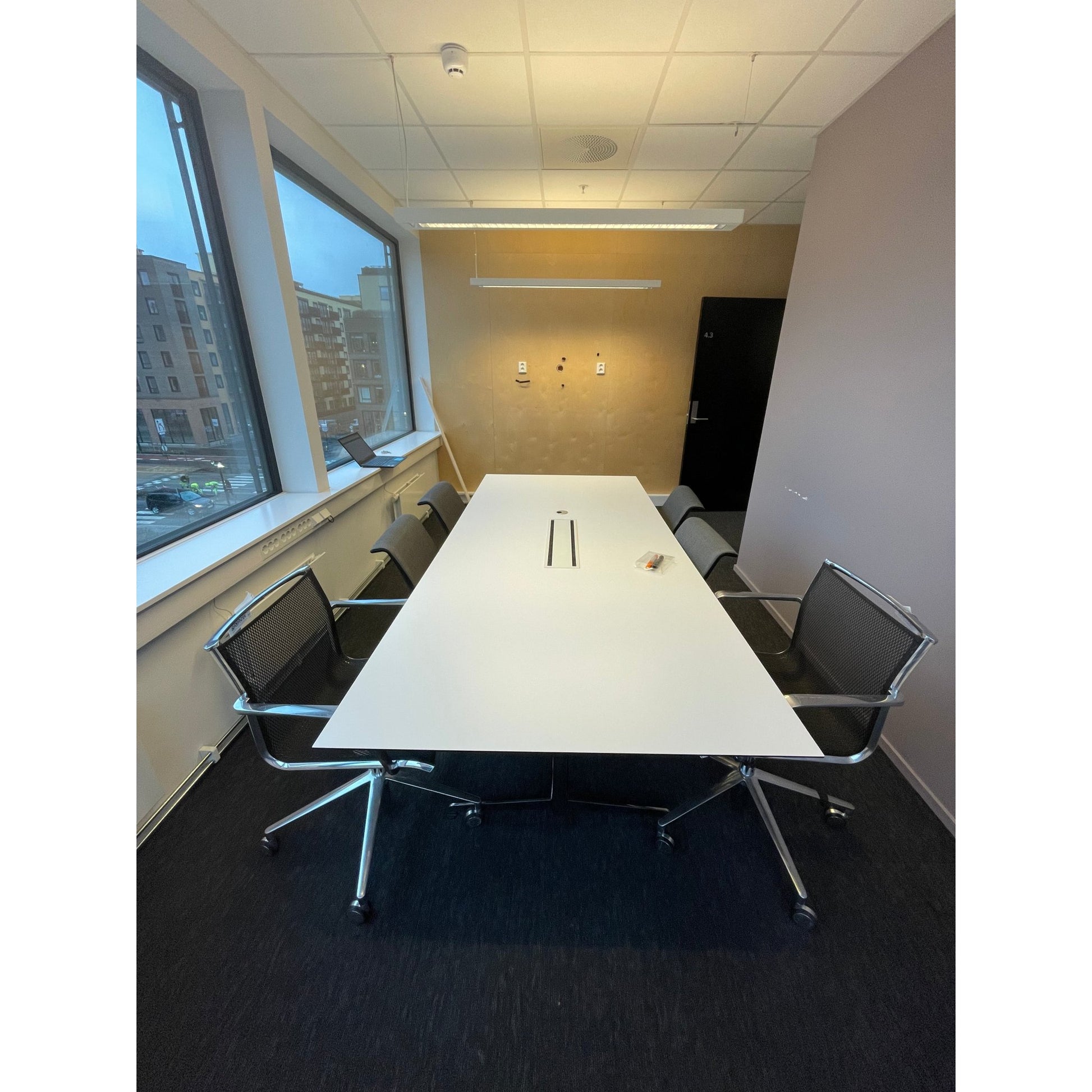 Hvitt møtebord er et elegant og funksjonelt møbel som passer perfekt til kontor og møterom. Med sin rene, hvite overflate og sorte kant, kombinert med stilige krom ben, gir det et moderne preg til ethvert kontormiljø.