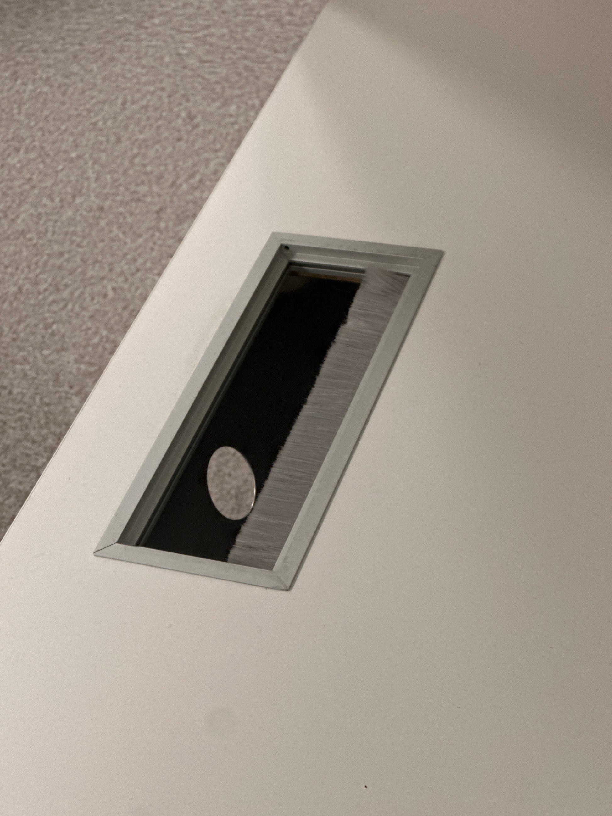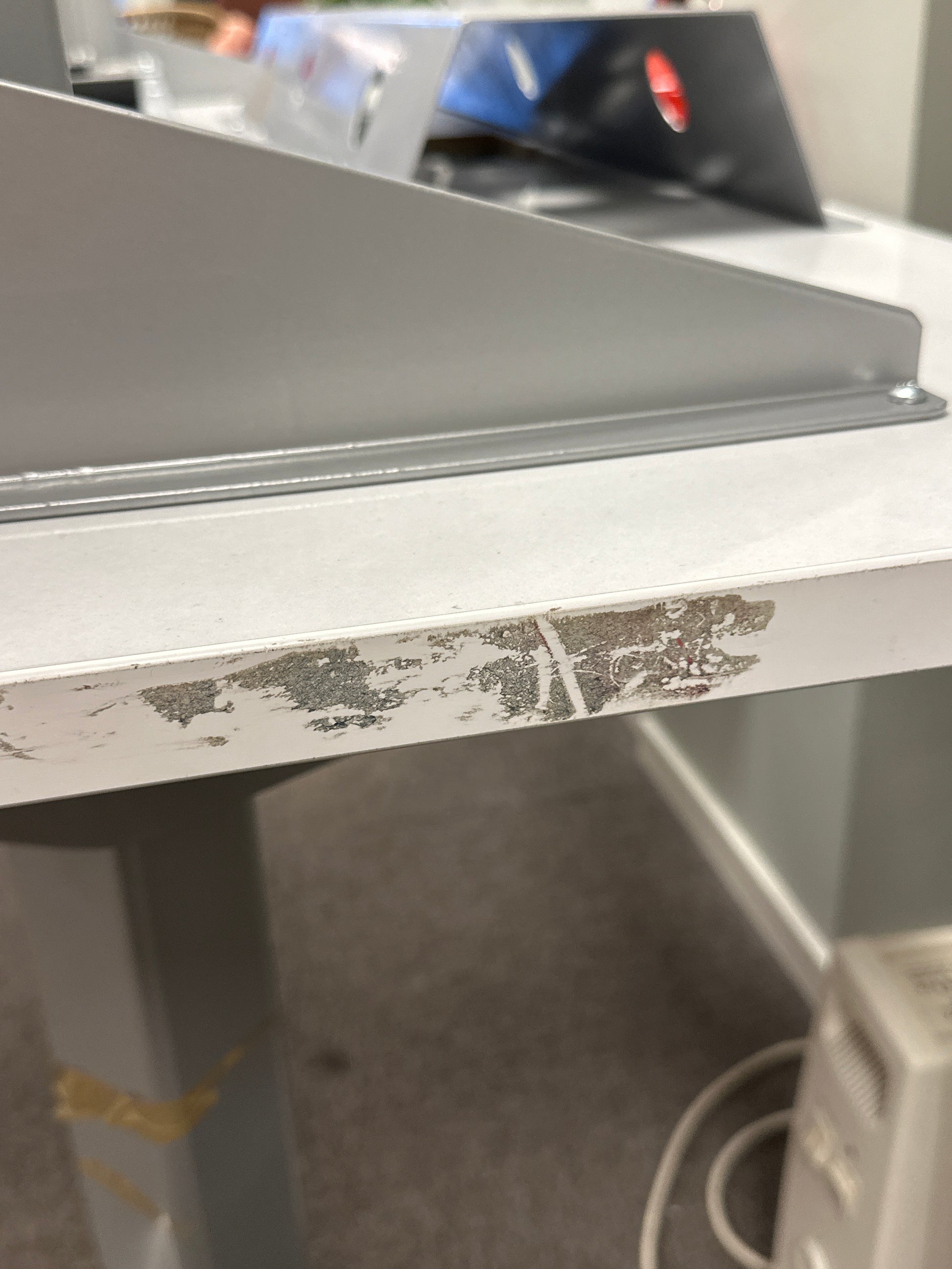 Skrivebordet har noen bruksmerker langs kanten til bordplaten, og mangler lokk til kabelhullet. Til tross for disse smådefektene er skrivebordet i god stand og tilbyr fortsatt god funksjonalitet for daglig bruk.