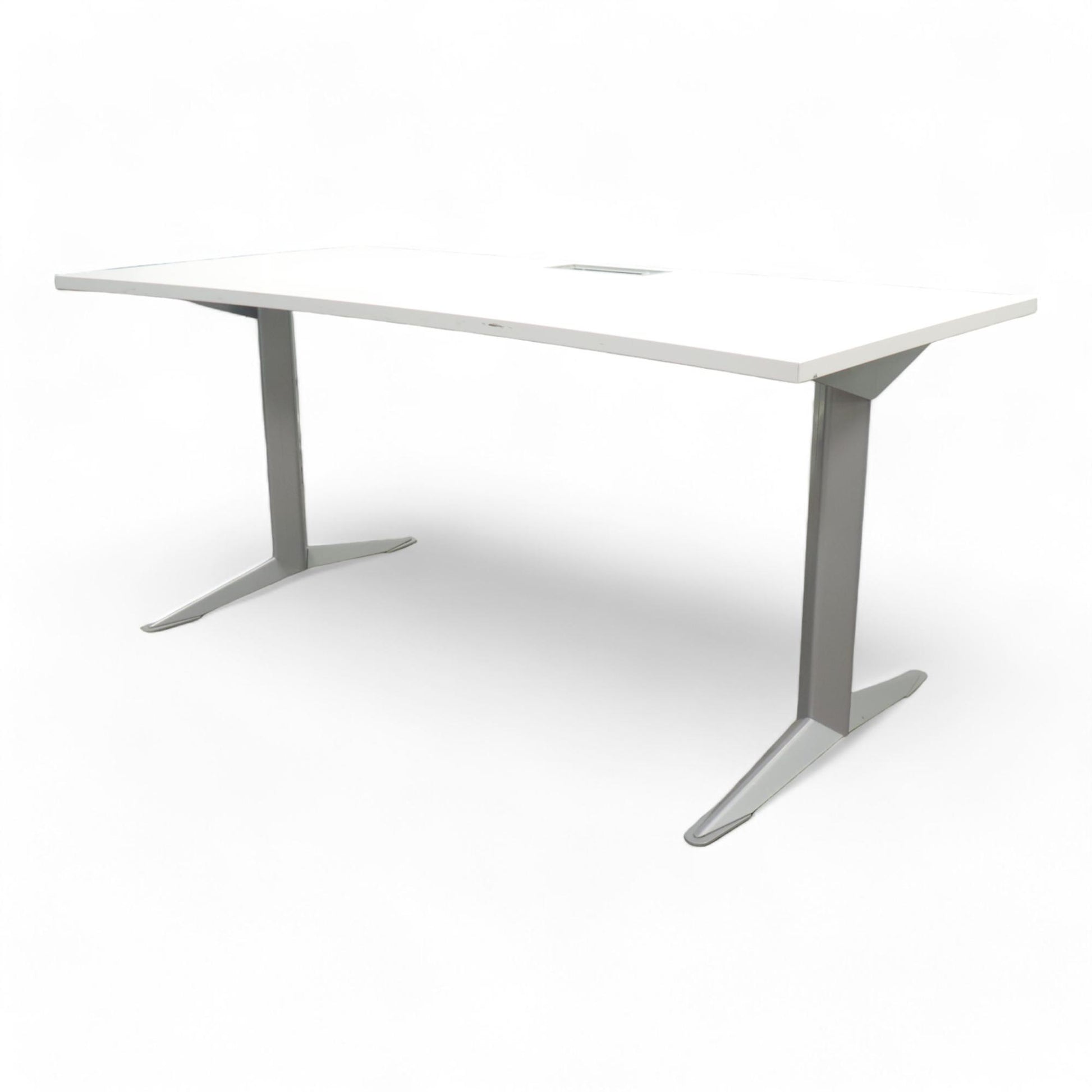 Stilrent hvitt skrivebord med grått understell og praktisk kabelluke. Det minimalistiske designet gjør dette skrivebordet perfekt for både kontoret og hjemmet, og det tilfører en moderne touch til ethvert rom.