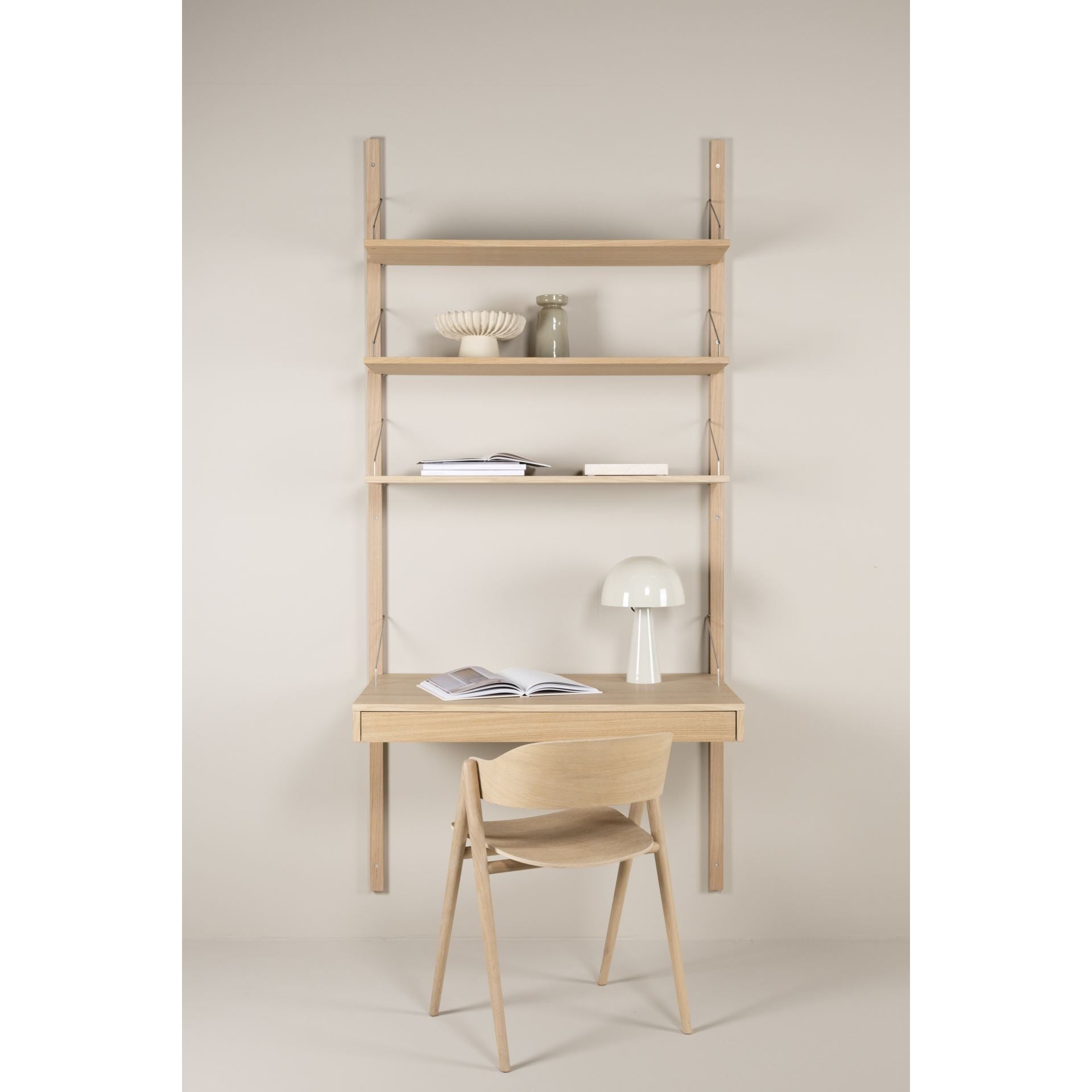 Iben hyllekombinasjon er et stilrent hyllesystem som tilbyr praktisk oppbevaring og et tidsriktig uttrykk. Den består av 2 lange veggfester, 3 hylleplater, og en skrivebordsplate med skuff, og passer perfekt til ethvert rom i hjemmet ditt, fra stuen til hjemmekontoret.