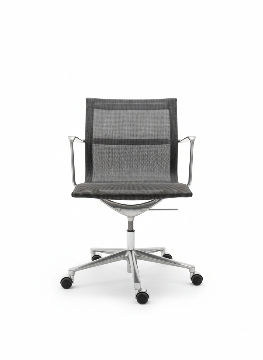 Moderne møteromsstol fra ICF med et stilrent og funksjonelt design. Denne stolen er trukket i slitesterk svart mesh, noe som sikrer god ventilasjon og komfort selv under lange møter. Den har et elegant understell i blankt stål samt armlener, noe som gir ekstra støtte og stil. Stolen er svingbar og mobil med sine praktiske hjul, noe som gjør den ideell for bruk i møterom, kontorer og konferanser.