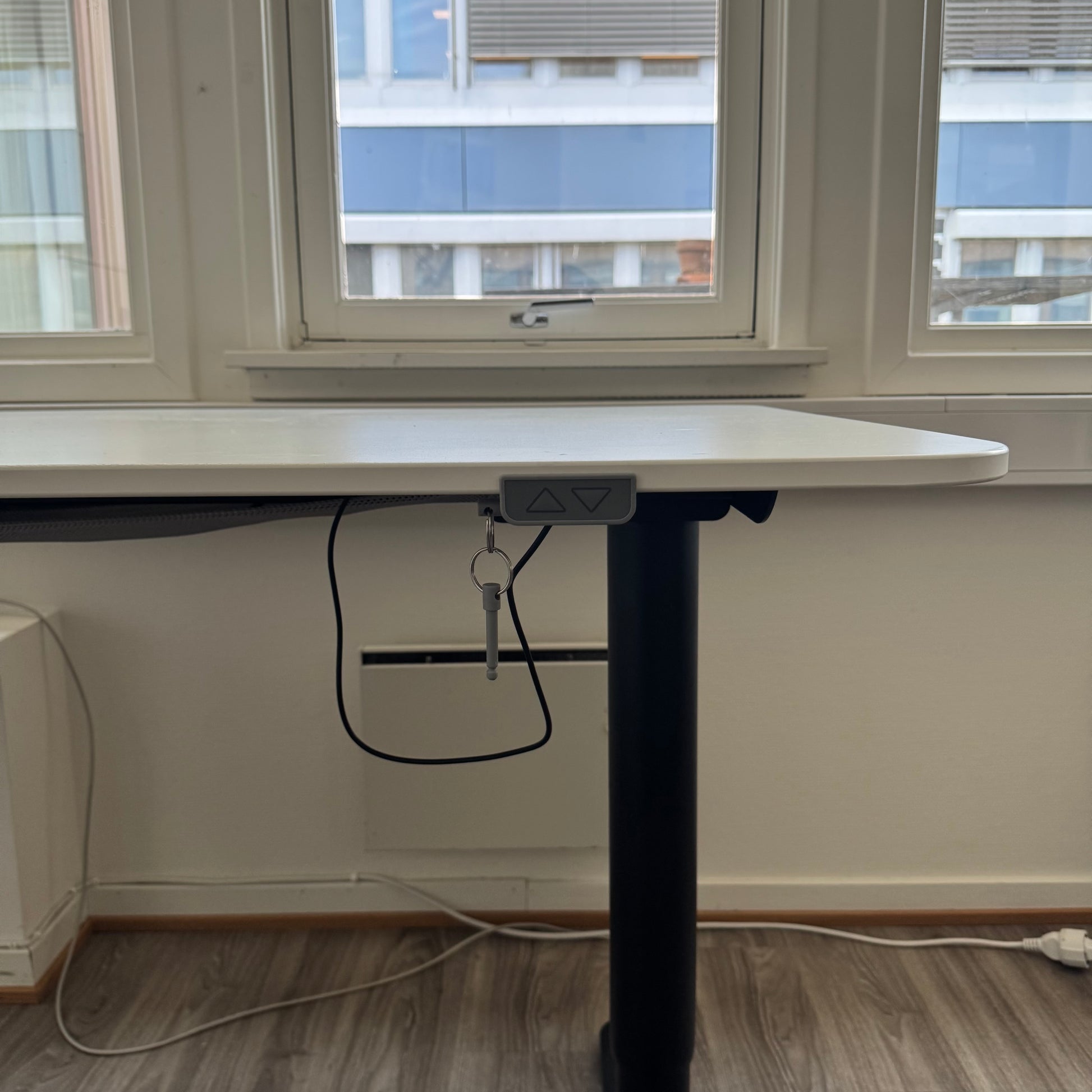 Elektrisk hev/senk Bekant skrivebord fra IKEA med et stilrent og funksjonelt design, med en robust bordplate i hvit farge og en solid svart ramme. Dette skrivebordet tilbyr enkel høydejustering for å tilpasse arbeidsstillingen, perfekt for både sittende og stående arbeid i hjemmekontor eller arbeidsmiljø.