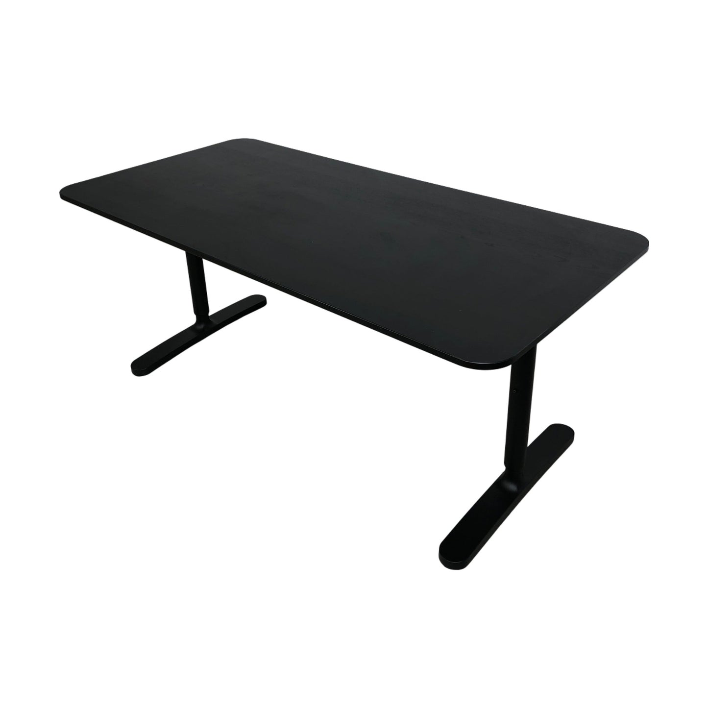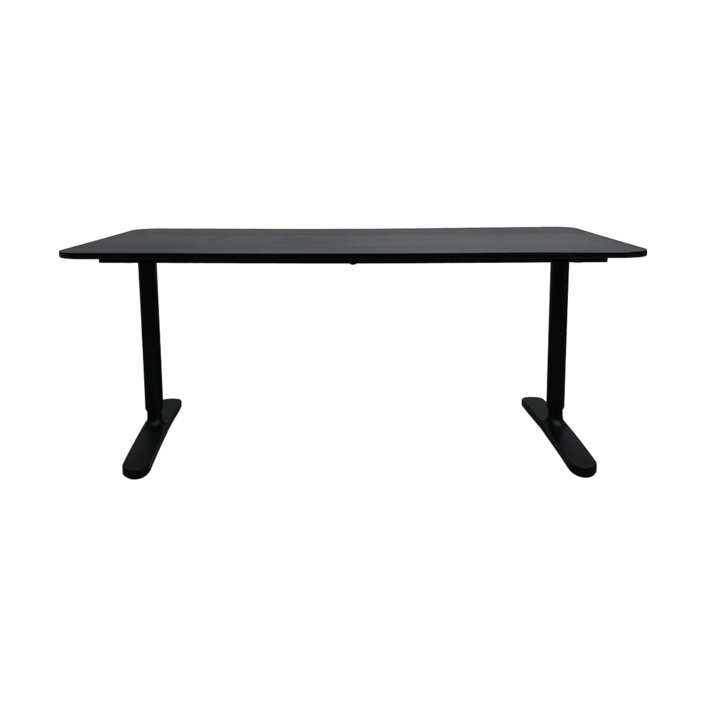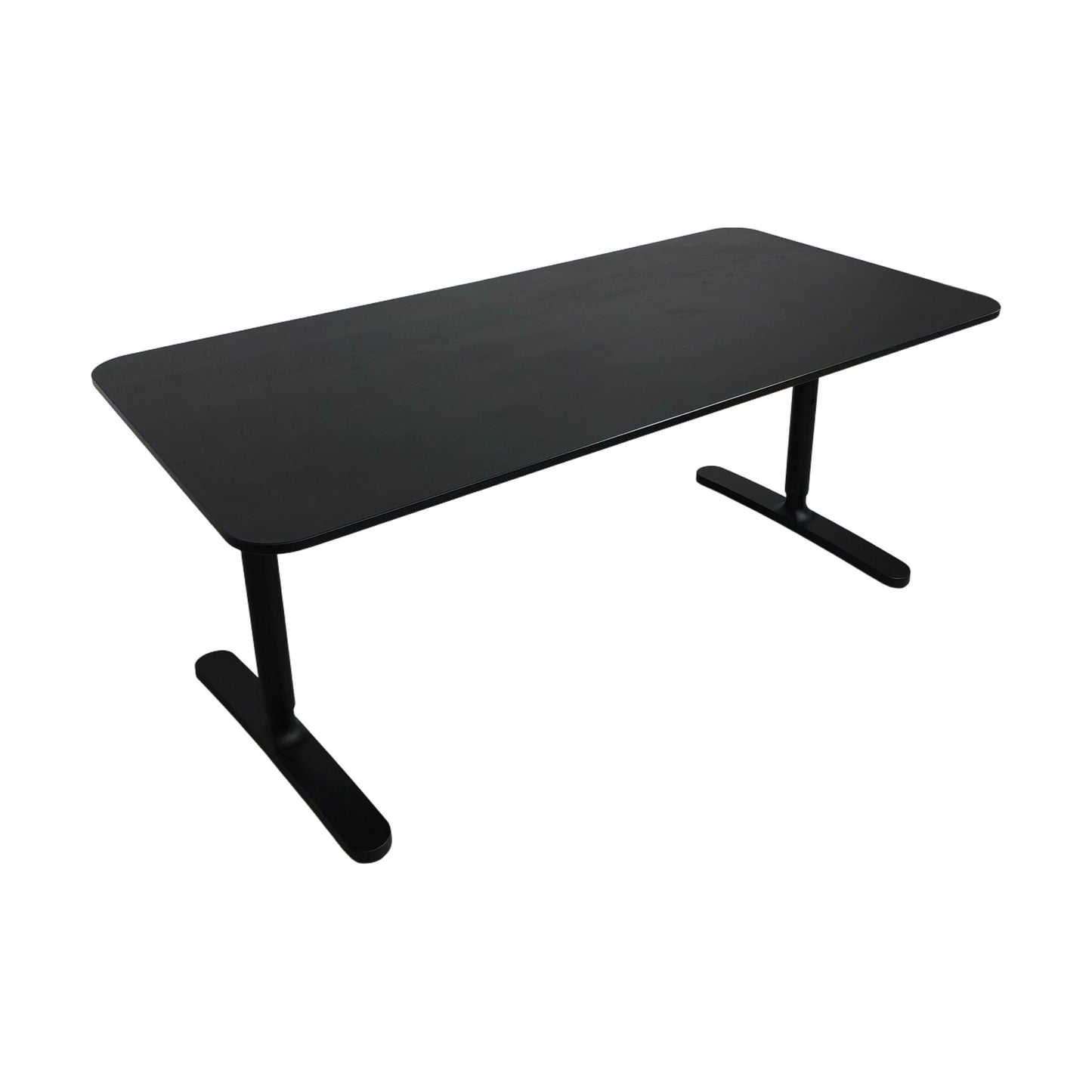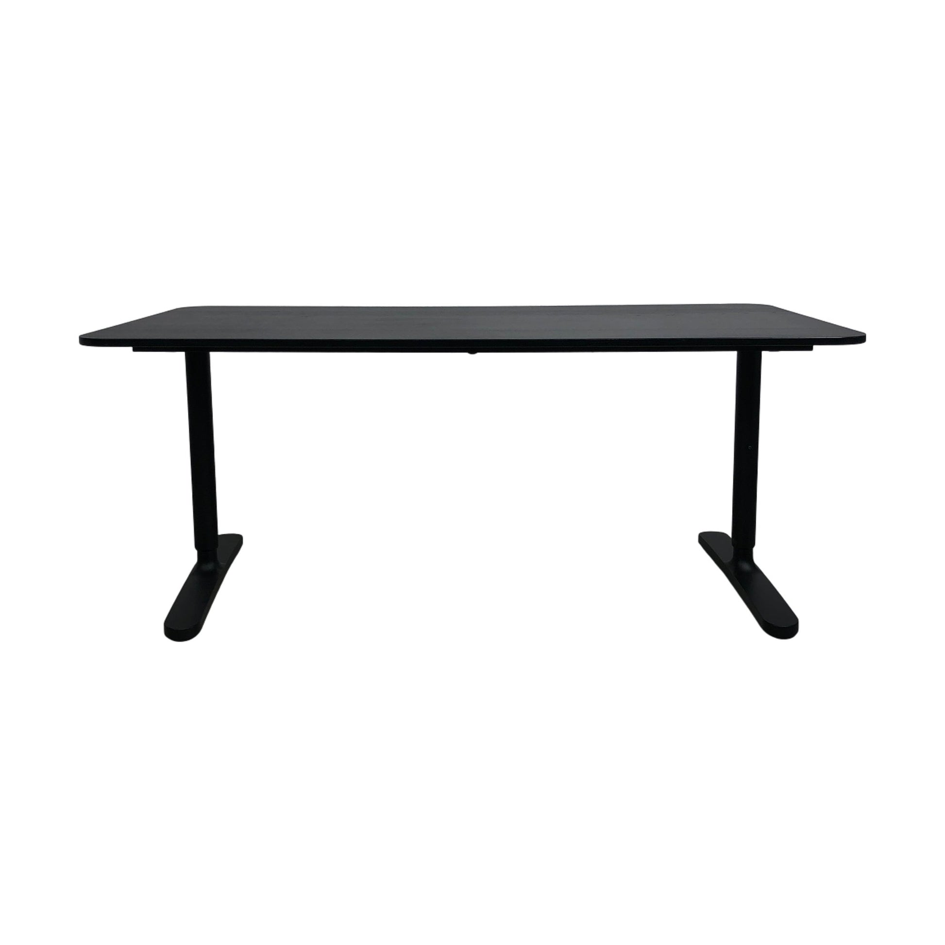 Skrivebord fra IKEA Bekant-serien i stilren helsort utførelse. Bordet har en robust bordplate som gir en solid arbeidsflate, og metallbenene sikrer stabilitet. Dette skrivebordet er ideelt for både hjemmekontor og arbeidsplasser.
